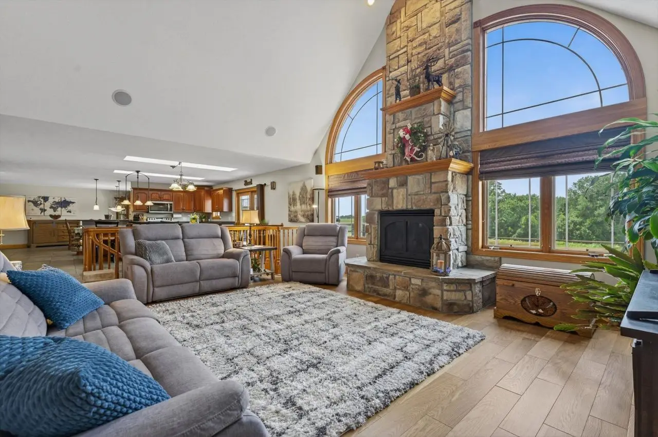 Sitting on 14 acres, this modern ranch with Craftsman flair features, vinyl shake and stone siding, cedar accents, and a welcoming arched entry with a 9x24 covered porch. Inside, enjoy a main floor office, spacious kitchen and dining area, and a vaulted 15 living room ceiling with a gas log fireplace. The 15x20 primary suite includes a private deck, updated bath, and oversized walk-in closet. A spacious 2nd bedroom and full bath. The finished lower level offers a large family room, kitchenette, two bedrooms, full bath, and poolside half bath with changing area. Outside features 2 new composite decks, one is a private deck from the Primary bedroom the other is off the eating area both have beautiful views of the acreage and wildlife that abounds. a 20x40 inground pool, covered patio wit a new hot tub, impressive boulder retaining wall, and 40x60 barn with 2 oversized doors and a 15 sliding door, cement floors and electric. There is a mixture of land, some flat, some wooded and some lowland. Wood boiler heat or propane.