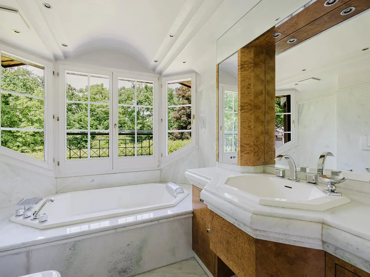 Situated in an unspoilt environment, just a few minutes from the center of Geneva, this remarkable property boasts almost 900 sqm of living space, set in approx. 4,500 sqm of wooded grounds. From the moment you enter, the generous volumes and flowing layout of the reception rooms create a welcoming atmosphere. Several living rooms with fireplaces offer different living spaces, bathed in natural light and opening onto the garden and swimming pool. Upstairs, the sleeping quarters comprise five large suites, some with fireplaces or balconies, offering each guest a comfortable and refined private space. The lower level, also on the garden level, is dedicated to well-being and relaxation. Here you'll find a spa area, gym, massage room, wine cellar and a large garage for several vehicles. Outside, the swimming pool blends harmoniously with the terrace, which can also be accessed from an oriental-style lounge designed to prolong moments of calm and conviviality. Discreet, rare and elegant, this property offers incomparable quality of life in one of Geneva's most sought-after areas on the right bank.