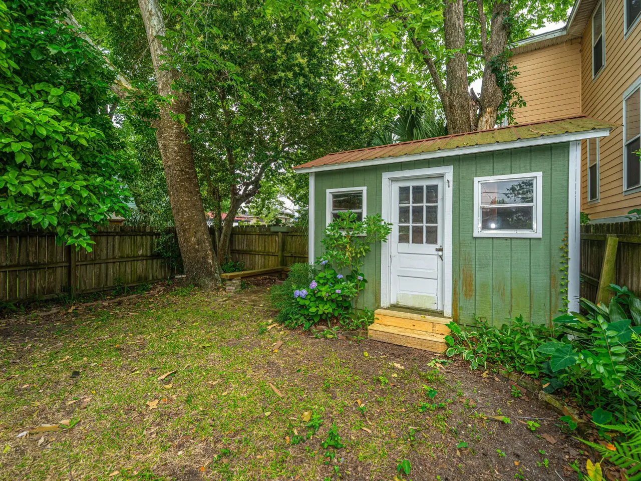 Nestled in the heart of Charleston's historic Westside, this elegant Charleston Single home seamlessly blends timeless charm with thoughtful updates. Boasting three generous bedrooms and two full baths, this classic residence welcomes you with gleaming wood floors, detailed crown molding, and abundant natural light throughout. The inviting living room features a cozy fireplace, while the formal dining room, also with its own fireplace, sets the stage for memorable gatherings. The renovated kitchen offers modern functionality with a touch of Southern grace. The kitchen is a true showpiece, featuring walls and ceiling crafted from repurposed wood salvaged from the home- offering a warm, authentic nod to the past while embracing modern functionality. All three spacious bedrooms are tucked away upstairs for added privacy, with the primary opening to the iconic double piazzas that overlook the quiet street and lush backyard. It also has its own fireplace, an inviting retreat! A durable and stylish metal roof adds long-term peace of mind and architectural appeal. Step into the beautifully landscaped courtyard, where Old Charleston brick, a raised deck, and a serene seating area create a perfect outdoor retreat. Mature flora, a fruiting grapefruit tree, and a charming shed add character and convenience to this enchanting property. This is Charleston living at its finest. Schedule your showing at this classic home today.