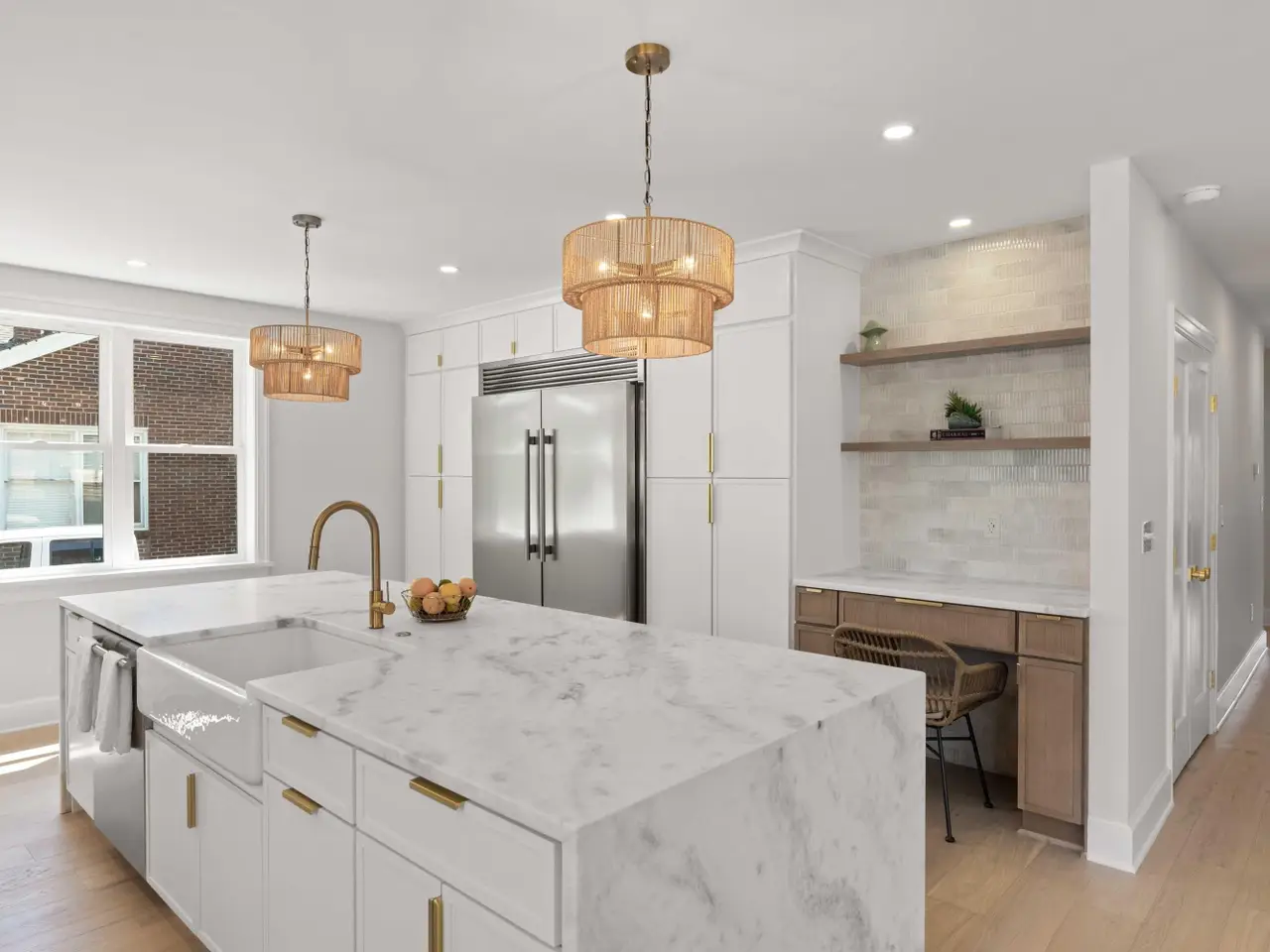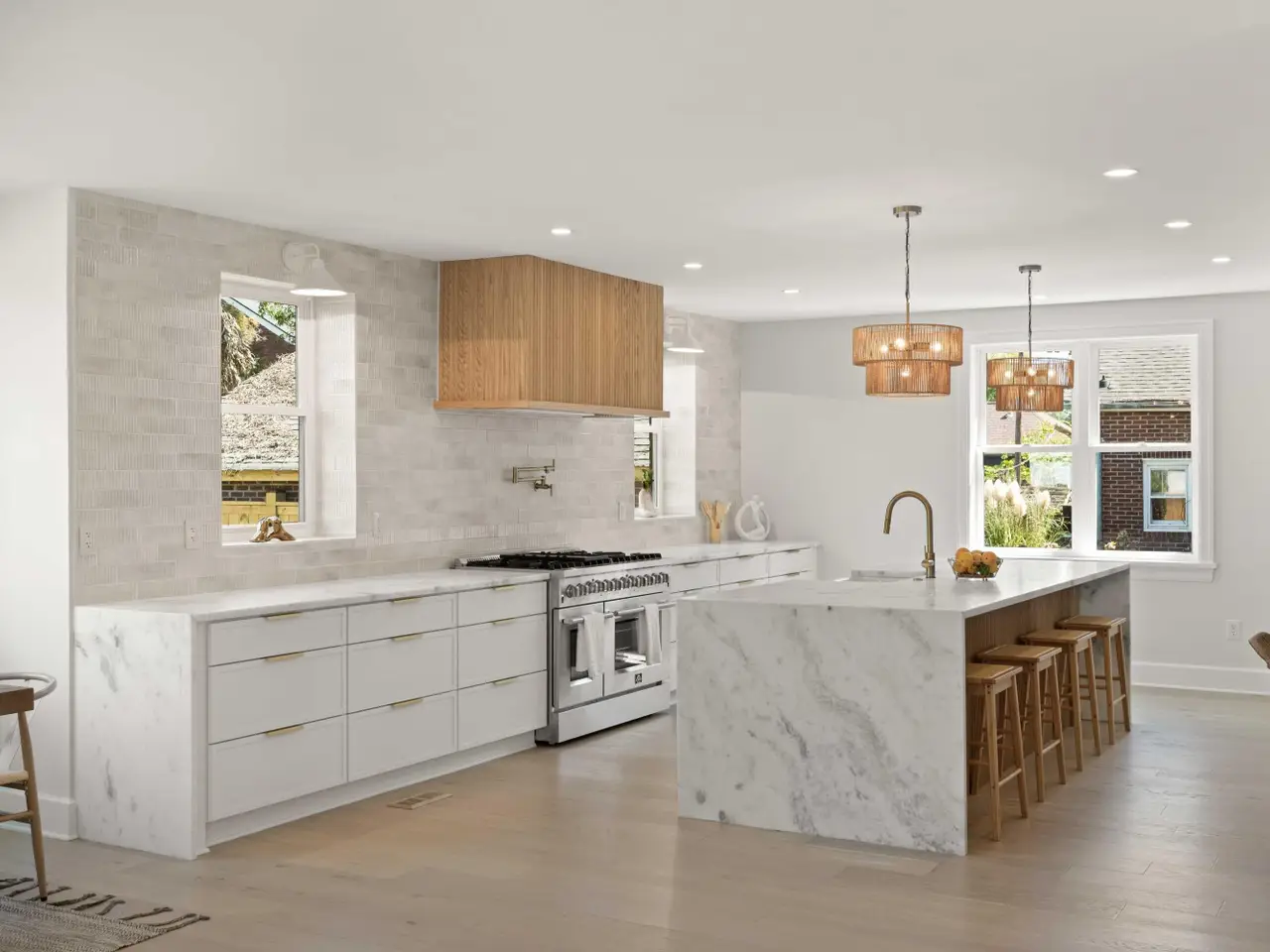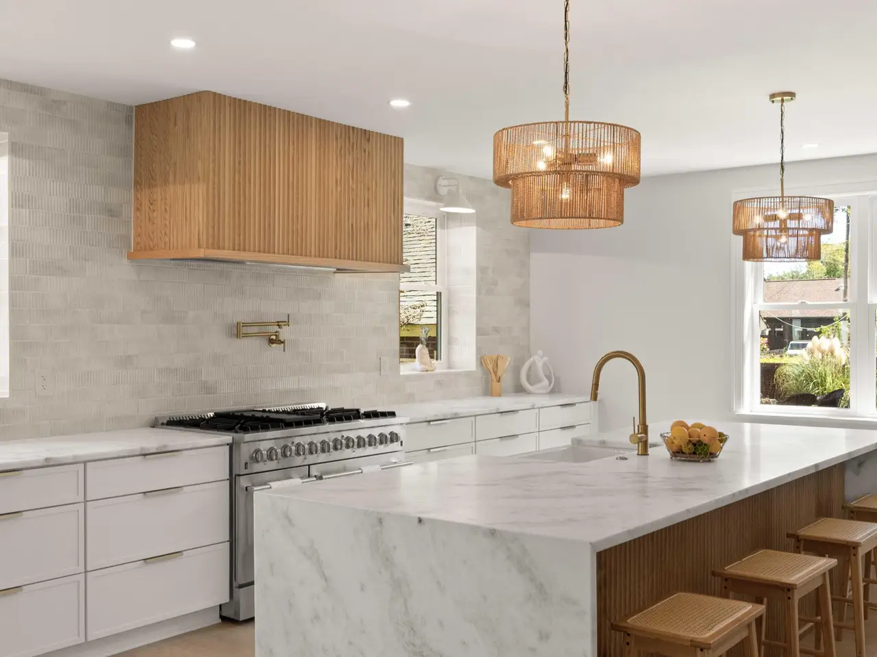 Marble waterfall kitchen island
