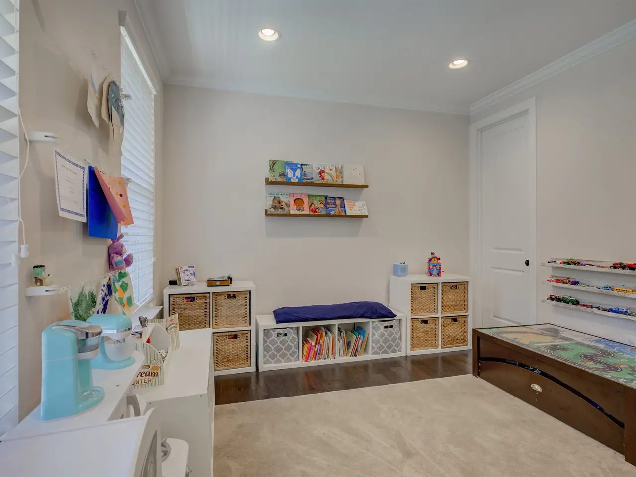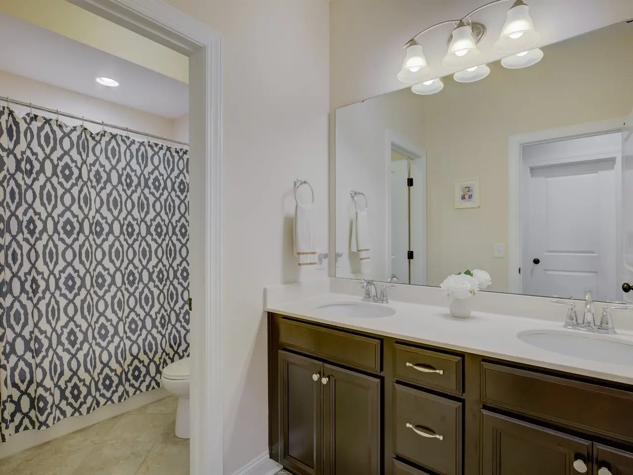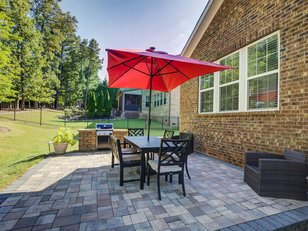 Located in the exclusive gated community of Bear Creek within the amenity-rich Palisades, this home offers the perfect balance of elegance, comfort, and country club living. A welcoming rocking chair front porch opens into a grand foyer, where a private French door study sits opposite the formal dining room. The elegant dining room showcases a coffered ceiling and wainscoting, details that carry down the hall into the great room. Rich hardwood floors connect the open-concept main level. A butler's pantry with a beverage refrigerator leads to the gourmet kitchen, featuring espresso cabinetry, a large prep island, granite countertops, pendant lighting, a gas cooktop, and a wall oven. The spacious great room is anchored by a gas fireplace and filled with natural light. The breakfast area opens to a screened porch, perfect for year-round enjoyment. Outside, enjoy a private wooded and fenced backyard complete with an expansive paver patio, built-in firepit, and in-ground irrigation. The main-level primary suite is a true retreat, featuring a coffered ceiling, a spa-like bath with a soaking tub, a glass-enclosed shower, dual vanities, and a walk-in closet. Upstairs, four bedrooms include one with a private bath, two sharing a hall bath, and a fifth expansive bedroom that could also function as a fantastic bonus room. A 2-car garage plus a separate 1-car garage provide ample parking and storage. Bear Creek residents enjoy a private gated enclave while also accessing The Palisades' incredible lifestyle amenities: homeowners' clubhouse, fitness center, outdoor pool, pickleball and basketball courts, and miles of scenic walking trails. Optional golf and social memberships at The Palisades Country Club elevate the experience, offering championship golf, dining, and events just minutes from home.