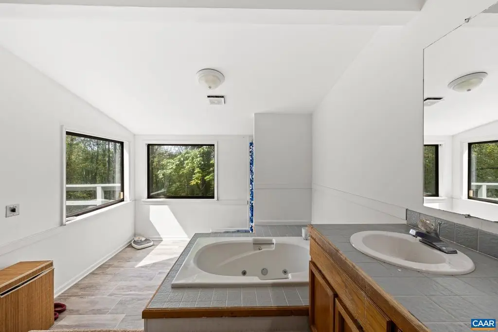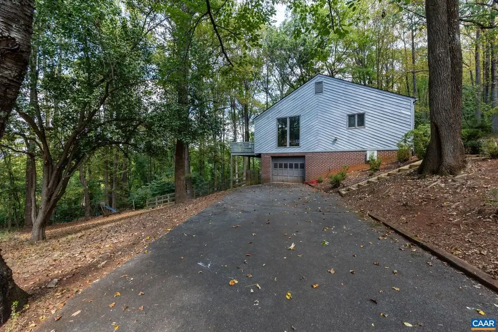 Nestled in the desirable Ashcroft neighborhood, a unique mountainside setting located minutes to Downtown, I-64, hospitals, and shopping. Natural light abounds in this stunning, spacious contemporary on 1.5 private acres, with expansive decks framed by seasonal Blue Ridge views and mature trees. Fenced yard is perfect for pets. This 4BR/3BA home features soaring ceilings, and an open floor plan with dramatic stone fireplace in the living room. The chef in your family will enjoy the kitchen with its large island ideal for gathering and great for entertaining. The primary bedroom suite evokes the feel of a treehouse retreat, featuring large walk-in closet, luxury jacuzzi bath, and its own private deck for enjoying your morning coffee among the treetops and mountains. Generously sized bedrooms, with large closets and ceiling fans. The lower level features a large family room with built-in shelves, ideal for a theater or playroom, the fourth bedroom or guestroom, and full bath with laundry. Expansive two-car garage with cabinets and workspace. With access to Ashcroft's miles of walking trails, pool, tennis, and clubhouse, this home offers the best of mountain living with the convenience of town just minutes away.
