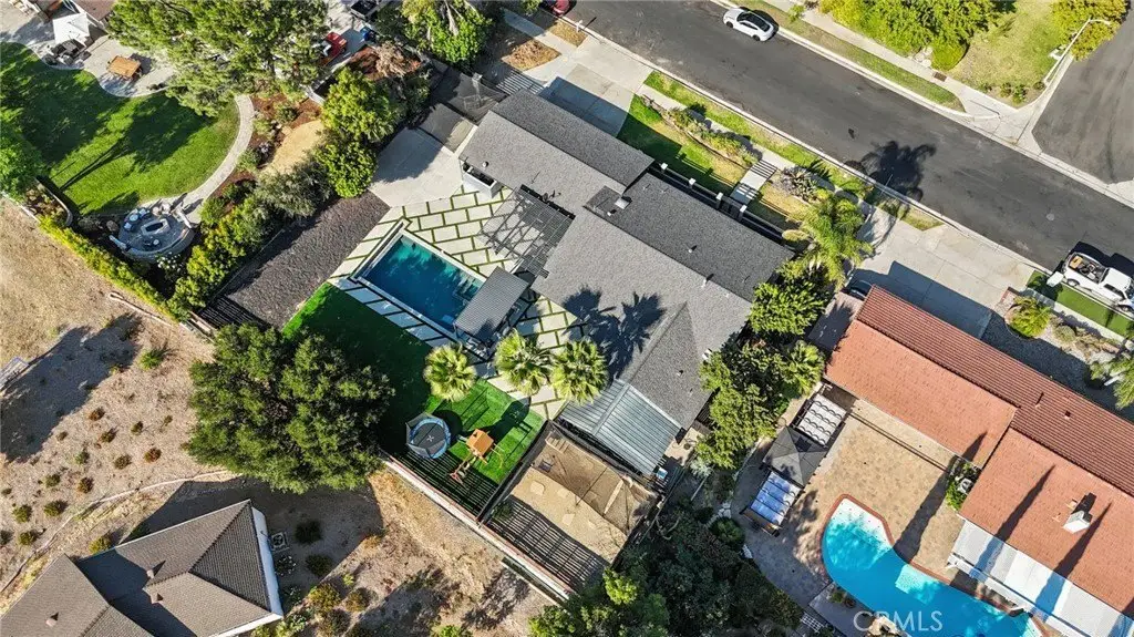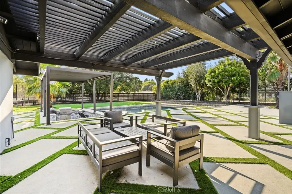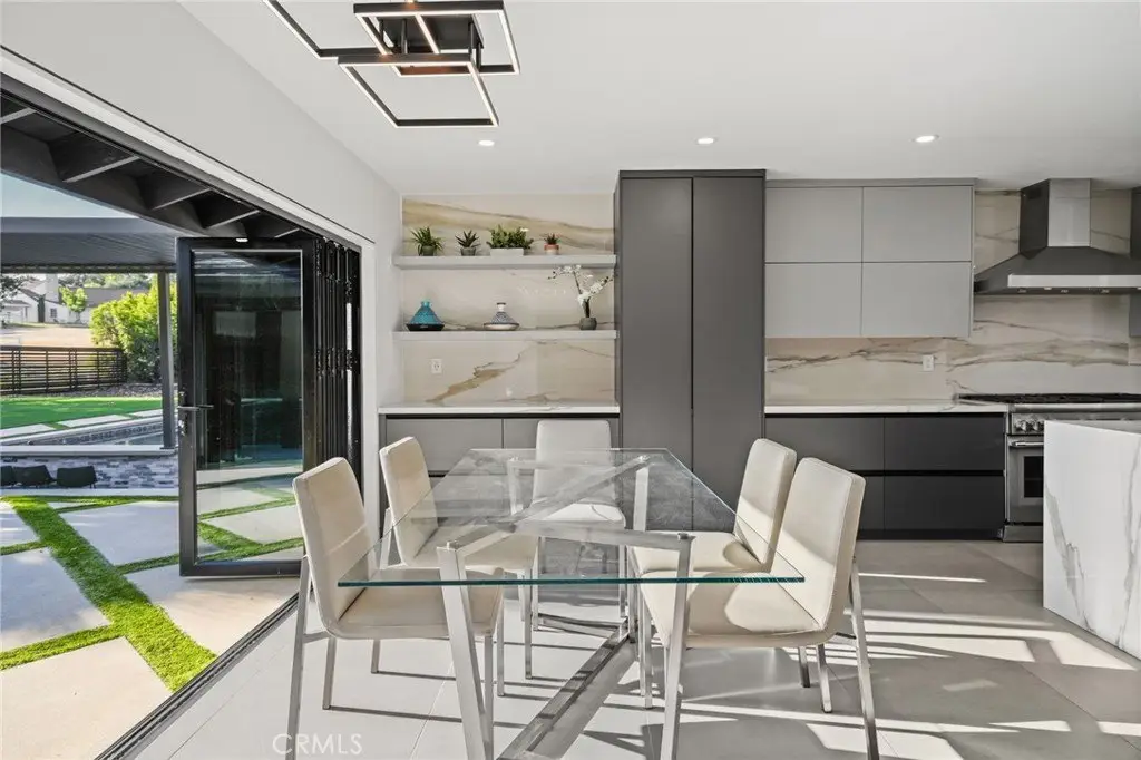 Picture-Perfect Modern Estate in Prime Chatsworth Neighborhood with ADU Potential! Welcome to this sprawling, single-story showpiece located in one of Chatsworth's most sought-after neighborhoods. Designed with a sleek, modern aesthetic, this minimalistic contemporary residence showcases minimalist interior finishes and exceptional craftsmanship throughout. Step into a seamless open floor plan where the living room impresses with a custom TV wall featuring built-in cabinetry, a dramatic slab backdrop, and a sleek electric fireplace. A full wall of windows floods the space with natural light, beautifully complementing the European grey tile floors, and modern finish throughout. The space flows effortlessly into a chef’s dream kitchen outfitted with a massive waterfall island, two-tone matte lacquer cabinetry, quartz countertops, and top-of-the-line Thermador appliances, including a built-in fridge and open shelving. Accordion-style glass pivot doors blur the lines between indoor and outdoor living, opening wide to reveal a resort-style backyard. Set on a massive, usable lot, the outdoor space is your private oasis, complete with modern landscaping, a sparkling pool and spa, sunken fire pit, built-in barbecue center with a Big Green Egg, and HUGE turf and concrete areas. The lot also includes RV access and ample space for an ADU. A dedicated pet-friendly area with privacy fencing ensures your furry friends have their own secure sanctuary. This 4-bedroom, 2.5-bathroom home features a luxurious primary suite reminiscent of a five-star resort. Enjoy serene backyard views through retractable accordion doors, and unwind in the spa-inspired en-suite bathroom adorned with 24”x48” porcelain tiles, black-veined accents, a massive walk-in shower with dual rain showers, and his-and-hers vanities. A spacious walk-in closet completes this dream retreat. Additional highlights include: Designer ocean-blue tiled guest bathroom with floating vanity and tub/shower combo. A private half bath in the fourth bedroom, perfect for guests or office use. Bonus family/media room adjacent to the kitchen, ideal for movie nights. 3-car garage with window views into the home and direct access to the living area. Whether you’re entertaining, relaxing, or envisioning future expansion with an ADU, this home delivers on every level. Don’t miss the opportunity to own this exceptional property in one of the Valley’s most desirable communities!