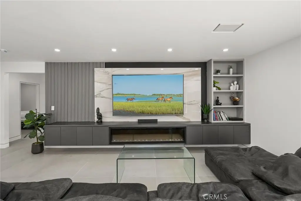 Custom TV wall with built-in cabinetry and sleek electric fireplace