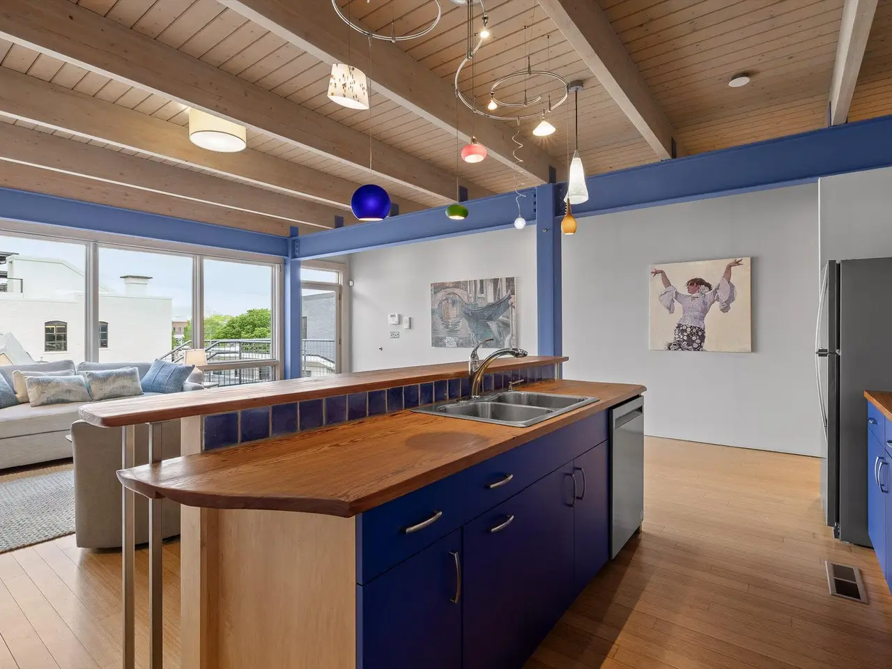 Facing Williams Street, the three-story facade has an industrial feel with a limestone and zinc exterior and a dramatic series of 10-foot doors opening into the vaulted gallery. The second level is a great room with a wall of windows and full bath. The residence is on the top floor and has an open living space with floor-to-ceiling windows highlighting the mountains.