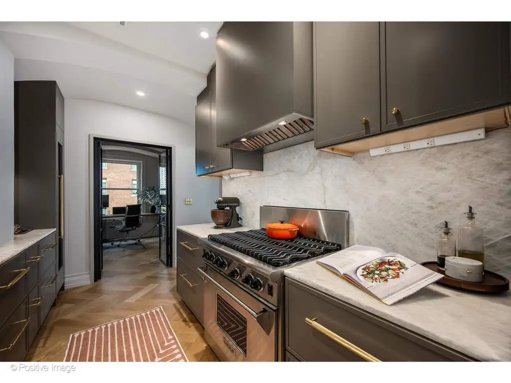 This extraordinary top-floor residence has been completely reimagined in a meticulous 2024 transformation, resulting in a bespoke masterpiece that cannot be replicated. From the moment you enter, it is evident that every detail-every finish, every material-was selected with the highest level of intention and refinement. White oak herringbone floors flow seamlessly throughout, complemented by exquisite custom millwork in the baseboards and crown moldings, creating a timeless architectural frame. In the living room, a dramatic skylight cascades natural light across the space, while a hand-crafted marble mantle encases a wood-burning fireplace, an elegant centerpiece for sophisticated gatherings. The adjoining dining area is anchored by a sculptural Corbett chandelier, setting the tone for elevated entertaining. The chef's kitchen is nothing short of spectacular: iceberg quartzite counters, bespoke cabinetry, and brass and bronze hardware harmonize with a suite of Sub-Zero, Wolf, and Bosch appliances, including a built-in wine cooler. Every switch, outlet, and handle has been thoughtfully upgraded to Buster + Punch, ensuring a cohesive, refined aesthetic. Just beyond, custom glass doors reveal a versatile bedroom currently curated as a home office, complete with a striking tropical Wenge live-edge desk. The jewel-box powder room delights with a custom vanity, Graff fixtures, and statement wallpaper, while a serene den houses bespoke closets, including a concealed laundry with Electrolux appliances and additional storage. The primary suite is a private sanctuary, lavish and light-filled...with custom built-ins, and an extraordinary walk-in closet of glass and steel illuminated by a Tom Dixon fixture. The dual ensuite baths are a study in indulgence, featuring Palmer Industries brass fixtures, Lacava sinks, and luxurious travertine and marble floors. Every mechanical element of the residence was upgraded in the renovation, including new plumbing and electrical systems. A sculptural spiral staircase leads upward to what is arguably the finest private terrace in the Gold Coast. Here, a fully integrated indoor sunroom with bar, refrigerator, and freezer seamlessly transitions to an expansive rooftop oasis. European shade systems define a partially covered lounge area, while a sun-soaked expanse invites relaxation on designer furnishings-all included. A dedicated dining terrace boasts outdoor kitchen with grill, refrigerator, extensive counter space, and storage. Privacy walls, a Sonos sound system, and a professional irrigation system complete this unrivaled alfresco experience, framed by iconic views of the Hancock, Gold Coast architecture, and shimmering lakefront. The residence is set within a building whose infrastructure has been fully revitalized, including new piping, boiler, tuckpointing, masonry, and the addition of a common roof deck. Perfectly positioned at 1255 N State Parkway, this one-of-a-kind home offers the best of city living-just moments from Oak Street Beach, Lincoln Park, and the world-class shopping, five-star dining, and cultural richness of Chicago's Gold Coast. A residence beyond compare. Welcome home.
