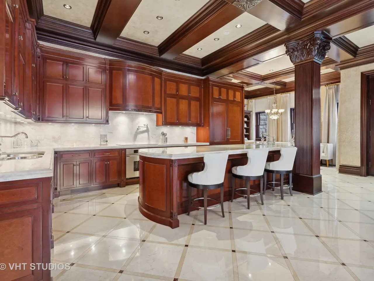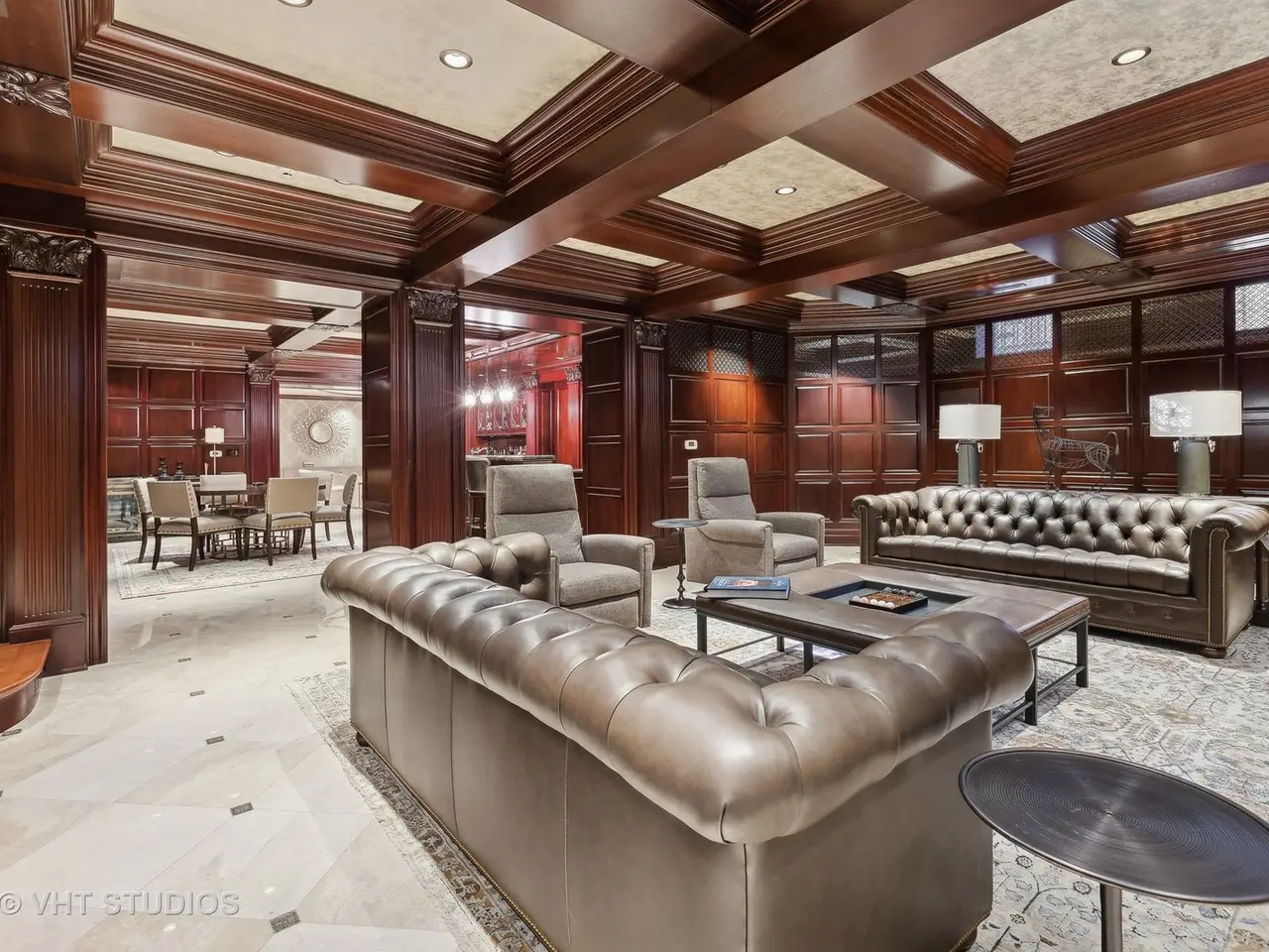 A rare piece of Chicago's history, the Thompson House at 915 N. Dearborn stands as one of the Gold Coast's original architectural treasures. Designed in 1888 by Cobb & Frost, the renowned architects behind the Newberry Library and University of Chicago, this grand residence was among the first to define the Gold Coast neighborhood after the Great Chicago Fire. For the next century, it was owned and used by the Scottish Rite. The property was meticulously restored by its current owner beginning in 2009, blending 19th-century grandeur with modern luxury. The Thompson House is now a nationally registered Historic Landmark. This masterpiece preserves its rich past while offering a remarkably livable floor plan where history, elegance, and everyday comfort coexist effortlessly. Constructed from solid red rock, this 5-bedroom, 4.2-bathroom home spans 13,400 square feet, with an additional 1-bedroom, 1-bathroom carriage house above the 3-car garage. This home showcases exceptional craftsmanship with one-of-a-kind finishes and details throughout. Some of the elements include a refurbished original mosaic floor, custom millwork, hand-carved marble fireplaces from Italy, and custom stained glass. Throughout the home, all wood features, including beams, doors, and trim, are custom made from solid Honduras Mahogany, with intricate touches such as paneling and carving. The staircase, also Honduras Mahogany, was hand crafted to mimic the home's original balusters. Modern features include an elevator servicing all levels, a Control4 system, integrated audio and speaker systems, smart HVAC controls, and full smart home capabilities, making this home as functional as it is beautiful. Enter the home to a large parlor paneled in mahogany. The details greet you right away - hand carved columns, custom stained glass windows and doors, marble floors imported from Turkey, and a hand carved marble fireplace. The adjacent great room is full of natural light from the large, curved windows and south and west exposures. The great room has earned its name sake with a Swarovski crystal chandelier, a hand-carved, book-matched onyx fireplace from Pakistan, and exquisite mahogany woodwork with in-wall cabinetry. Silk wall coverings and marble flooring add to the grandeur. On the opposite side of the foyer you will find the kitchen overlooking the walled courtyard with fountains and fireplace. The kitchen area features two dining areas, high-end appliances, a large island, custom cabinetry, and a laundry room tucked away. The second level landing showcases a stunning library framed by an intricate hand carved arch. You will also see the custom stained glass dome skylight up above. The second floor features the luxurious primary suite, complete with a wet bar, and en-suite bath, and a second bedroom or office with an en-suite bath. You will also find a screened in 3-season porch. On the top floor, there is a sitting room, three additional bedrooms, including two rooms sharing a Jack-and-Jill bathroom, and a third large bedroom with its own en-suite bath. The lower level is designed for relaxation and entertainment, featuring two seating areas, a bar, and a spa. The media area includes a hand-carved Italian Botticino marble fireplace and marble floors with bronze inlay. The galley bar offers an in-wall wine display, and the spa features a sauna, jacuzzi, steam suite, spa dressing rooms, a massage and zen room, and an additional laundry area. A Murano glass mural with an integrated waterfall and glass-blown ceilings add unique artistic elements rarely found in modern homes. Across the courtyard, you will find the cozy coach house, perfect for guests or additional living space. The home includes a heated 3-car garage. The Thompson House is more than just a home; it's a timeless work of art that embodies elegance, craftsmanship, and luxury living in the heart of Chicago.