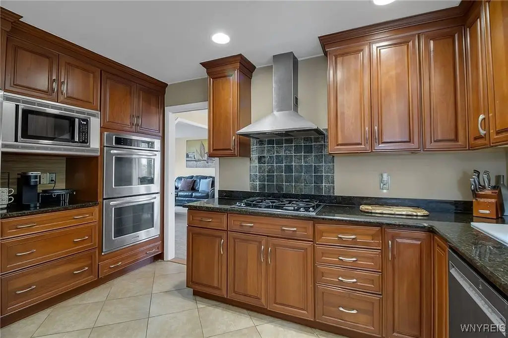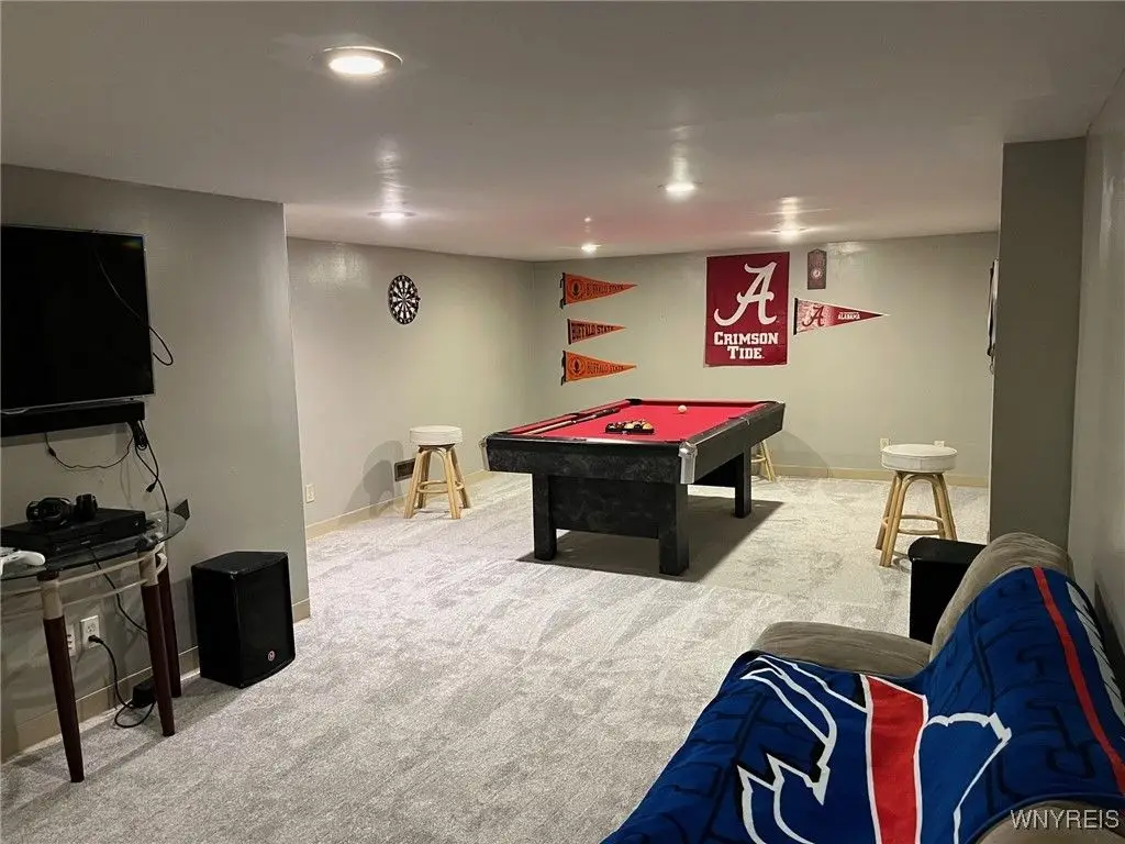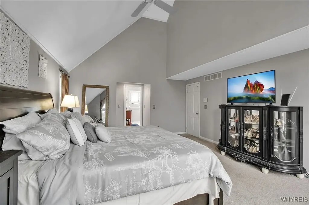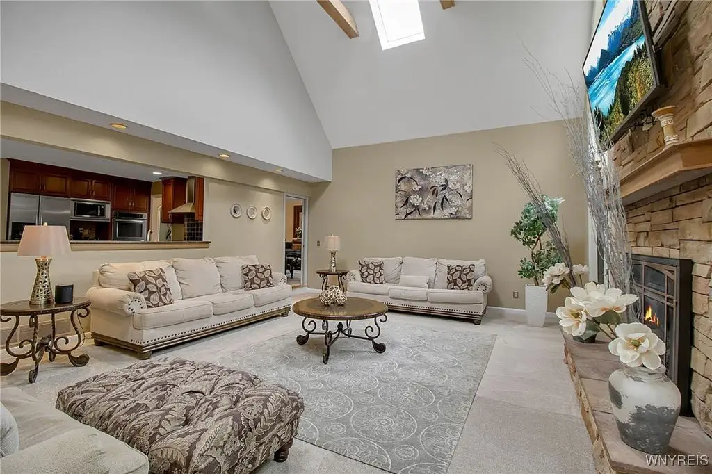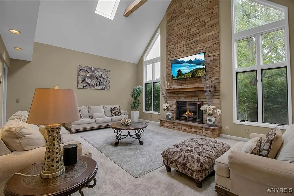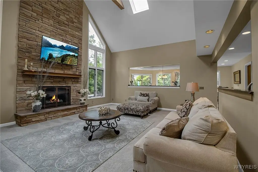 This stunning home features 5 bedrooms and 2.5 baths and is situated on a 1.1-acre cul-de-sac lot in the highly sought-after Loch Lea Estates, close to all conveniences. The large, welcoming foyer features custom railings on the staircase, adding an elegant touch and showcases the open floor plan. The kitchen boasts cherry cabinets, granite countertops, a breakfast bar, and SS appliances. Enjoy the sunroom/breakfast room or spacious eating area off the kitchen and which is enhanced with a beautiful copper tray ceiling. The family room features a soaring ceiling and a layered stone fireplace w/a gas insert. The formal living and dining rooms have new wall-to-wall carpeting (Aug '25). The den featuring newer wall-to-wall carpeting, custom-built-ins, and French doors is off the foyer. The ensuite includes a vaulted ceiling, new wall-to-wall carpeting (Aug '25), a lrg walk-in closet and a glamour bath with whirlpool tub, a shower stall, and granite counters. Additionally, there are 4 more generously sized beds, all w/new wall-to-wall carpeting that was just installed (Aug '25). The fabulous yard is complete w/an in-ground pool that includes a jacuzzi, cool deck surface around the pool, a privacy fence, and additionally a stamped concrete patio surrounding the expansive pool area. The large first-floor laundry/mudroom is accessible from the 3.5-car side-load garage. The partially finished LL rec room, features new wall-to-wall carpeting installed in Aug '25, is a great bonus area. Additional recent upgrades include a newer roof (2018), newer furnace and AC, and 2 new HWTs (2022). The home was repainted throughout and wallpaper was removed in several rooms. Additionally, popcorn ceilings were also removed in many rooms! This lovely home features beautiful natural light. Additional features include an irrigation system in front and back, an alarm system and a whole-house generator. Home is located in the highly rated Wmlsv School District! ADDITIONAL OPEN AREA ON THE LOT CAN NOT BE BUILT ON PER TOWN OF CLARENCE ZONING DEPT PER ORIGINAL MAPPING IN TOWN OF CLARENCE. NO DWELLING CAN BE CONSTRUCTED ON THE OTHER PORTION OF THE LOT. Delayed negotiations - Offers due on Fri, 8/29 at 11 AM.