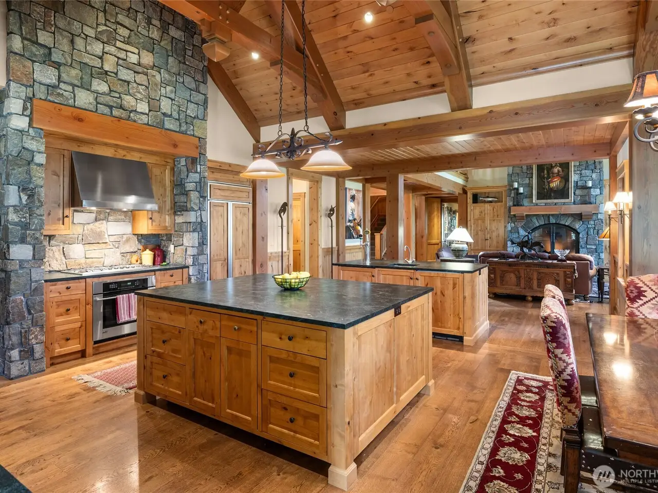 Floor-to-ceiling stone fireplace