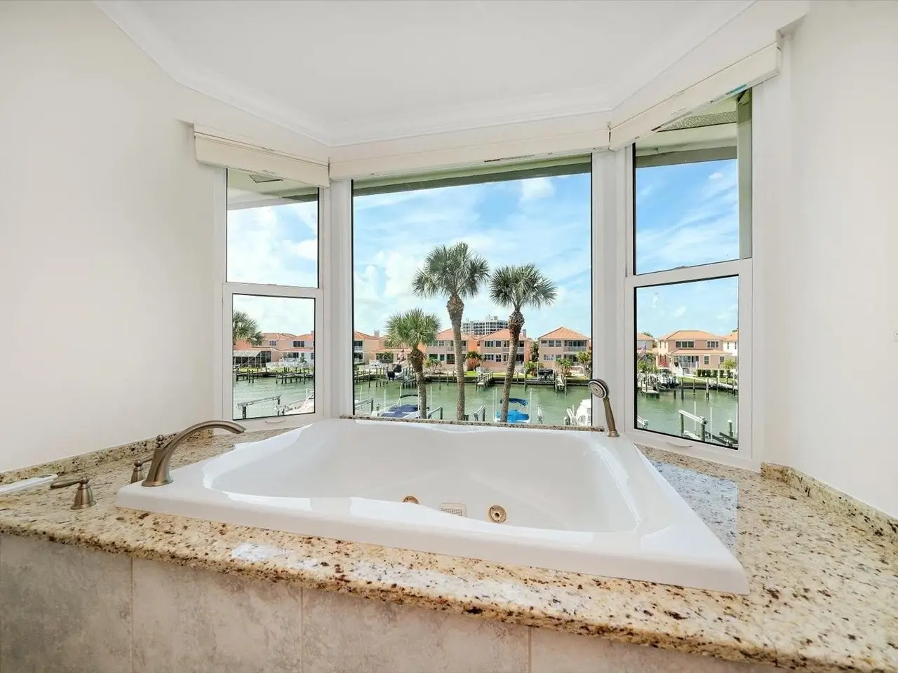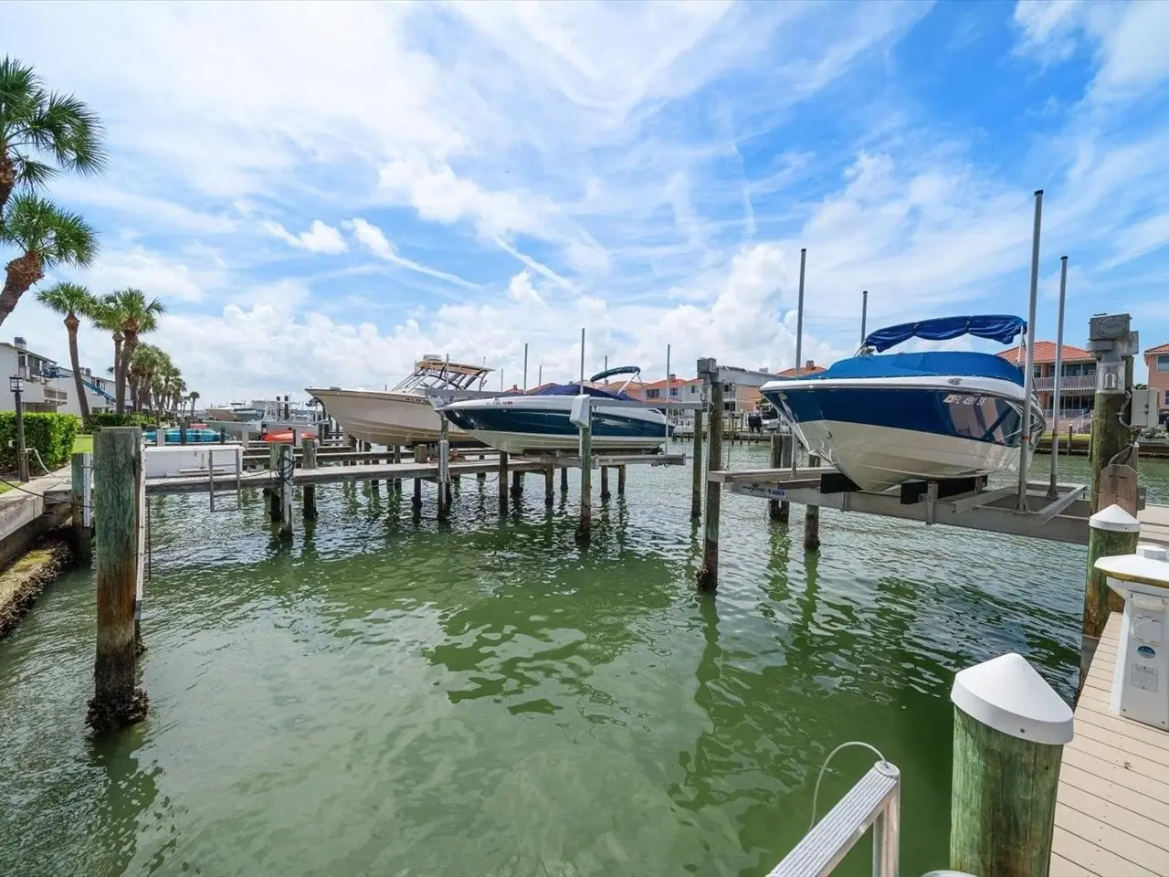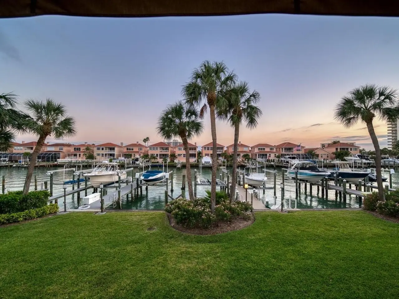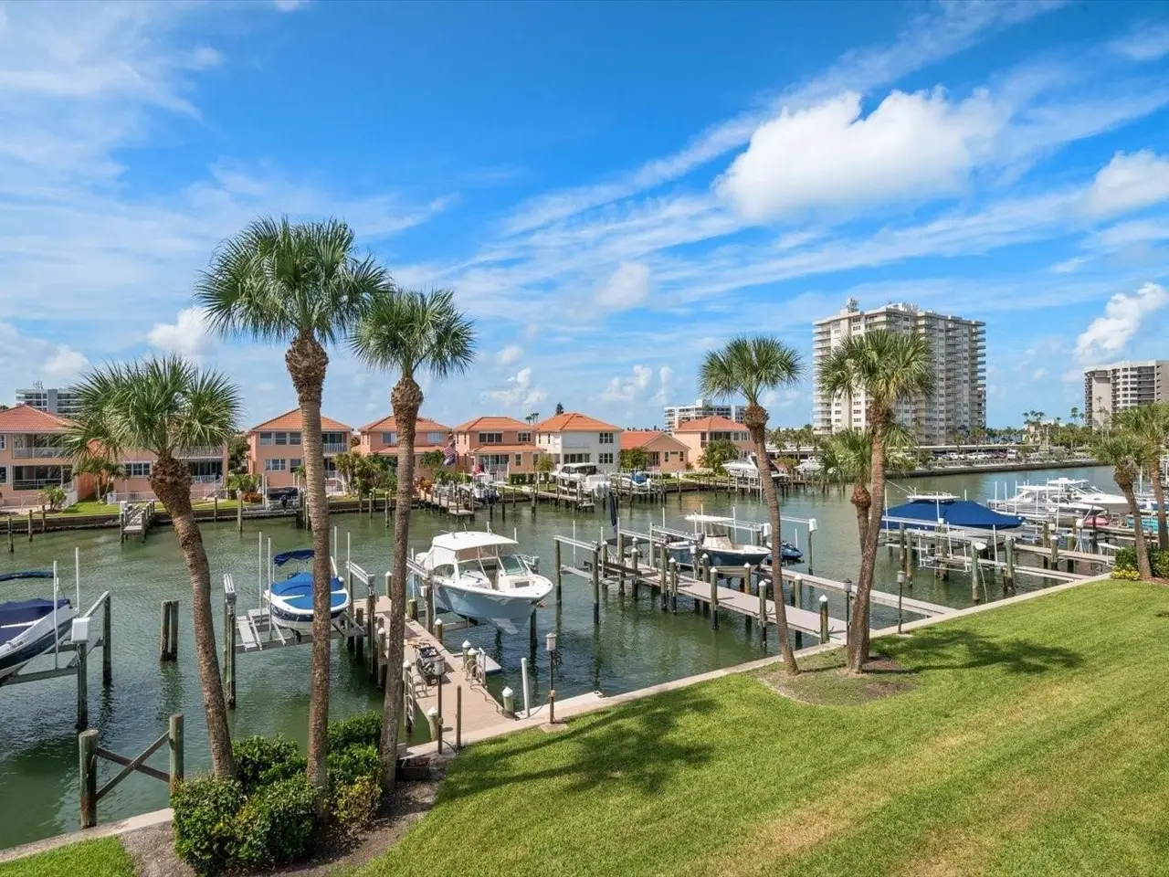 Located just south of Clearwater Beach on scenic Sand Key, this exquisite townhome in Marina del Rey blends coastal elegance with functional design and modern upgrades. Positioned along protected deep-water harborage, the property offers exceptional boating access and year-round sun exposure on its desirable south side. The main living floor features an expansive great room filled with natural light, an office or guest bedroom with a half bath, and an expertly customized kitchen designed for entertaining, featuring Cambria quartz countertops, a semi-circular breakfast bar, a separate island, detailed cabinetry, and a wine refrigerator, which contribute to a high-end culinary experience. From the main balcony—fitted with an electronically operated sunshade—residents can enjoy tranquil Intracoastal views. Upstairs, the spacious primary suite includes a private balcony, a large walk-in closet, and a luxurious en-suite bath complete with a jetted tub, walk-in shower, and dual vanities. An additional guest bedroom with an en-suite bath and a full laundry room completes this level. The ground floor offers a flexible bonus space with its own private entry, ideal for use as an office, fitness studio, or a fourth bedroom. This level also includes an en-suite full bath with a steam shower, offering both comfort and versatility. Other attractive finishes include crown molding, a fresh palette of modern, brighter paint colors throughout the interior, and bamboo flooring that flows seamlessly throughout several areas of the home. A private dock—just steps from the ground-level bonus room—features a 20,000 lb boat lift, composite decking, water, and electric service.. This pet-friendly townhome community offers a stellar location—steps from the heated pool and private beach access, and minutes from shopping, dining, and all the amenities of Clearwater Beach. Perfect as a primary residence or a low-maintenance second home, this Marina del Rey property delivers the best of boating, beach, and upscale coastal living in one beautifully updated package.