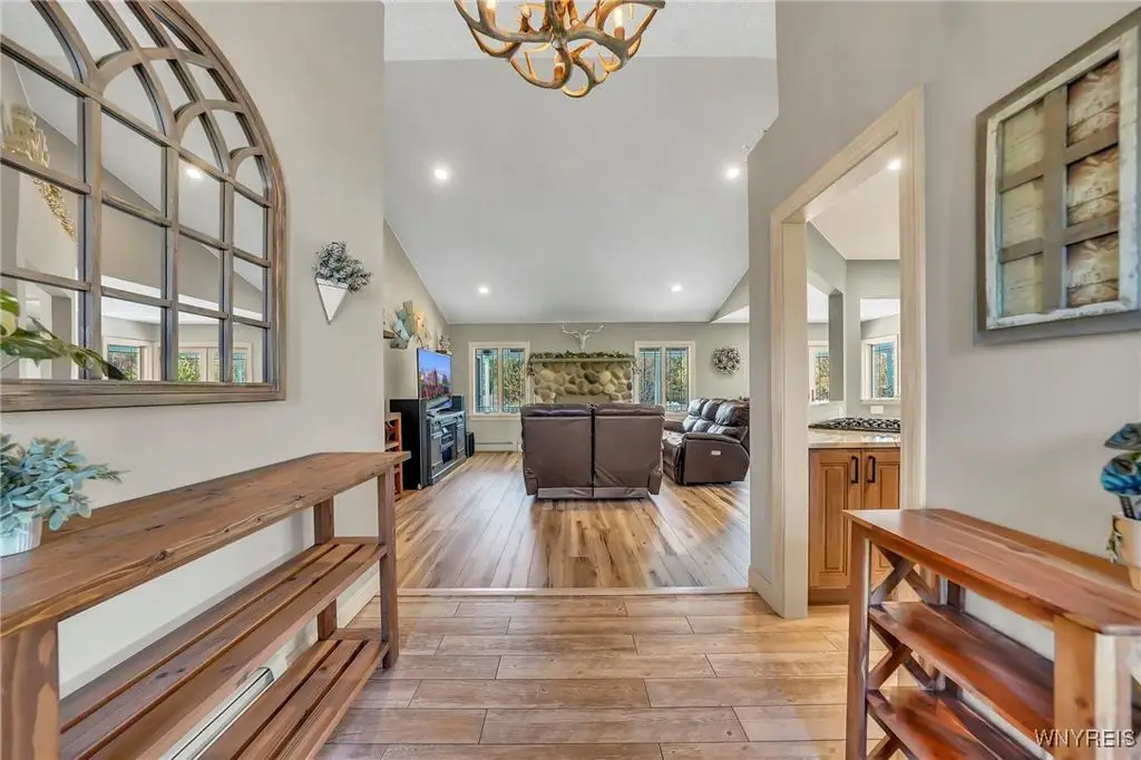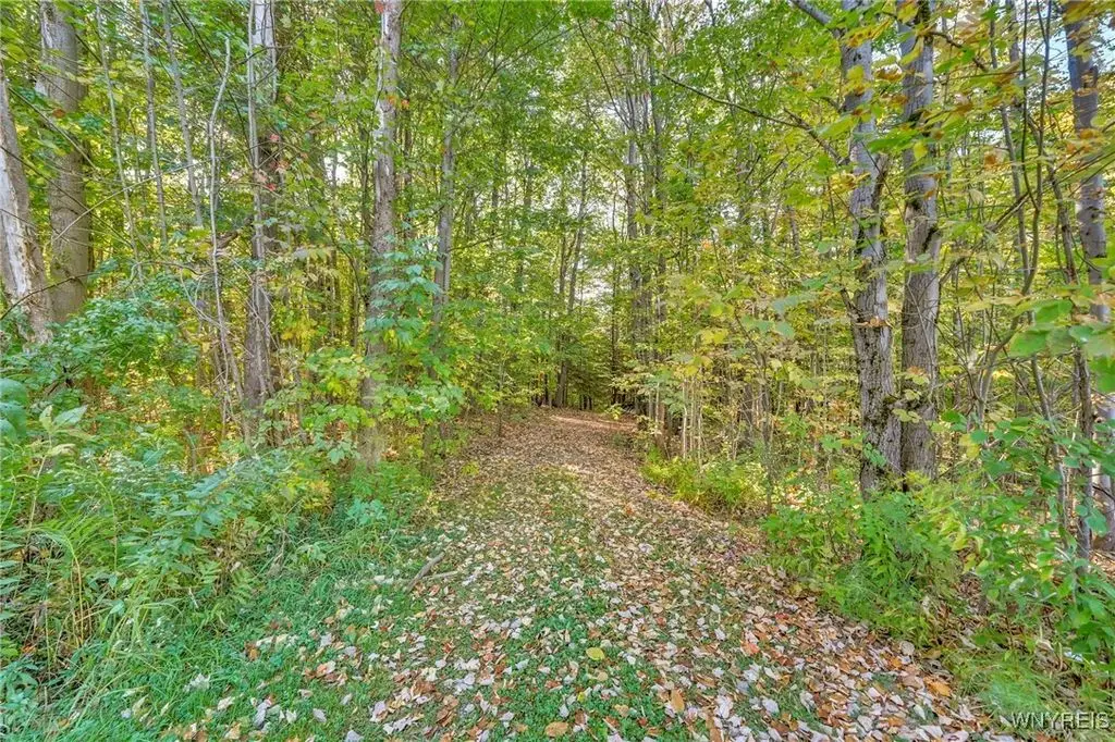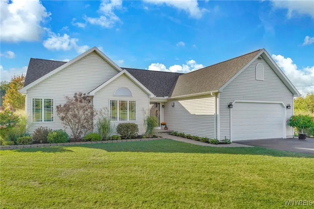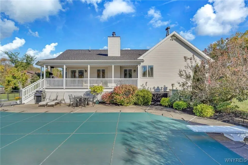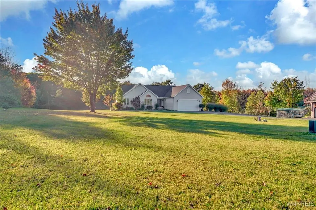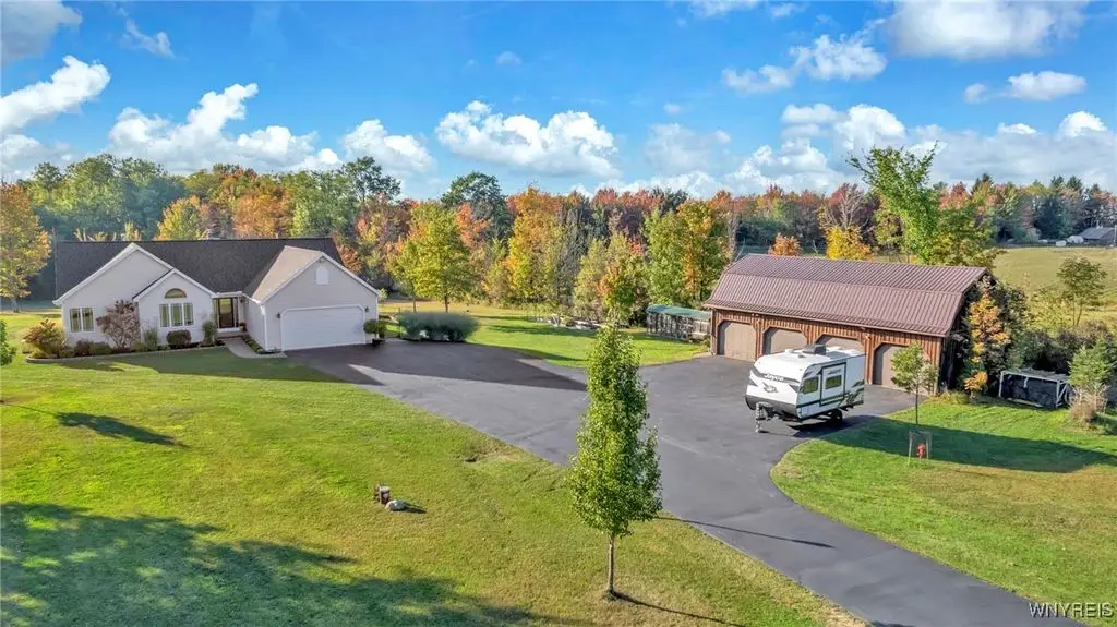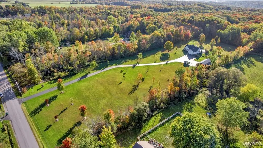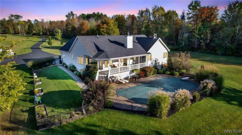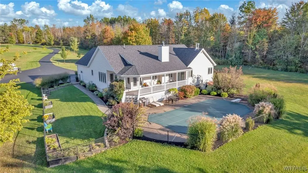 Welcome to a spectacular private estate tucked away down a picturesque, tree-lined illuminated driveway. A custom-built ranch sits on 18 gently rolling acres, offering a perfect balance of open meadows, wooded trails, & tranquil streams. Designed for both luxury & comfort, the home welcomes you with a new Shaker-style entry door '22, cathedral ceilings & freshly updated trim throughout the main flr. Inviting great room features new LVT flooring '25 & a striking stone-surround WB stove, creating a warm & stylish focal point. Adjacent is the formal dining rm, ideal for entertaining, & a beautifully updated kitchen boasting granite countertops, new cabinetry, ceramic tile flooring '23, a breakfast bar & French doors that lead to a serene, covered Trex deck w/roll up blindsC/B?B=perfect for enjoying breathtaking views in every season. Primary suite is a true retreat, offering updated ensuite bath '25, spacious walk-in closet & French drs that open to the deck w/uninterrupted views of the surrounding woods. 2nd flr bedroom is filled with sunlight through a half round window, cathedral ceiling & LVT '21. Updated guest bath '17 w/ceramic flooring, marble counters & walk in shower. Finished LL is designed for both relaxation & functionality, featuring new carpeting '25, handsome oak bar, updated half bath '25, a 4th bdrm, private office, 2nd laundry rm, generous storage & walk-out access to the rear yard. Outdoors, you'll find your own personal resort with a fully fenced yard & in-ground pool, complete with a winter safety cover '21. Spacious heated 2.5-car attd. garage is complemented by a separate 2-story, 4-car det. garage w/loft space & gas line hook-upC/B?B=ideal for hobbyists, collectors, or animal enthusiasts. Additional features include a charming chicken coop, well-maintained garden, & long list of recent updates, including a new roof '25, windows & doors '22, well rehab '23 & more. Perfectly situated just minutes from Rt 219, Kissing Bridge Ski Resort, Bflo Ski Club, shopping & dining, this better-than-new home offers the perfect blend of elegance, privacy & natural beaty. (Additional square footage of lower level measured by architect. Fourth bedroom in lower level.)