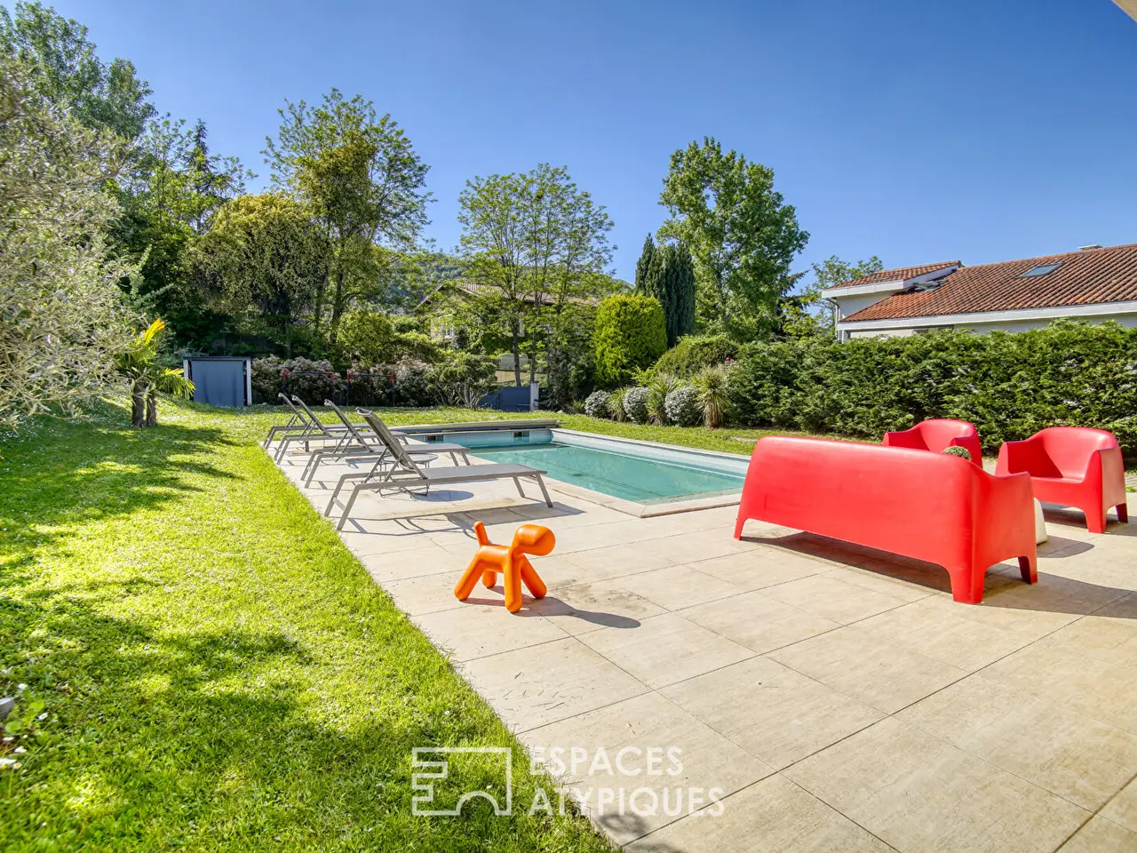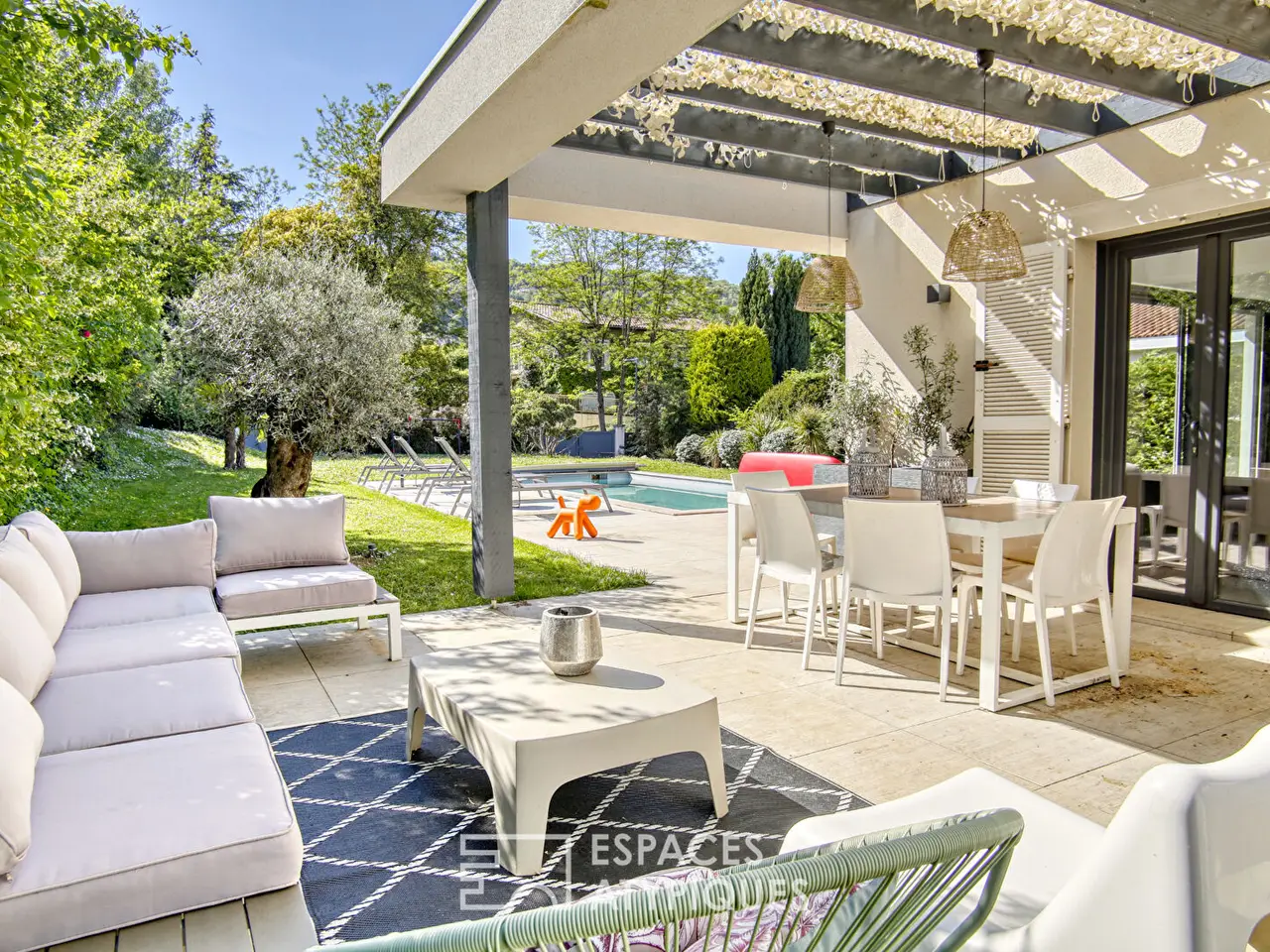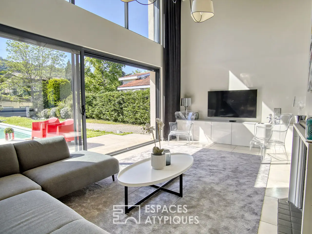 At the end of a cul-de-sac and in absolute calm, this house of approximately 200m2 of living space is built on a flat plot of approximately 1000m2, not overlooked, on the heights of Collonges-au-Mont d'Or. The entrance to the house opens onto a large double living room opening on one side onto a contemporary kitchen with clean lines and on the other onto the terrace and the garden. The cathedral ceiling of the living room and its double window give a certain cachet to this living room. On the same level, a bedroom with its bathroom allows a sleeping area on the ground floor. A laundry room and a games room complete this level. Upstairs, a beautiful master suite takes place with its dressing room and its private bathroom. For the children, two bedrooms and a bathroom complete this level. The land, well exposed, landscaped and not overlooked, benefits from a terrace area under a pergola and a heated swimming pool with heat pump. Air/water heat pump with underfloor heating. Reversible air conditioning. Bus and school nearby. DPE: C /. GES: C Contact: Guillaume - 06 67 69 73 00REF. 11012Additional information* 6 rooms* 4 bedrooms* 1 bathroom* 2 shower rooms* Outdoor space : 1000 SQM* Parking : 2 parking spaces* Property tax : 1 422 €Energy Performance CertificateEPC blank or in progressAgency feesThe fees include VAT and are payable by the vendorMediatorMediation Franchise-Consommateurswww.mediation-franchise.com29 Boulevard de Courcelles 75008 ParisInformation on the risks to which this property is exposed is available on the Geohazards website : www.georisques.gouv.fr