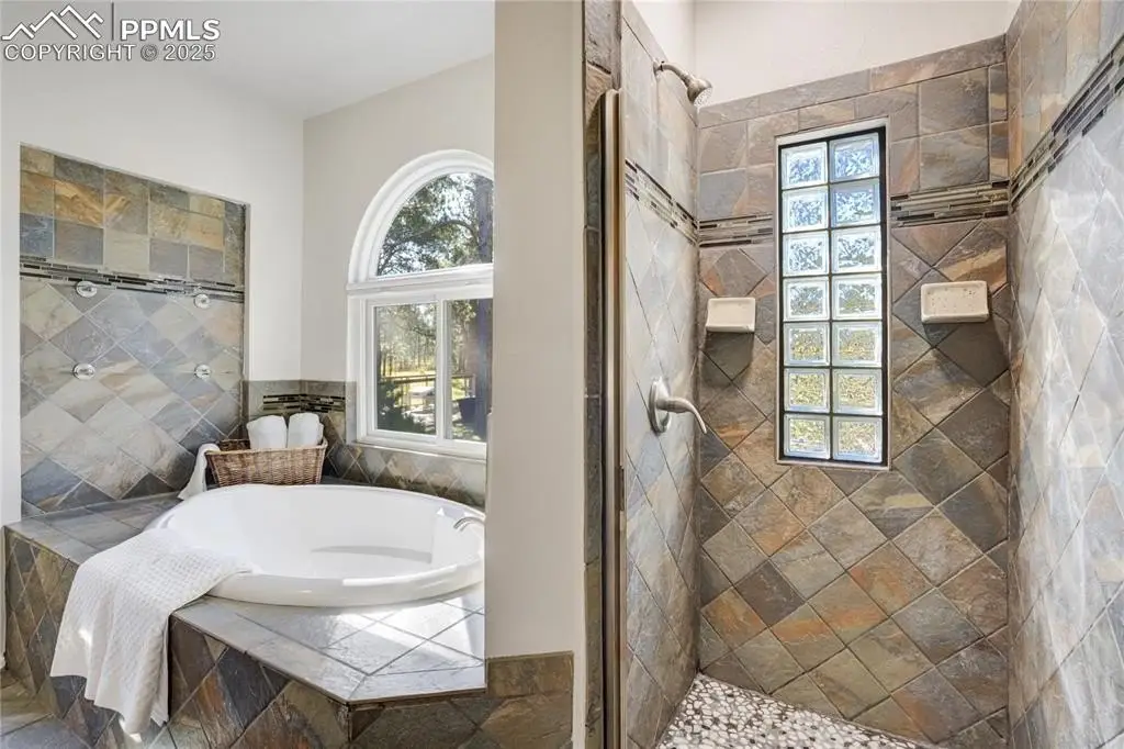 Elevated Living | Serenity Among the Pines—Where timeless design, natural beauty, and peaceful living converge. Nestled on a private, 5-acre treed corner lot zoned for horses, this beautifully crafted home offers the perfect blend of elegance, warmth + functionality. Thoughtfully updated, it balances classic architecture with modern comforts + an effortless connection to its serene natural setting. The main lvl welcomes you w/hardwood floors, soaring vaulted ceilings + abundant light that enhances the open flow. The formal living room features a bay-window seat overlooking the wooded landscape + a cozy gas fireplace, while the adjacent dining room is ideal for festive gatherings. The great room impresses w/a dramatic floor-to-ceiling stone wood-burning fireplace + opens to the gourmet kitchen—showcasing white cabinetry, Silestone countertops, a large island w/seating, walk-in pantry + stainless-steel appliances including double ovens, a 5-burner gas cooktop + exterior-vented hood. The expansive main-level owner’s suite is a peaceful retreat offering 2 walk-in closets w/custom built-ins + a luxurious 5-piece ensuite complete w/heated tile floors, dual granite vanities, soaking tub + walk-in shower—plus private walk-out access to the patio + hot tub. Upstairs, a Jr Suite w/a private composite deck & ensuite bath provides flexibility, along with 3 additional bedrooms + an updated full bath. The finished walk-out basement offers ample storage + is pre-plumbed for a future pellet/wood stove + wet bar. Add Highlights: New Class IV roof (2023), Boiler (2025), Carpet + Interior Paint (2025) + updated lighting. Outdoor living shines w/greenhouse, loafing shed, chicken coops + 6 car garage. With no HOA + minimal covenants, enjoy the freedom of country living just minutes from the Pineries Open Space—where trails for hiking, biking, and horseback riding await. Award-winning D20 schools and an easy commute to both Colorado Springs + Denver complete this one-of-a-kind retreat.