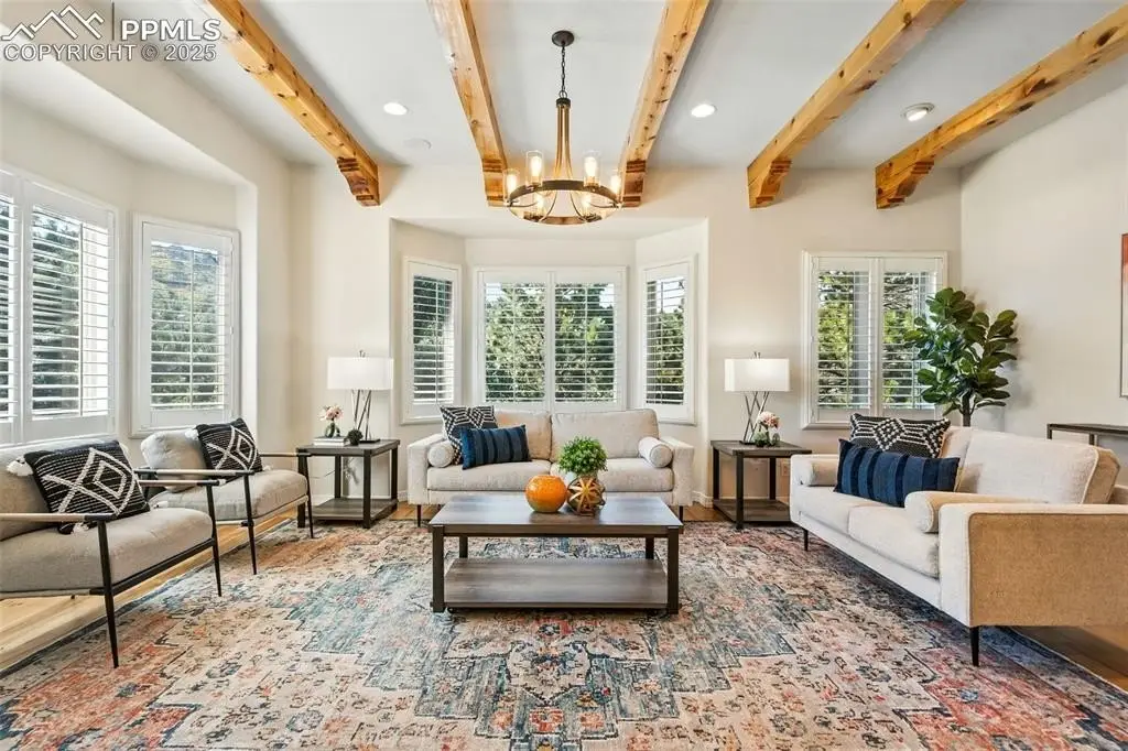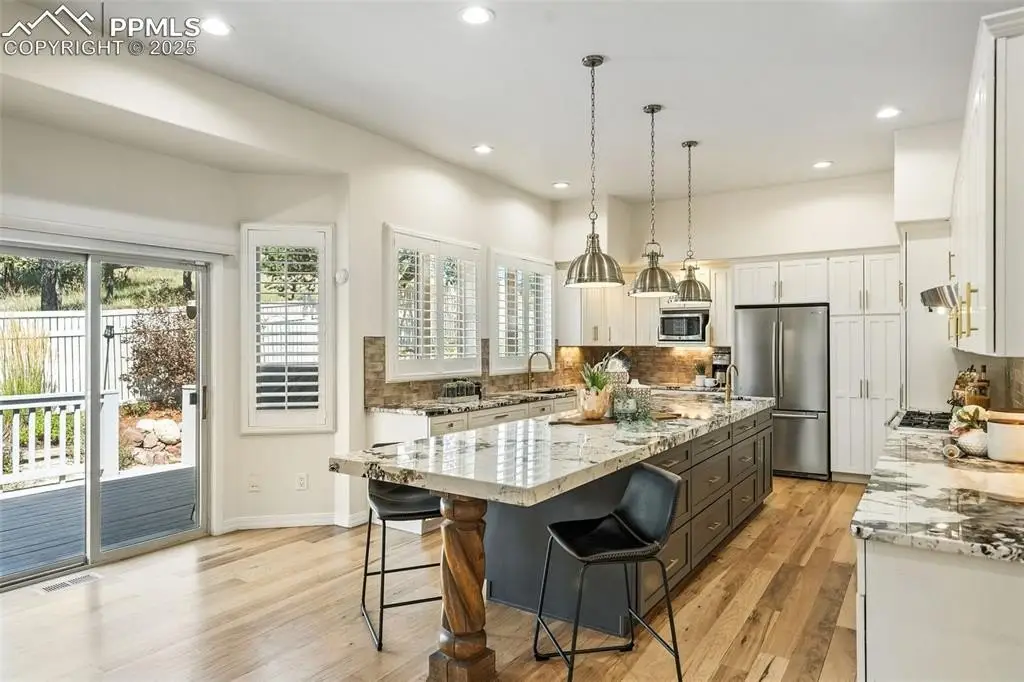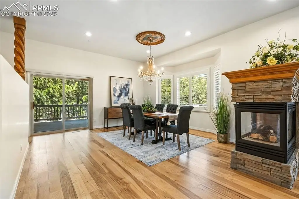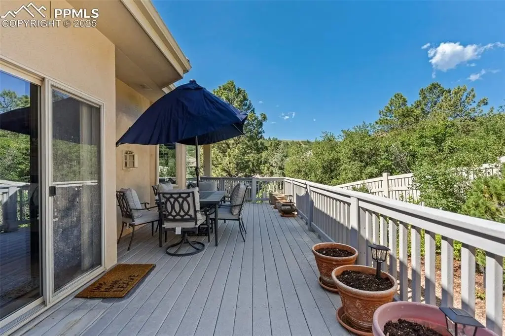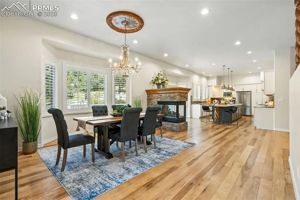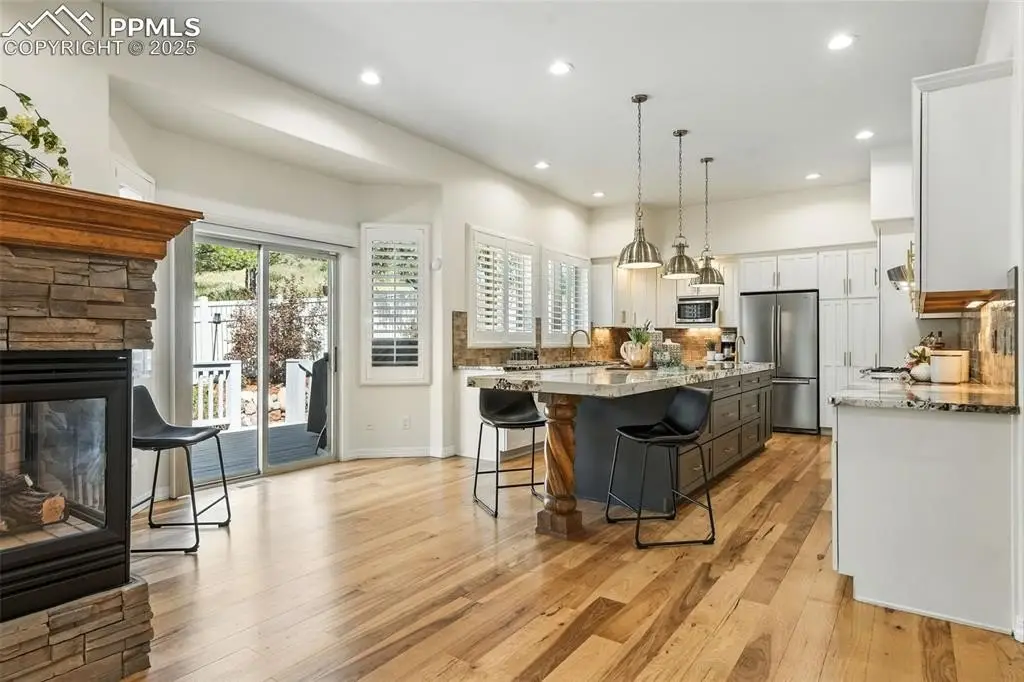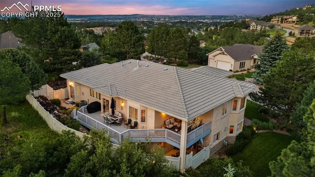 Stunning ranch-style home on a private cul-de-sac in Peregrine, features true main level living and is designed to capture the essence of Colorado living. From the moment you enter, soaring beamed ceilings, alder doors and rich hickory floors set an elegant tone in the open-concept great room complete with a wall of windows framing the foothill views. At the heart of the home is a beautifully remodeled kitchen featuring striking Patagonia granite, a sprawling center island, Italian Ilve professional range with 6 burner cooktop and dual ovens, and abundant cabinets. The adjoining dining room, anchored by a dual-sided fireplace, creates an inviting setting for gatherings. The luxurious primary suite is a retreat of its own, with a private walkout to the backyard, a cozy gas fireplace, and a spa-inspired bath featuring a jetted tub, oversized walk-in shower, and walk-in closet. A secondary bedroom with adjoining bath offers the perfect guest suite or private office. The main-level laundry is conveniently located. The walkout lower level was made for entertaining, with a sprawling family room, gas fireplace, wet bar, and seamless access to the patio. Two additional bedrooms, and two full bathrooms provide comfort and privacy. The versatile flex room is ideal for a gym, dance studio, or hobby space. Generous storage completes the level. Step outside to experience the tranquility of this truly special location. Relax on the expansive deck overlooking a cascading water feature with the backdrop of towering ponderosa pines and scrub oak. Located minutes to award winning District 20 schools, shopping and dining with easy access to I-25. This home embodies the perfect balance of luxury, functionality, and natural beauty—truly the ideal Colorado lifestyle.