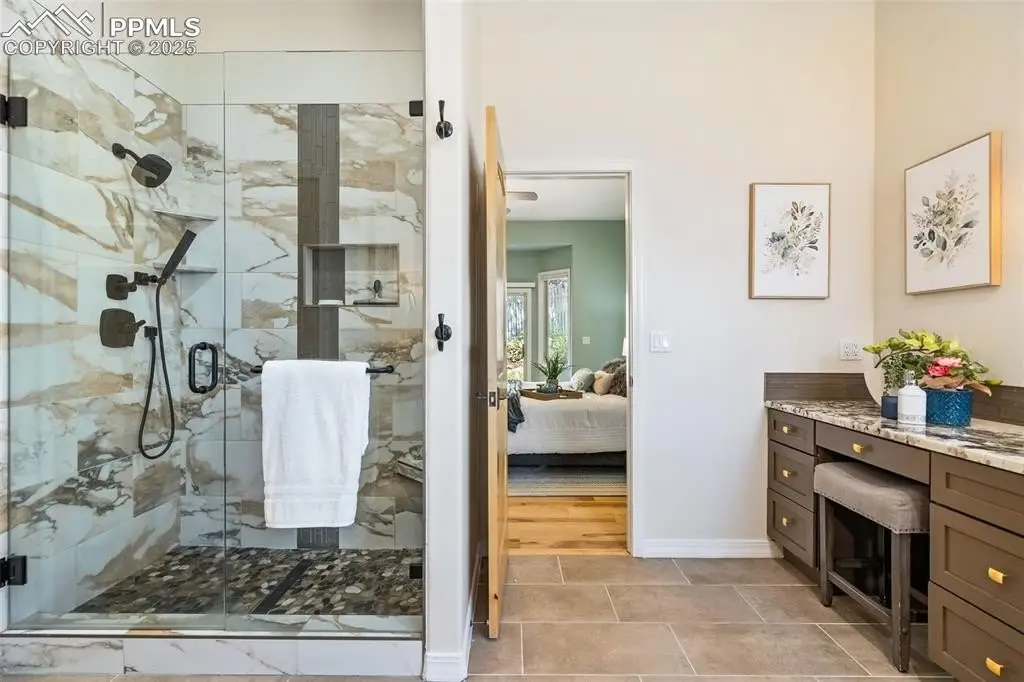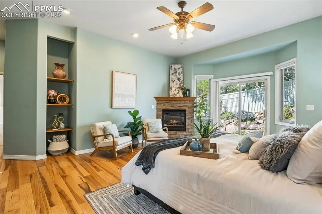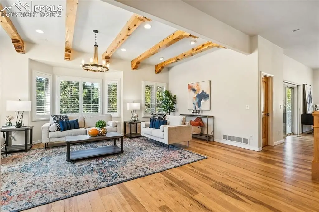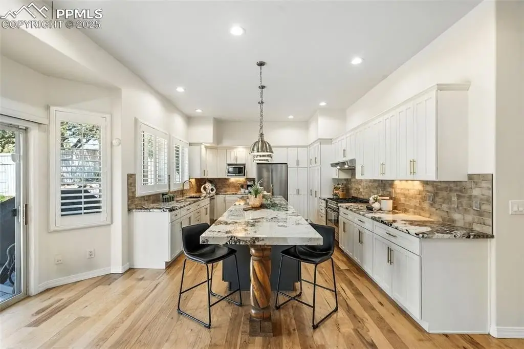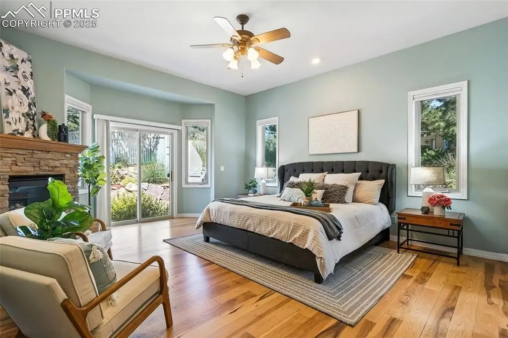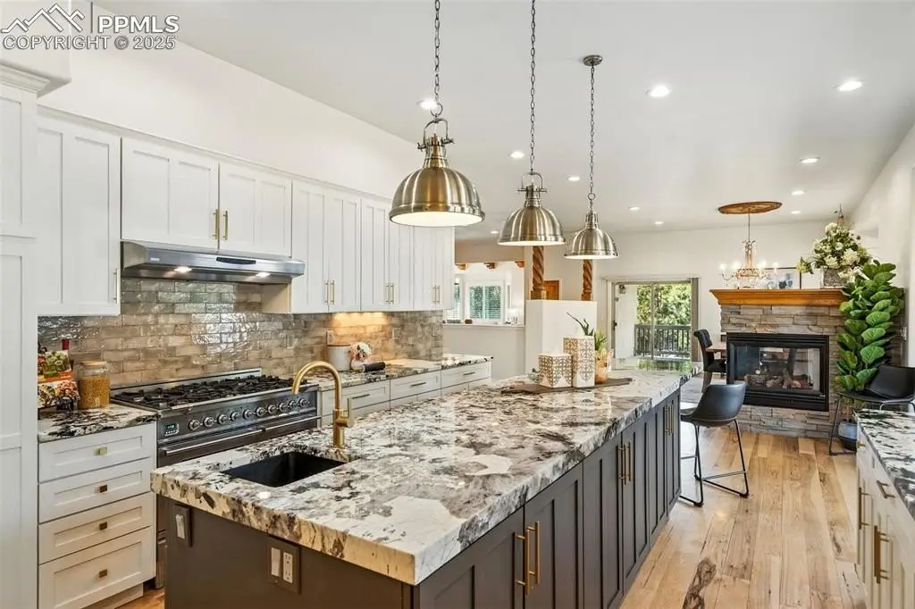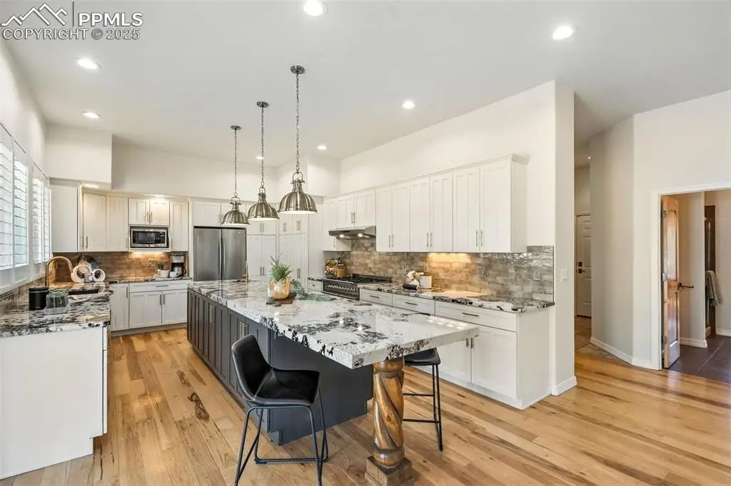 Stunning ranch-style home on a private cul-de-sac in Peregrine, features true main level living and is designed to capture the essence of Colorado living. From the moment you enter, soaring beamed ceilings, alder doors and rich hickory floors set an elegant tone in the open-concept great room complete with a wall of windows framing the foothill views. At the heart of the home is a beautifully remodeled kitchen featuring striking Patagonia granite, a sprawling center island, Italian Ilve professional range with 6 burner cooktop and dual ovens, and abundant cabinets. The adjoining dining room, anchored by a dual-sided fireplace, creates an inviting setting for gatherings. The luxurious primary suite is a retreat of its own, with a private walkout to the backyard, a cozy gas fireplace, and a spa-inspired bath featuring a jetted tub, oversized walk-in shower, and walk-in closet. A secondary bedroom with adjoining bath offers the perfect guest suite or private office. The main-level laundry is conveniently located. The walkout lower level was made for entertaining, with a sprawling family room, gas fireplace, wet bar, and seamless access to the patio. Two additional bedrooms, and two full bathrooms provide comfort and privacy. The versatile flex room is ideal for a gym, dance studio, or hobby space. Generous storage completes the level. Step outside to experience the tranquility of this truly special location. Relax on the expansive deck overlooking a cascading water feature with the backdrop of towering ponderosa pines and scrub oak. Located minutes to award winning District 20 schools, shopping and dining with easy access to I-25. This home embodies the perfect balance of luxury, functionality, and natural beauty—truly the ideal Colorado lifestyle.
