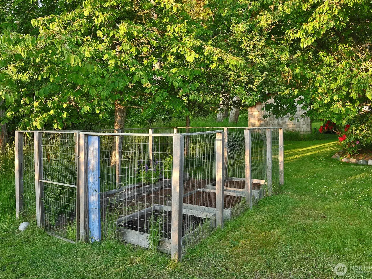 Fenced garden with planting shed
