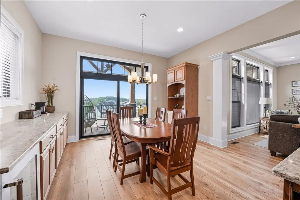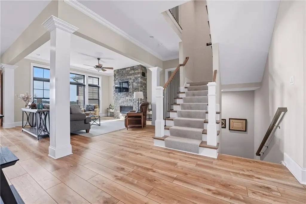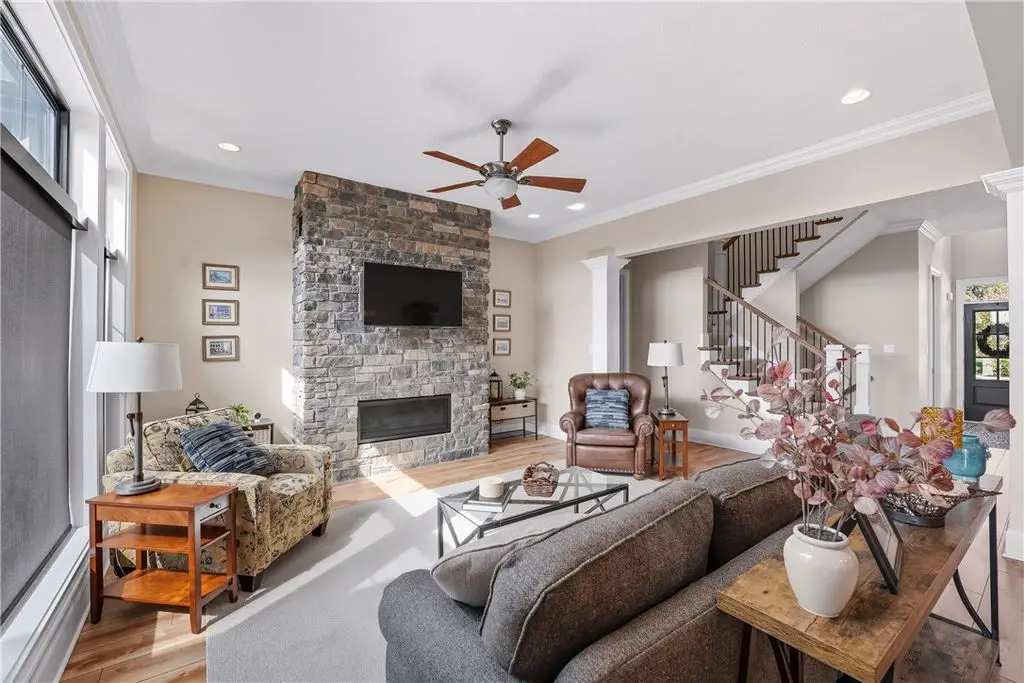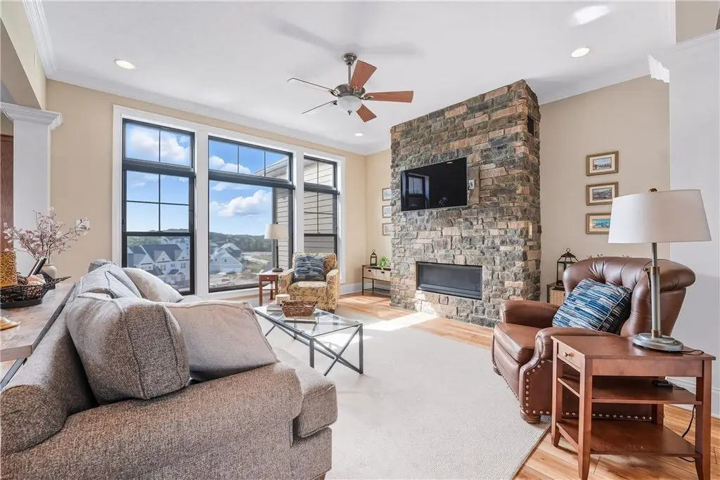 FIRST FLOOR Owner's quarters in Low maintenance section at Laurel Pointe. Brick and Hardie board exterior. Enter the covered porch experience hardwood throughout, grand 2-story entry 10 ft ceilings plus wall of windows providing dynamic views. A private Study/Living room then transverses into large Entertainers Kitchen exhibiting abundant designer cabinetry, stainless appliances, range hood, convection oven/microwave, large center island, spacious dining area. The family room includes stone FP, paddle fan/ abundant recessed/natural light. Experience Owner's suite with quartz counter tops, soaking tub, custom ceramic shower and large walk-in with built-ins. Second floor has three additional large bedrooms, one on suite, jack/jill bath and flex room. Partially finished walk-out lower level, 9 ft ceilings abundant natural light providing additional living/workspace for use. Experience sought after accessible lifestyle, Butler County taxes plus Infinity's innovative design/quality/value