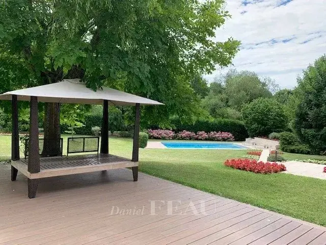 This property offering 411 sqm of floor space and about 260 sqm of living space in excellent condition is set in 6000 sqm of grounds in a peaceful leafy environment. Very bright and tastefully renovated throughout by the current owners, it includes a 75 sqm triple living/reception room featuring an 8-metre high cathedral ceiling and a wood burner, a dining room opening onto a terrace and the garden, a luxurious fitted and recently equipped kitchen with dining facilities, a utility room, and a near 46 sqm master suite with a fully west-facing bedroom featuring a fireplace, a bath/shower room/wc and a dressing room. A bright mezzanine study leads to two spacious bedrooms (one with a shower room), a smaller third bedroom or possible dressing room, and a shower room. On a basement comprising a 100 sqm 4-car garage, a boiler room and two large storage rooms. The floodlit leafy grounds are potentially partially constructible, and feature a swimming pool , a vegetable garden and two outdoor parking spaces. In a convenient location near the shops, the schools and the transport networks (Paris 25 min via the A14, and 25 min by train). Bus lanes access excellent schools including Blanche de Castille, Saint-Jean-Hulst and Saint-Germain-en-Laye International School.