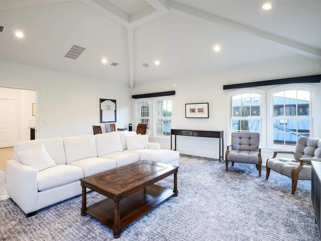 This light-filled home in the ESD-private school corridor was substantially rebuilt and renovated by one of Dallas' highest end builders, Paul Pastore of Waterside Homes circa 2021 - 2022. The 6,030 square foot home on an oversized 0.4+ acre lot blends transitional elegance with newer construction quality in one of Dallas' rising Preston Hollow neighborhoods. Inside, rich, recently installed hardwood flooring, designer lighting and architectural beams set the tone for refined living. A generous entry leads to a formal living room with a stately fireplace and pocket doors, ideal for privacy when used as a home office. The large formal dining room flows effortlessly into the main living area, where a dramatic fireplace, vaulted ceilings and views of the backyard create a stunning focal point. Adjacent to this inviting space, a well-appointed wet bar with wine refrigeration enhances the home's exceptional flow for entertaining. In the heart of the home is a true chef's kitchen, anchored by recently purchased Wolf and Sub-Zero appliances and dual sinks with resilient Quartz counters, that opens to a light-filled breakfast room. The main-level primary suite offers vaulted beam ceilings, French doors to the patio, a spacious walk-in closet and a spa bath with a soaking tub and oversized glass shower. A guest suite, laundry and two powder rooms complete the downstairs. Upstairs, three bedrooms with en suite bathrooms and a media or game room with bonus full bath complement the thoughtful floor plan. Major improvements since 2021 include a new roof and windows, updated plumbing, electrical, insulation, cabinetry, appliances, wood flooring, zoned Lennox HVAC systems and ductwork and two tankless water heaters. Savant smart home integration, Cat 6 wiring, a seven-zone sound system (full downstairs, patio and upstairs game room), and security cameras ensure modern comfort. An attached three-car garage and substantial storage throughout the home add convenience to style.