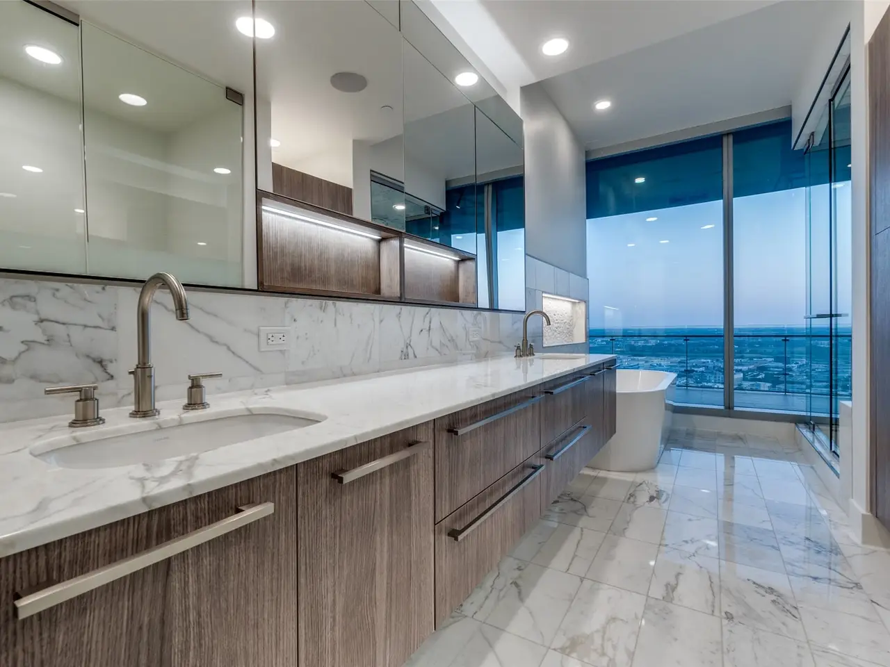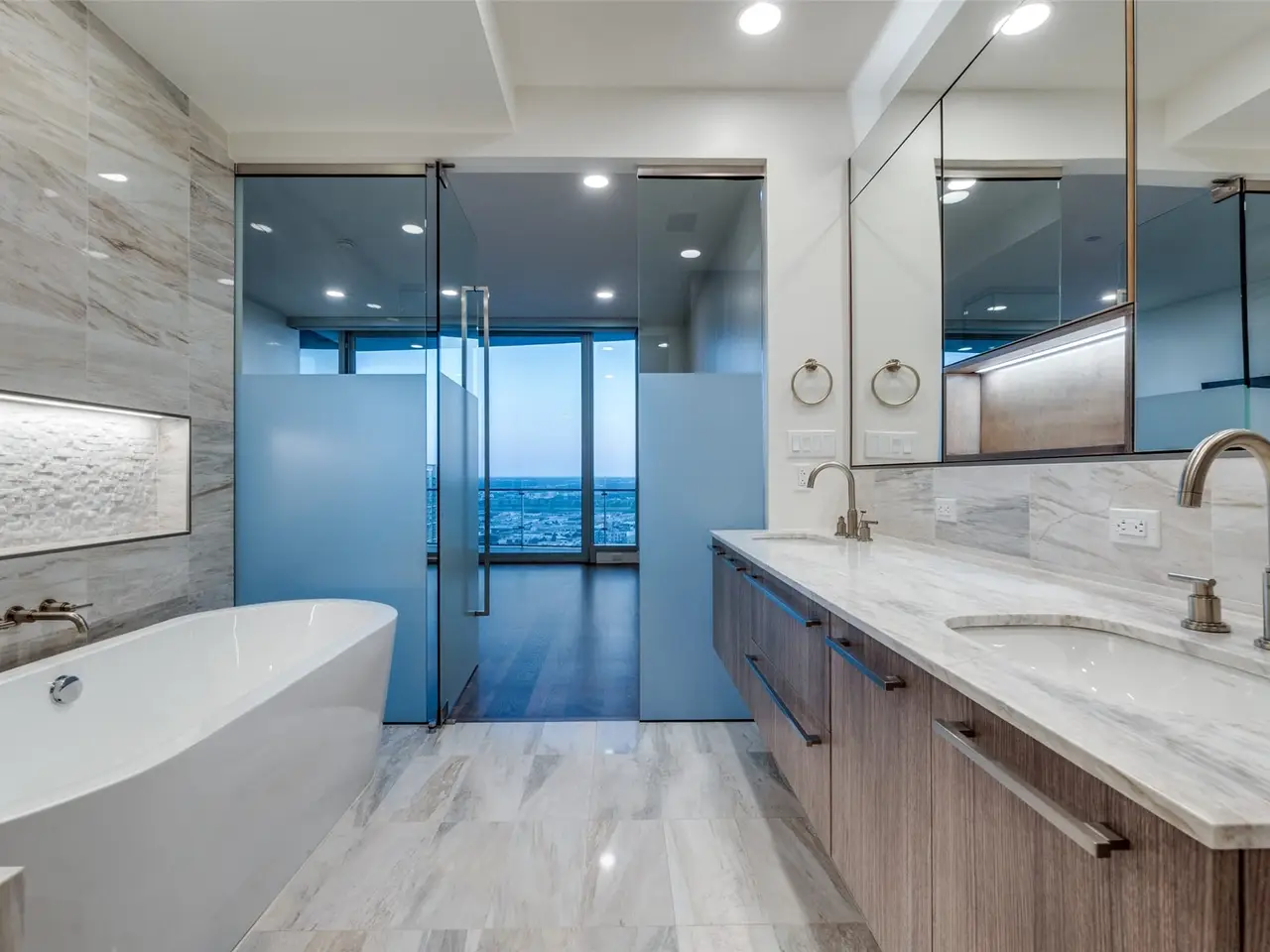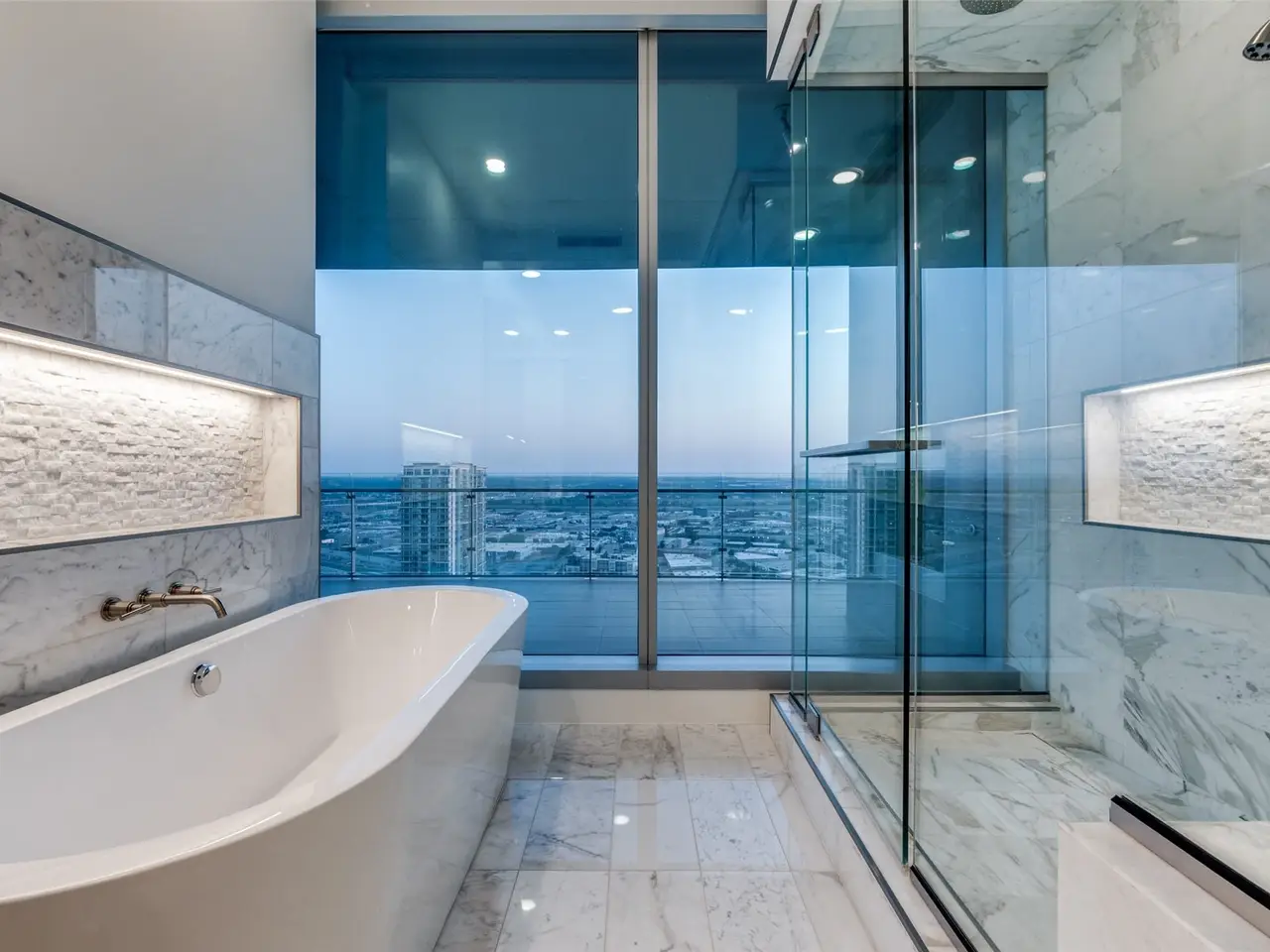 Marble-clad bath with soaking tub