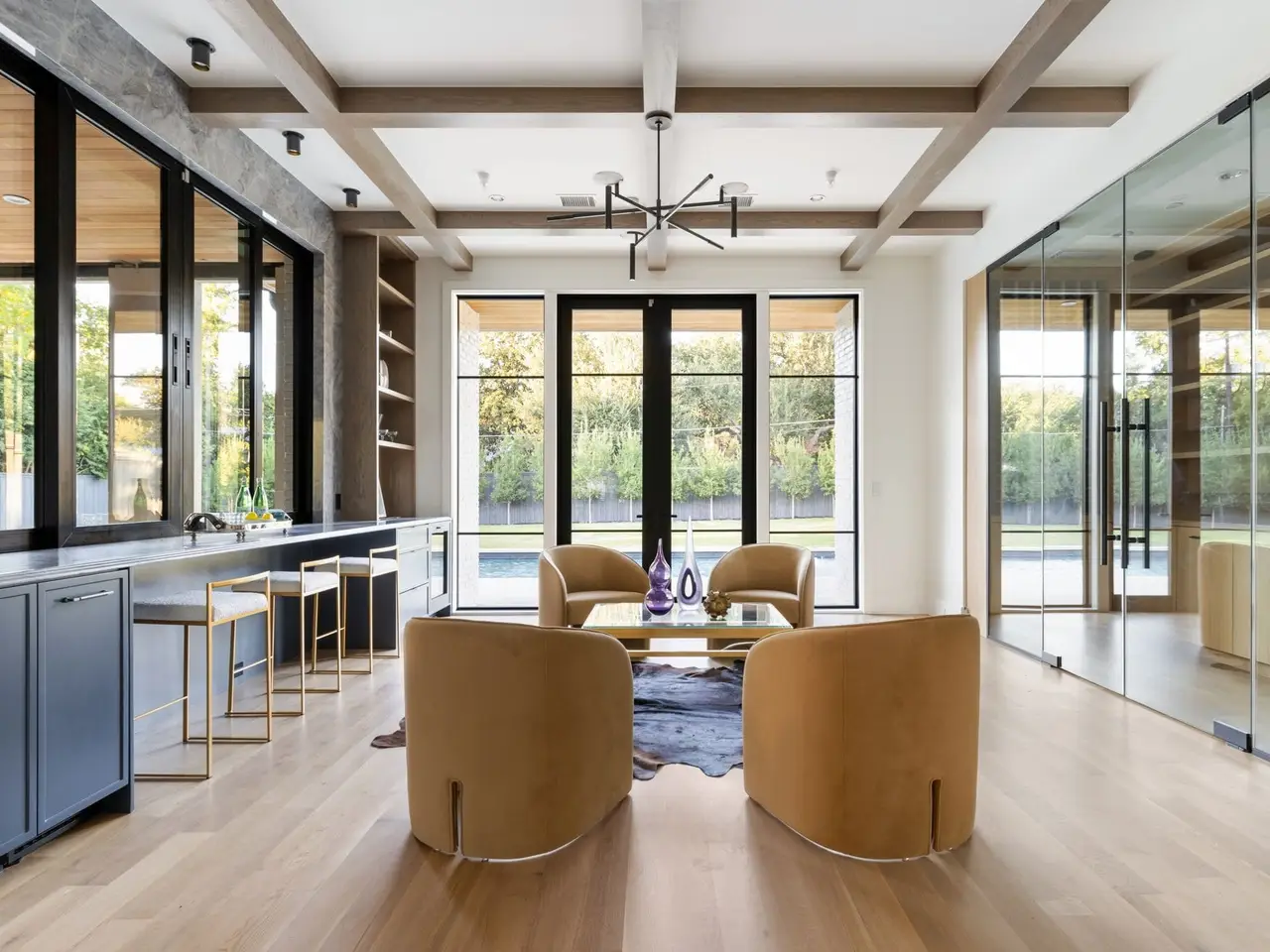 New construction masterpiece by Hudson Construction Group and Janson Luter Architects, located on a fully gated 0.675-acre lot in the prestigious heart of Preston Hollow. This light and bright home features an open floor plan designed for effortless entertaining year-round. The first floor offers a spacious primary suite, a guest bedroom, and formal living and dining areas, along with a gourmet kitchen that seamlessly flows into the breakfast area. Upstairs, the second floor features three generous ensuite bedrooms and a media room, a flexible space that can serve as a sixth bedroom or a fully equipped gym. Additional highlights include a large walk-in pantry with a scullery kitchen, two utility rooms, a private study, a comfortable lounge room with a sizable wine closet, and an elevator for easy access to all levels. Step outside to your backyard oasis, complete with a living area, sparkling pool, sports court, and a spacious yard.