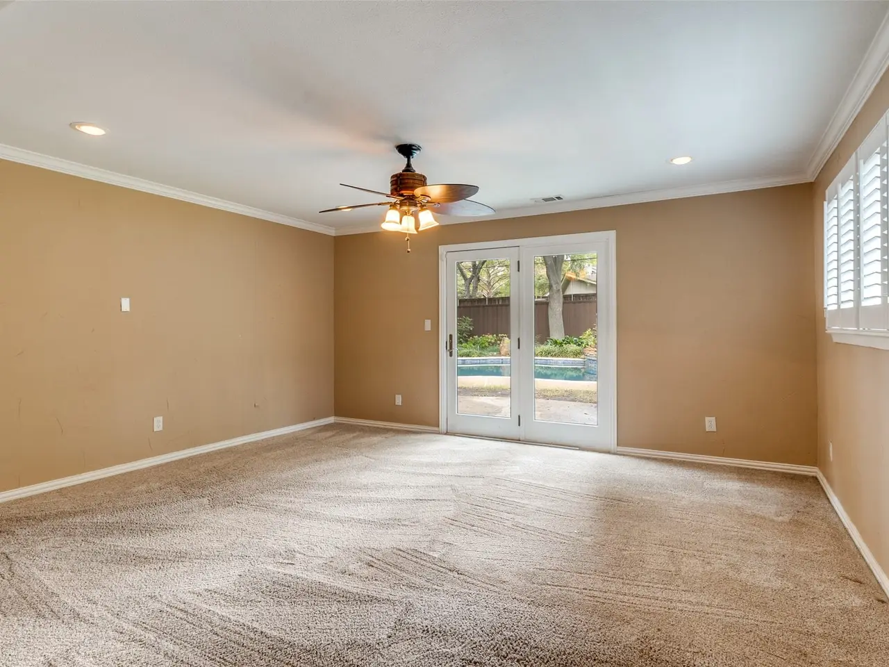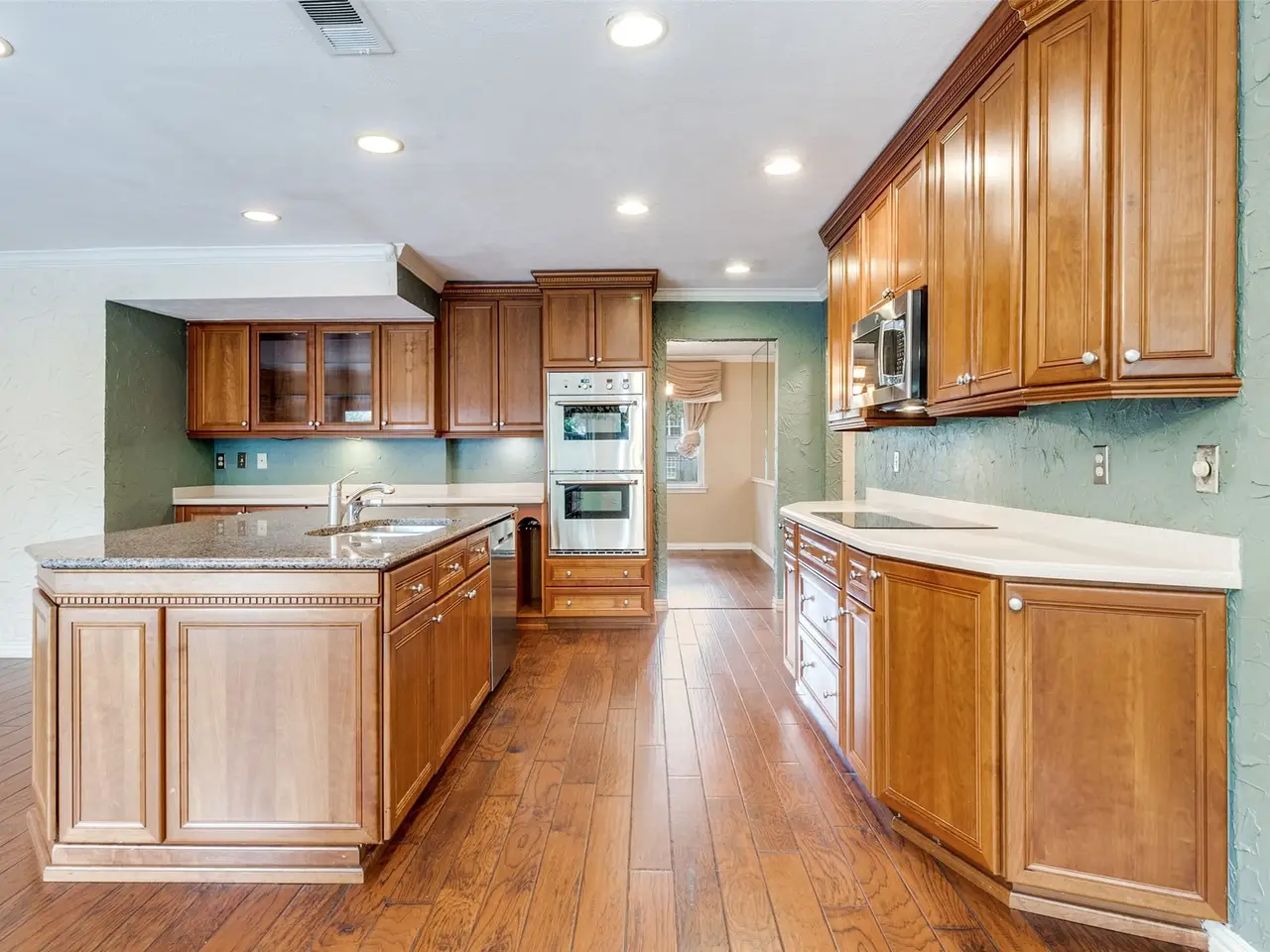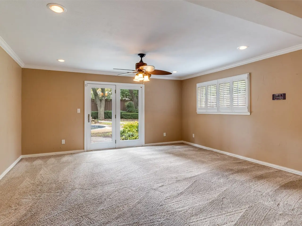 Welcome to a beautiful and inviting home. Nestled in the heart of Dallas' prestigious Private School Corridor. This property exudes curb appeal with its towering trees and lush landscaping. Designed for easy living and effortless entertaining. Gorgeous wood floors lead you into an extraordinary over-sized den enhanced with recessed lights, crown moldings. Updated patio door opens to a beautiful lushly landscaped backyard and a terrific pool. Elegant living and dining rooms have stunning wood floors. The den opens to a well-appointed gourmet kitchen features gorgeous wood floors and a kitchen work island and enhanced with a huge walk-in pantry with built-in shelves for tons of storage. Spectacular over-sized game room features a tall, beamed ceiling, recessed lights, handsome wood floors and a wall of built-in cabinets for extra storage. The spacious primary suite boasts a huge walk-in closet with plantation shutters. Over-sized primary bathroom with a spa like bathroom has a jetted tub, separate shower and two sinks. Updated energy efficient dual pane windows. Updated patio doors with energy efficient dual pane glass.