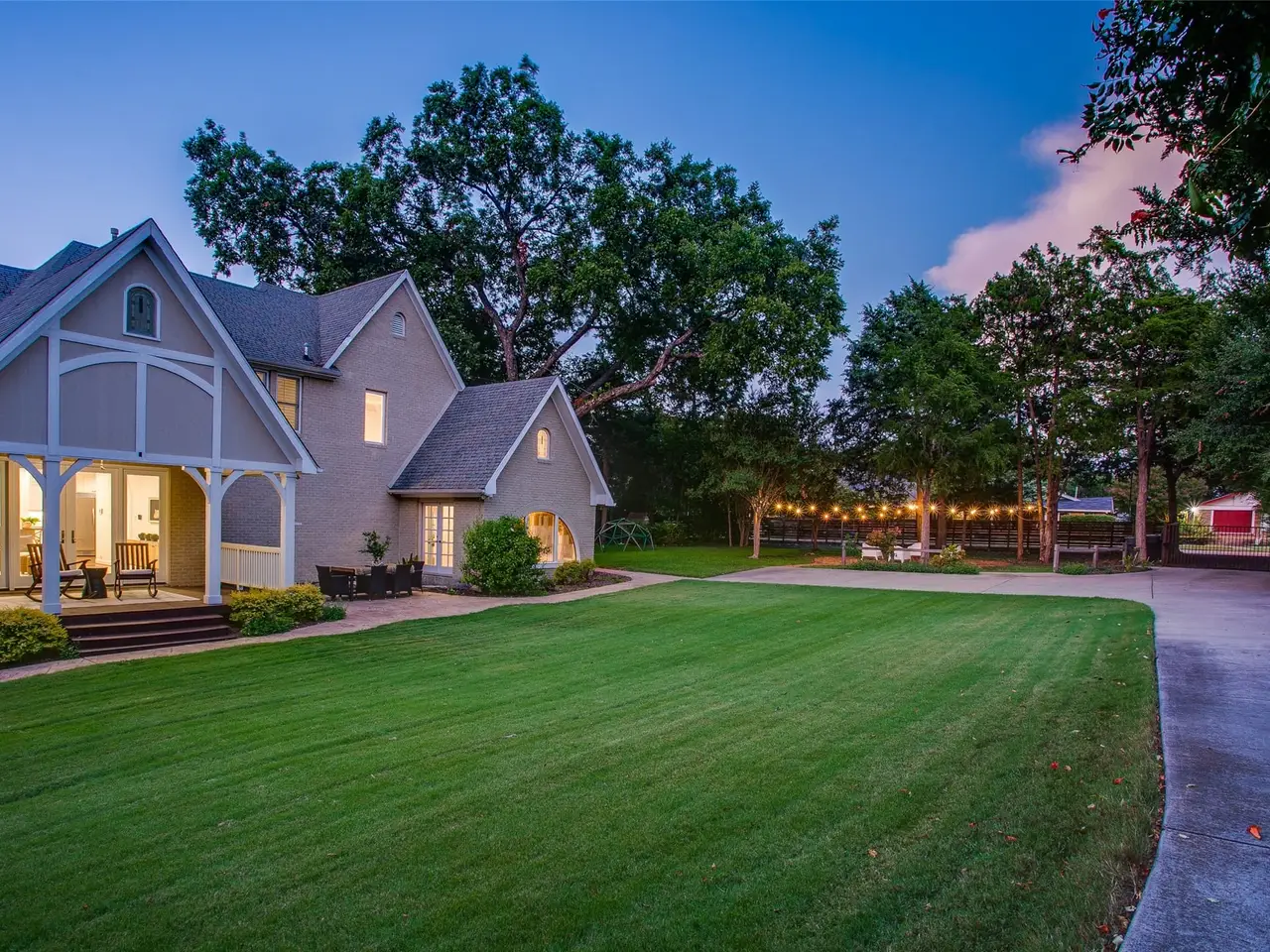 Tucked away on a gated half-acre lot in North Oak Cliff, this Tudor Revival blends storybook charm with thoughtful updates. Stained-glass windows, arched doorways, and coffered ceilings in the formals highlight timeless craftsmanship, while hardwood and tile flooring throughout, plantation shutters, and an original brick fireplace anchor the living spaces. A cathedral-like office or sitting room with vaulted ceilings, exposed beams, and stained-glass windows provides a striking retreat. The bright kitchen boasts a large island, double ovens, walk-in pantry, and oversized, built-in refrigerator. Multiple living areas include an upstairs bonus room ideal as a second living or playroom. The primary suite features a bath with dual vanities, soaking tub, walk-in shower, and walk-in closet. Outdoors, mature trees and wide lawns provide space for entertaining, with the walking trails and playgrounds of Kidd Springs Park just steps away.