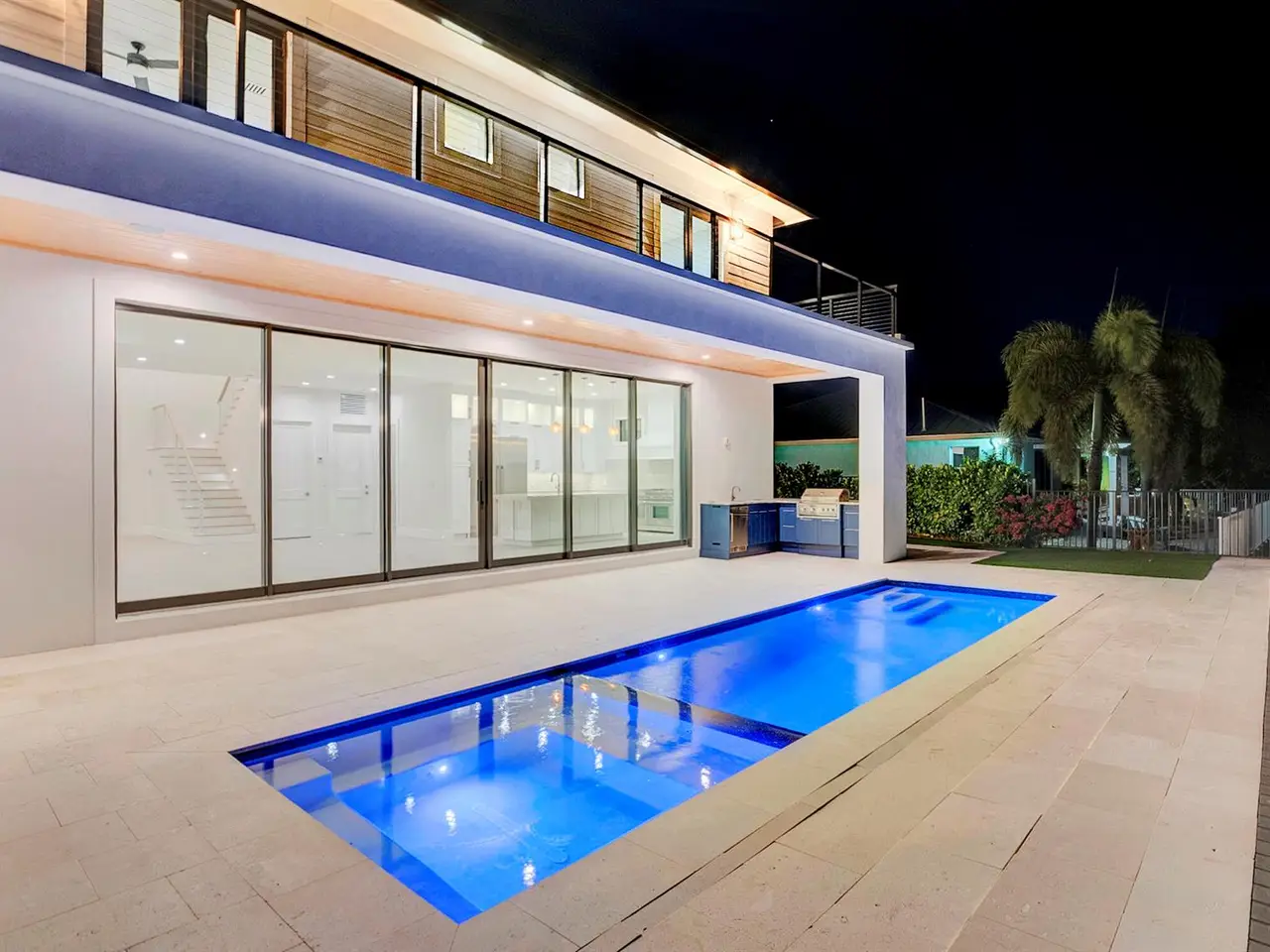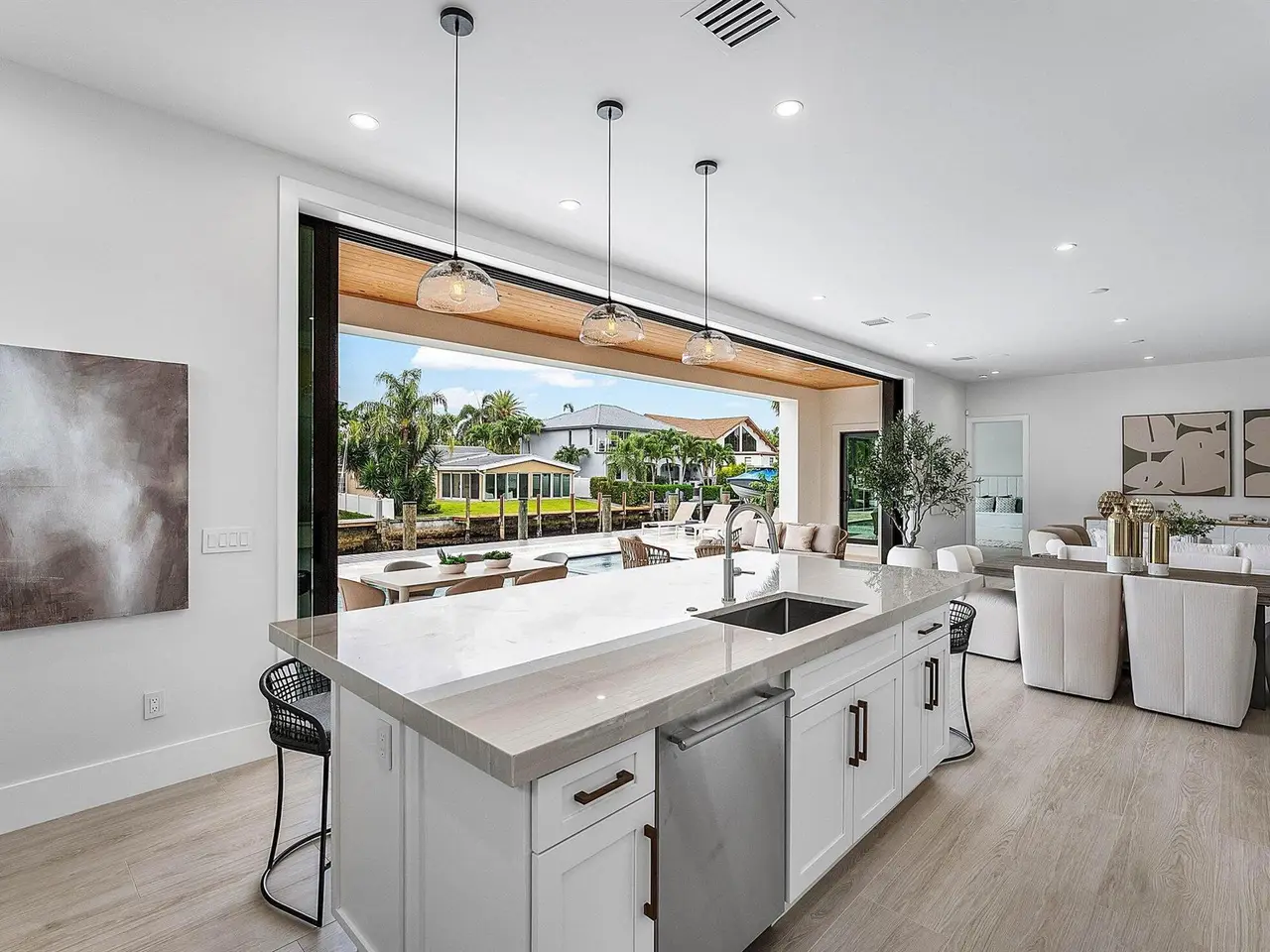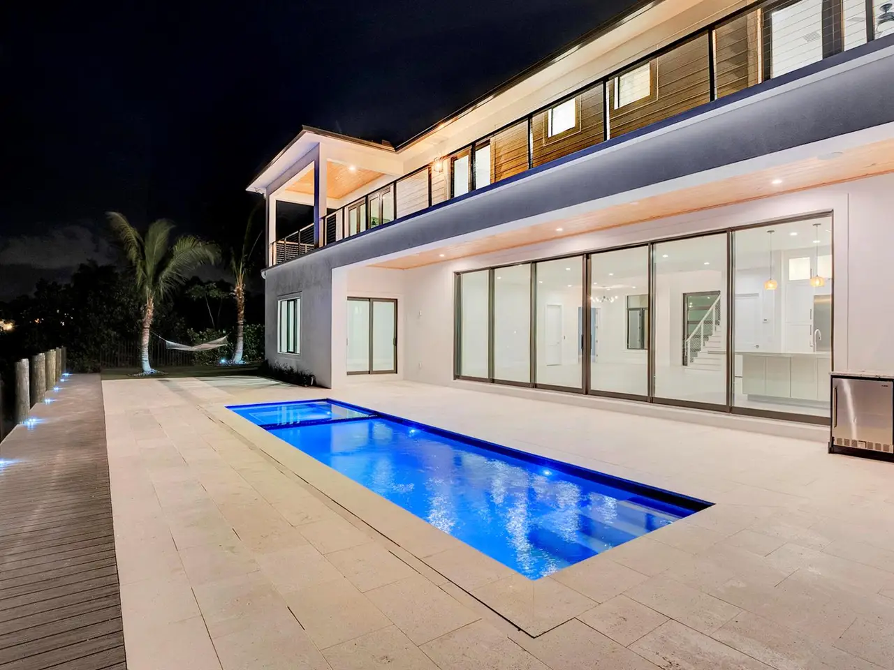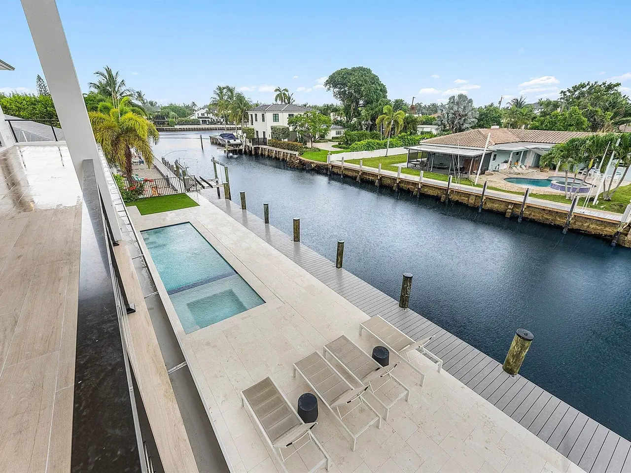 Welcome to 101 feet of direct waterfront on a private road in unincorporated Delray Beach's coveted 33483. This brand new residence offers a new seawall and dock, 5 bedrooms, 7 bathrooms and 5644 total sqft (4621 under air) with thoughtful spaces for work, play, and relaxation.Beautifully designed kitchen featuring a full Thermador appliance suite--6-burner dual fuel range with griddle, double oven, and sleek finishes flowing effortlessly into the expansive living and entertaining space where natural light pours in from every angle.Giant pocket sliders disappear like a curtain of glass blending indoor comfort with outdoor living. Step onto the covered loggia with a full summer kitchen, built-in grill, bar seating, cabana bath and outdoor shower--perfect for entertaining.