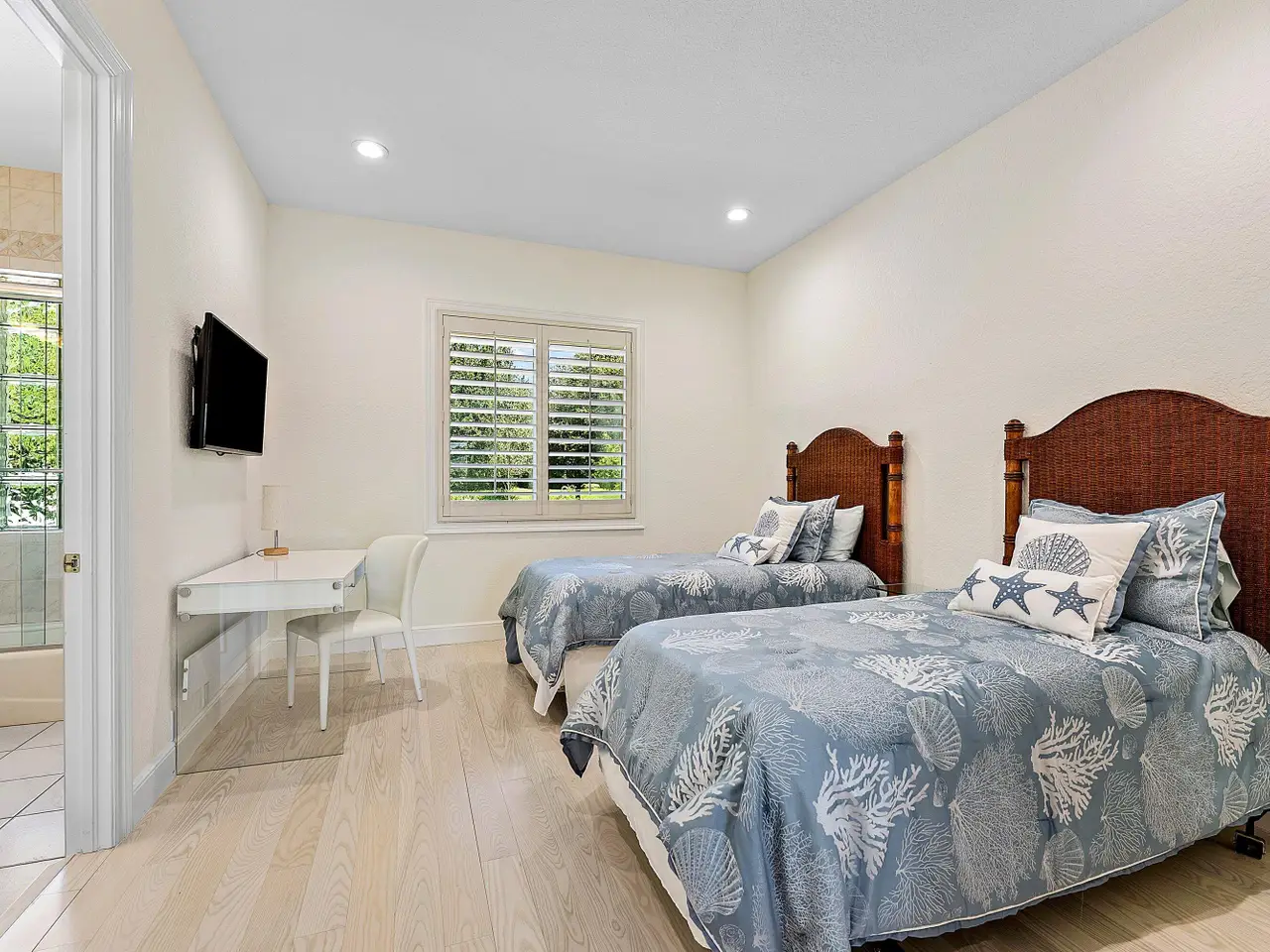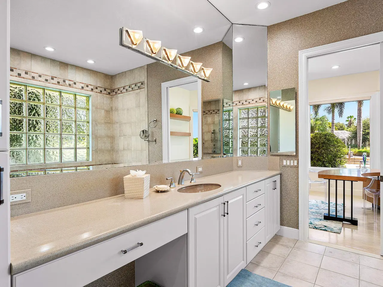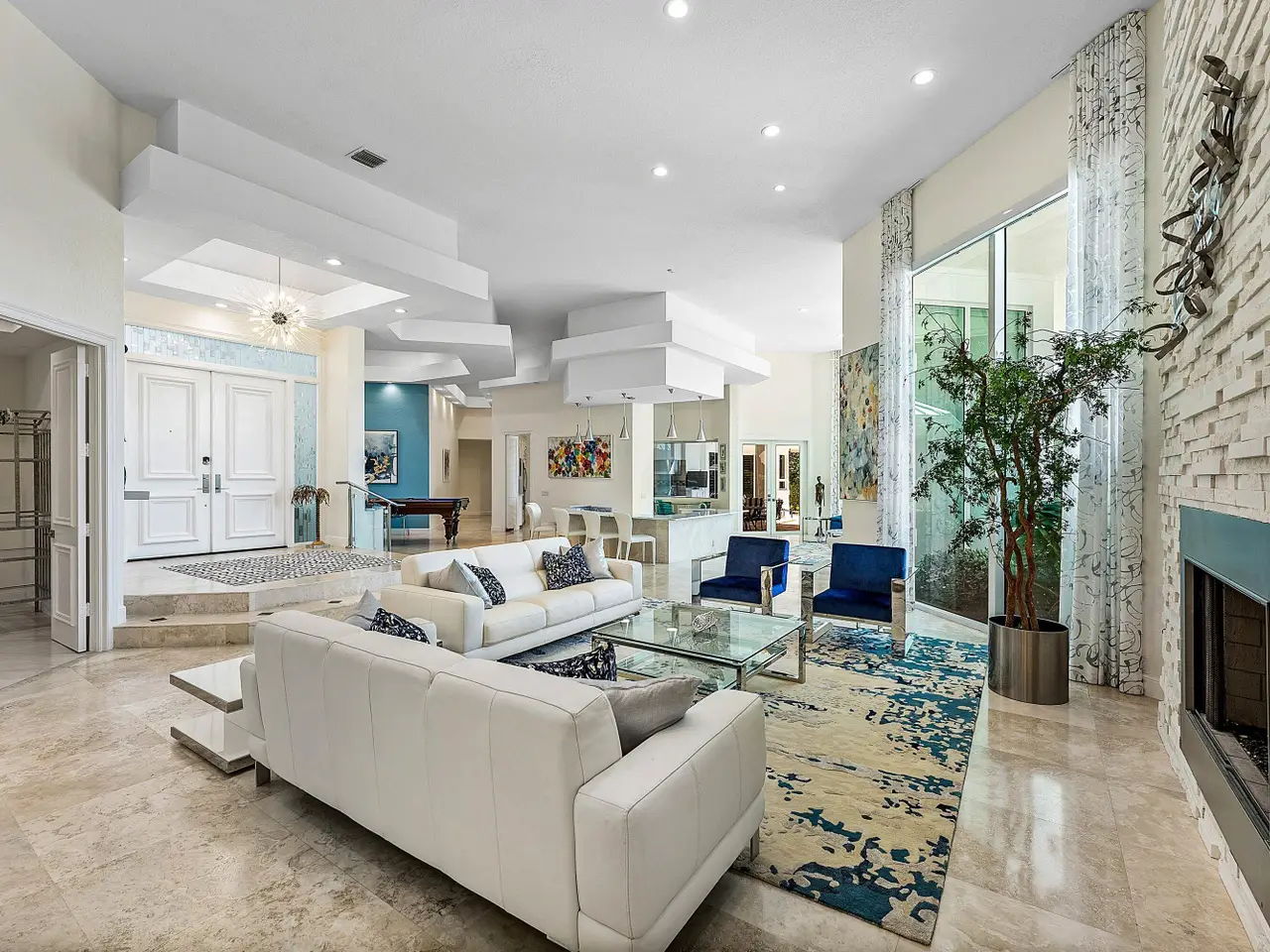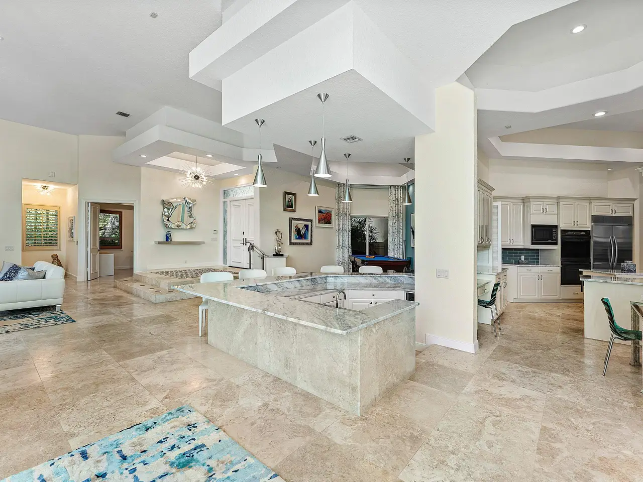 Custom-Built Estate in Seagate Country Club! Nestled in the prestigious Estates Section of desirable Seagate Country Club, this custom-built home spans over 1.33 acres with breathtaking golf course and lake views. Designed for both elegance and comfort, this residence features a split floor plan with 4 spacious bedrooms plus 2 offices. The primary suite, located in its own private wing, offers a luxurious walk-in closet, dual bathrooms, and a cozy sitting area overlooking the pool, golf course, and beyond. Highlights include: Marble and wood flooring throughout. An impressive bar with striking blue marble stone. A chef's kitchen with matching blue marble, custom cabinetry, walk-in pantry, and a picture window framing the expansive patio & outdoor kitchen.