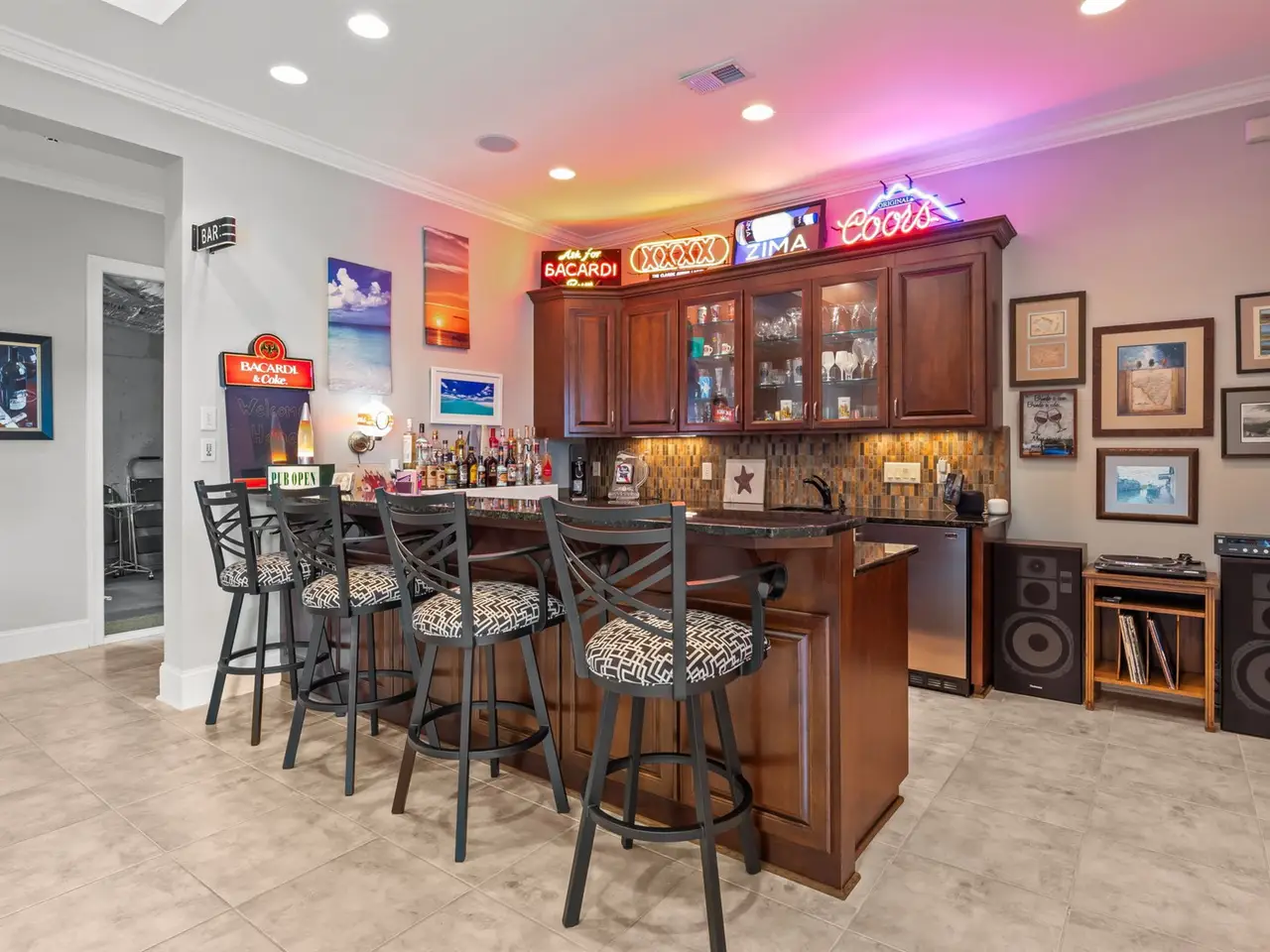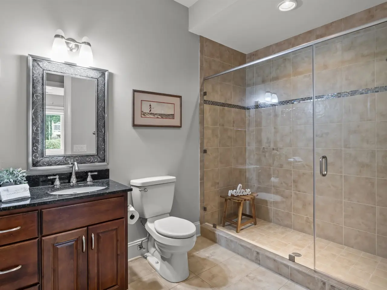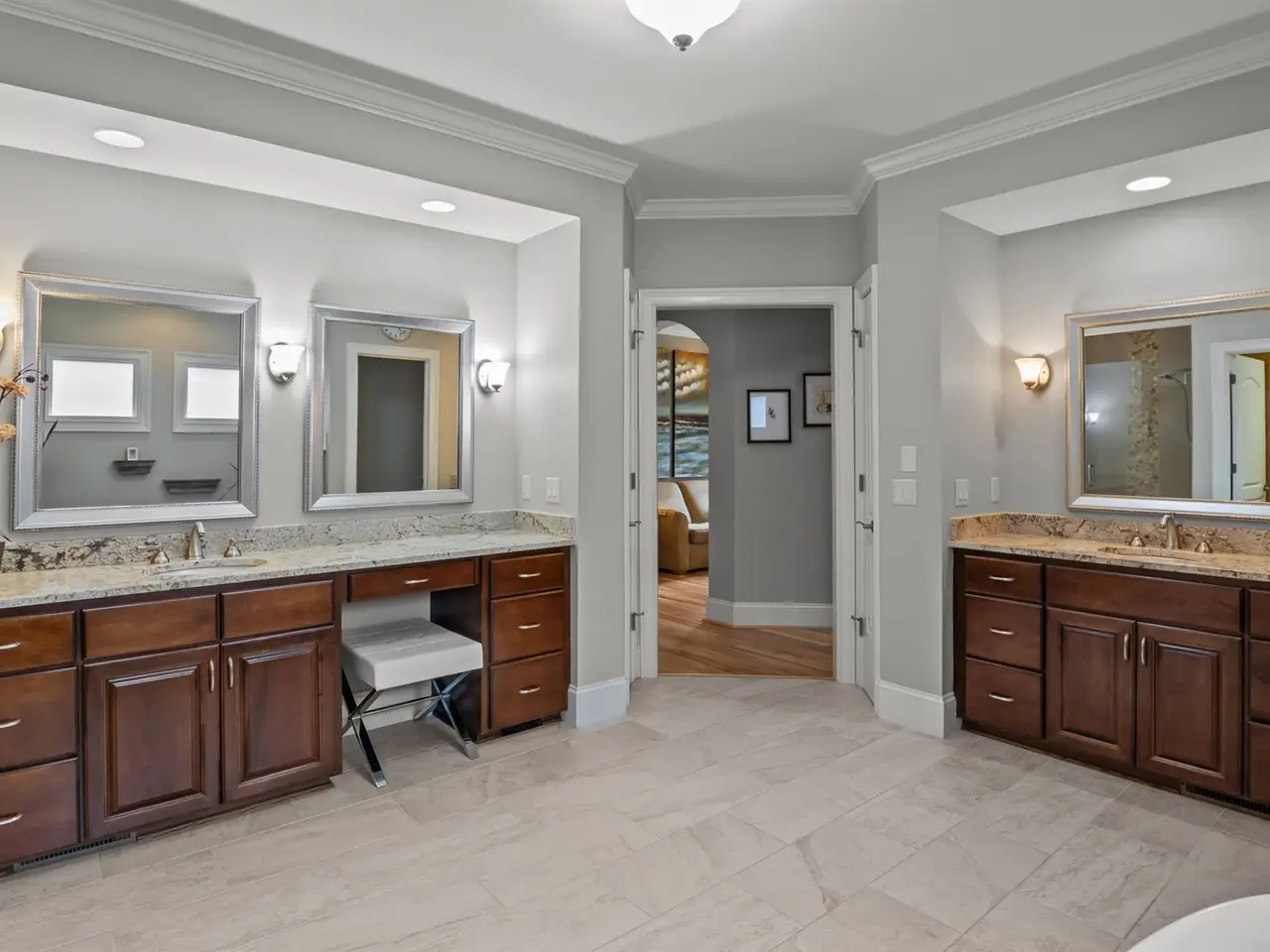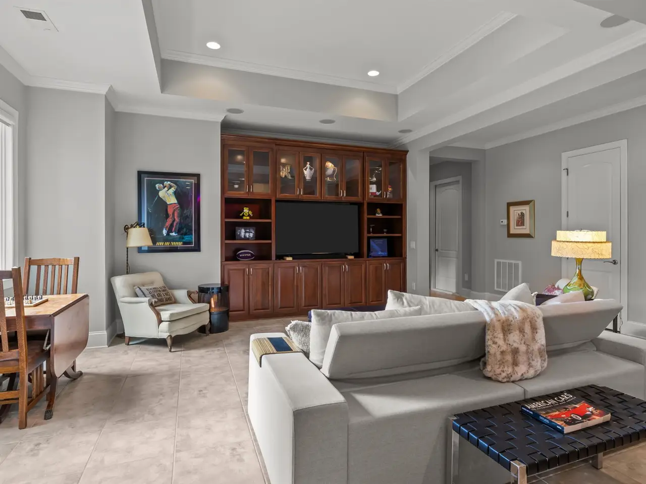 Perched on an elevated lot with views of 8th fairway at Verdict Ridge Golf Course, this stunning retreat blends timeless elegance with resort-inspired living. Step inside a sunlit main level where the spacious kitchen flows into the family room perfect for entertaining with tranquil golf course vistas. An elevator provides access throughout, while the primary suite offers a spa-style bath and dual walk-in closets. The laundry room doubles as a workspace. The office & the fireside sitting room add charm. Car lovers will enjoy the 3-car garage with epoxy floors and workshop space. Outside, your private oasis awaits complete with a heated salt water pool, covered patio, screened-in porch with fireplace & lush landscaping ideal for relaxing under the stars. The finished walk-out basement features 3 guest rooms, 2 full baths, full kitchen and bar, game/family room and generous storage. With striking curb appeal and refined design throughout this is a paradise you'll never want to leave!