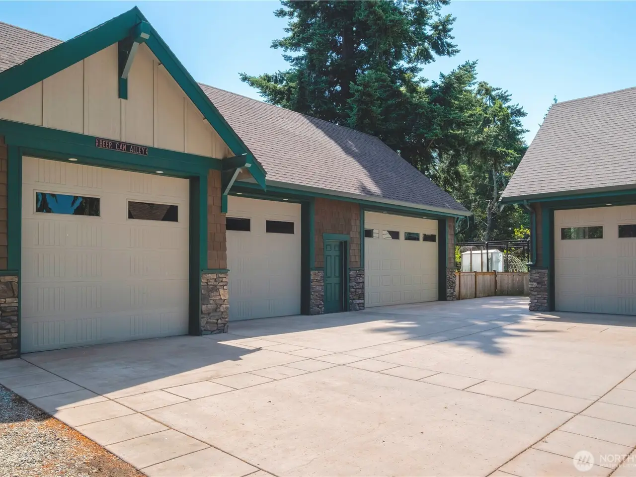 Don't miss this private lodge style sanctuary! The flat almost 1/2-acre lot with private drive & gated entry boasts a one-story 2014 custom-built home that is a car collector's dream! It has an oversized 3-car attached garage + 4-car detached shop w/1/2 bath & 10' doors for your RV/boat. The home has a grand covered entry that leads to sizable foyer w/adjacent office, vaulted ceilings & an open great room w/gas fireplace, dining area, & cook's kitchen. The luxurious primary suite features a spa-style bath. Step outside to the 422+ SF covered patio w/fireplace, built-in BBQ & TV wiring. Fenced yard w/fruit trees and a garden of raised beds- your urban farm to table awaits! Mature landscaping throughout. Sewer connected. Minutes from I-5 and 509.