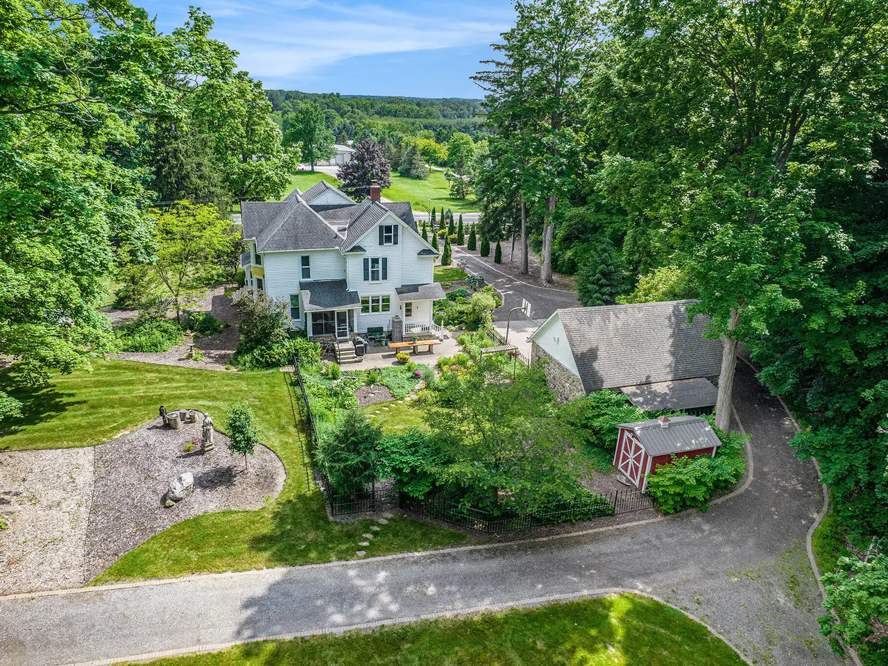 ''Sugar Maple Ridge'': Historical charm blends graciously with new-age comfort and quality in this classic Victorian home on gated 5 acres. *Minutes from Ann Arbor and Brighton and moments to Dexter. *Natural stone wraparound porch. *Spacious foyer with oversized case and base featuring elegant stairwell. *Light-filled living and dining rooms with coved detail. *Beautifully updated kitchen with copper sink, stainless appliances, and custom walnut counters opening onto family room/office with cozy gas fireplace. *Upstairs featuring 4 spacious bedrooms, 2 of which with original pine plank floors revealed, and 2 updated full baths with laundry. *Screen porch opening onto brick patio in secluded fenced back yard with garden house.*Stone 3 car garage. *2800 sq. ft. heated 5 car garage/workshop barn with studio apartment. *Fully restored stone outbuilding with half bath. Exterior completely repainted spring 2025.