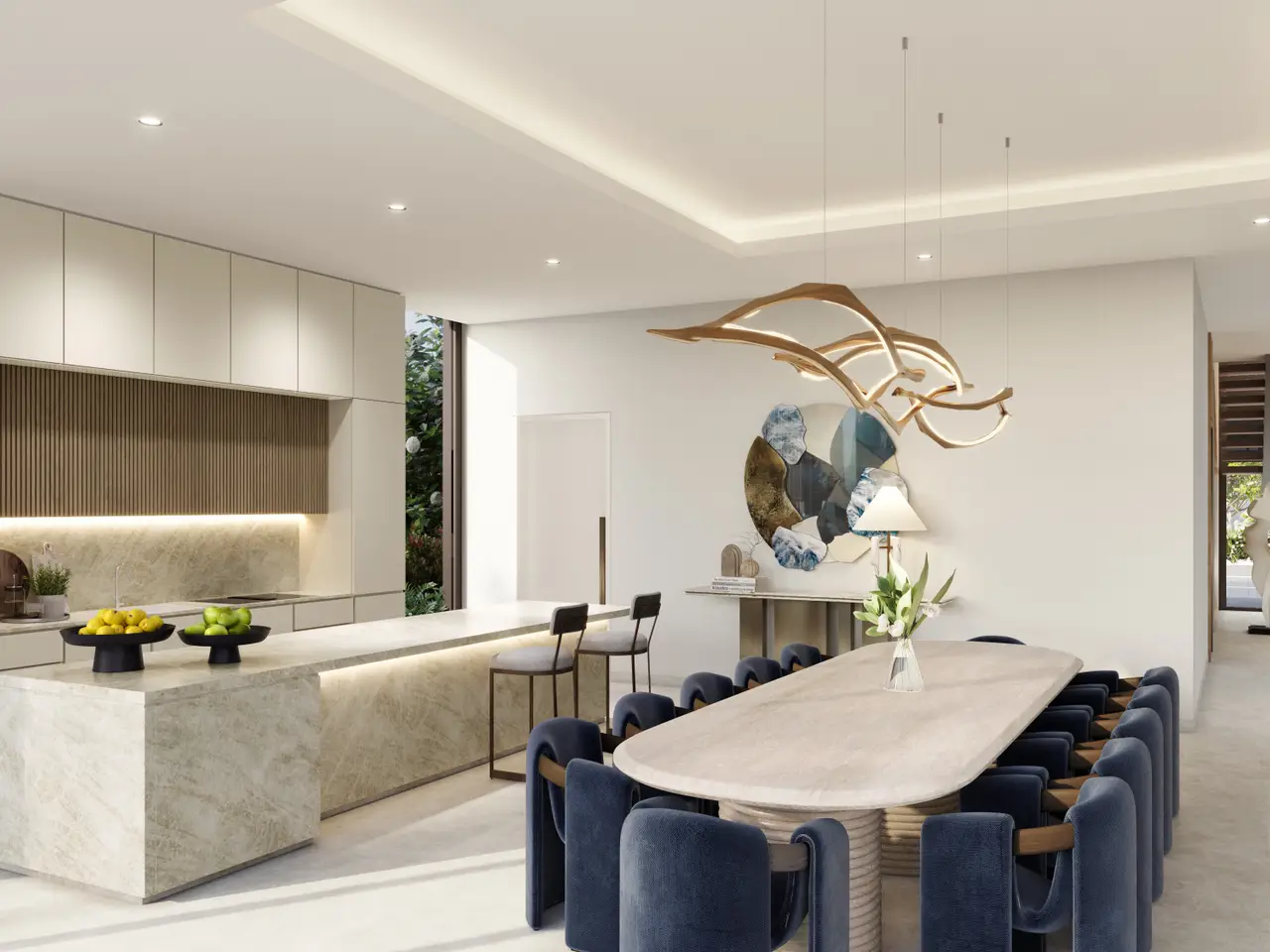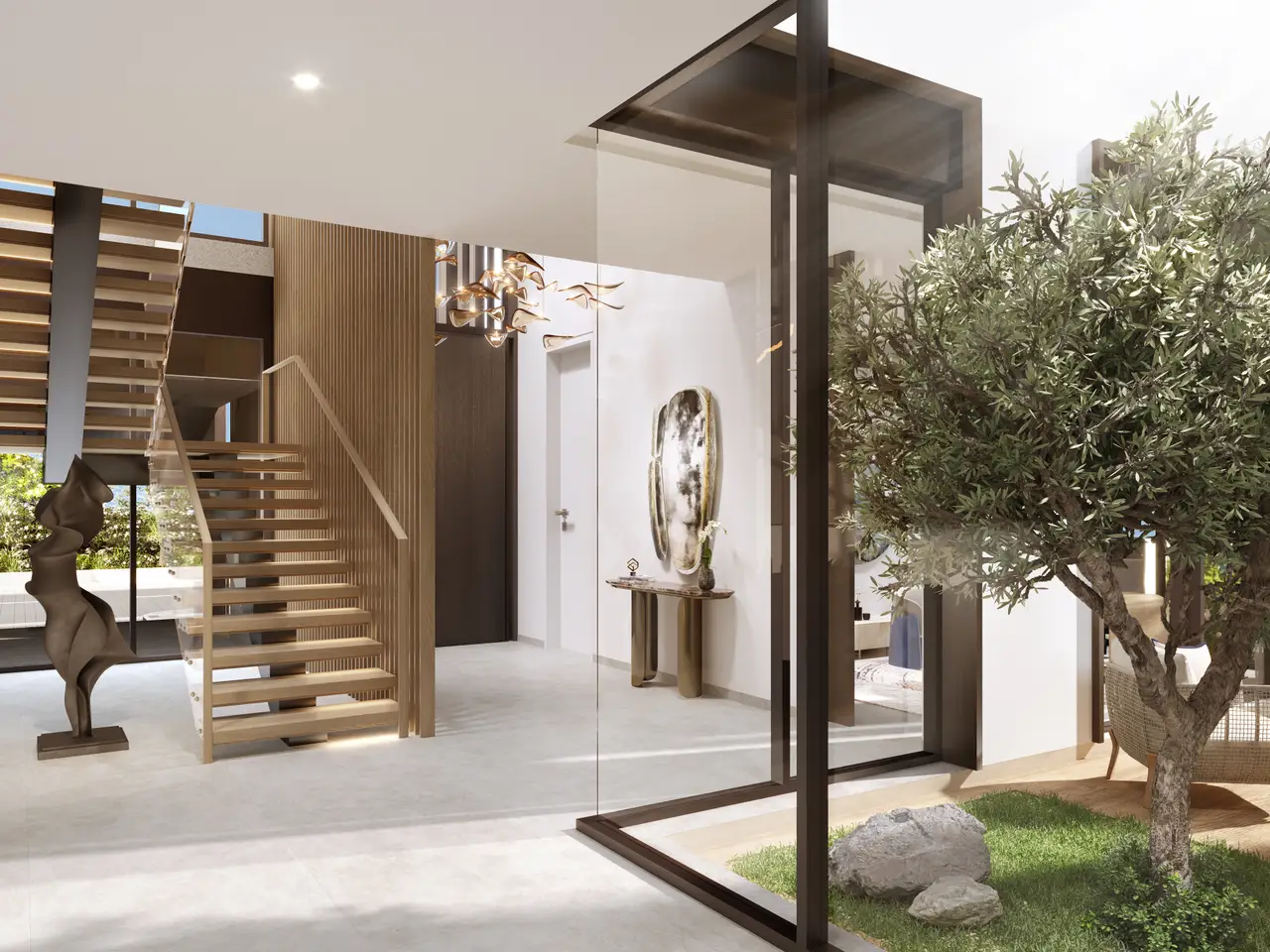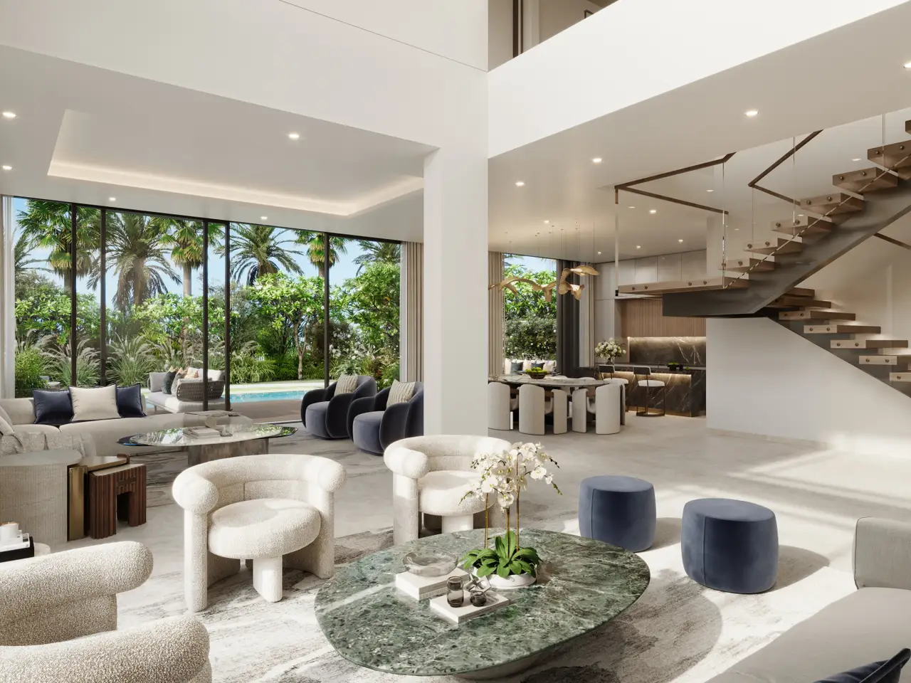 - Expansive glass doors connecting indoor spaces to private gardens and terraces
