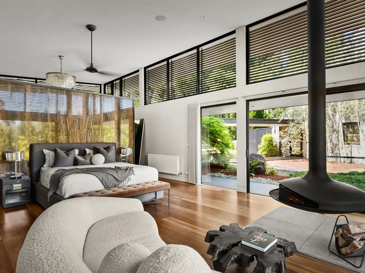 Feature chandeliers & zen suspended fireplace