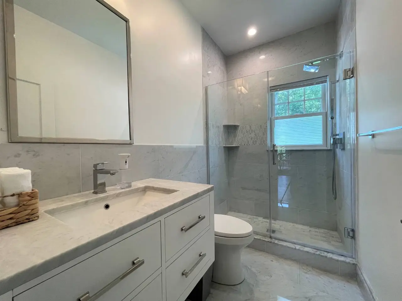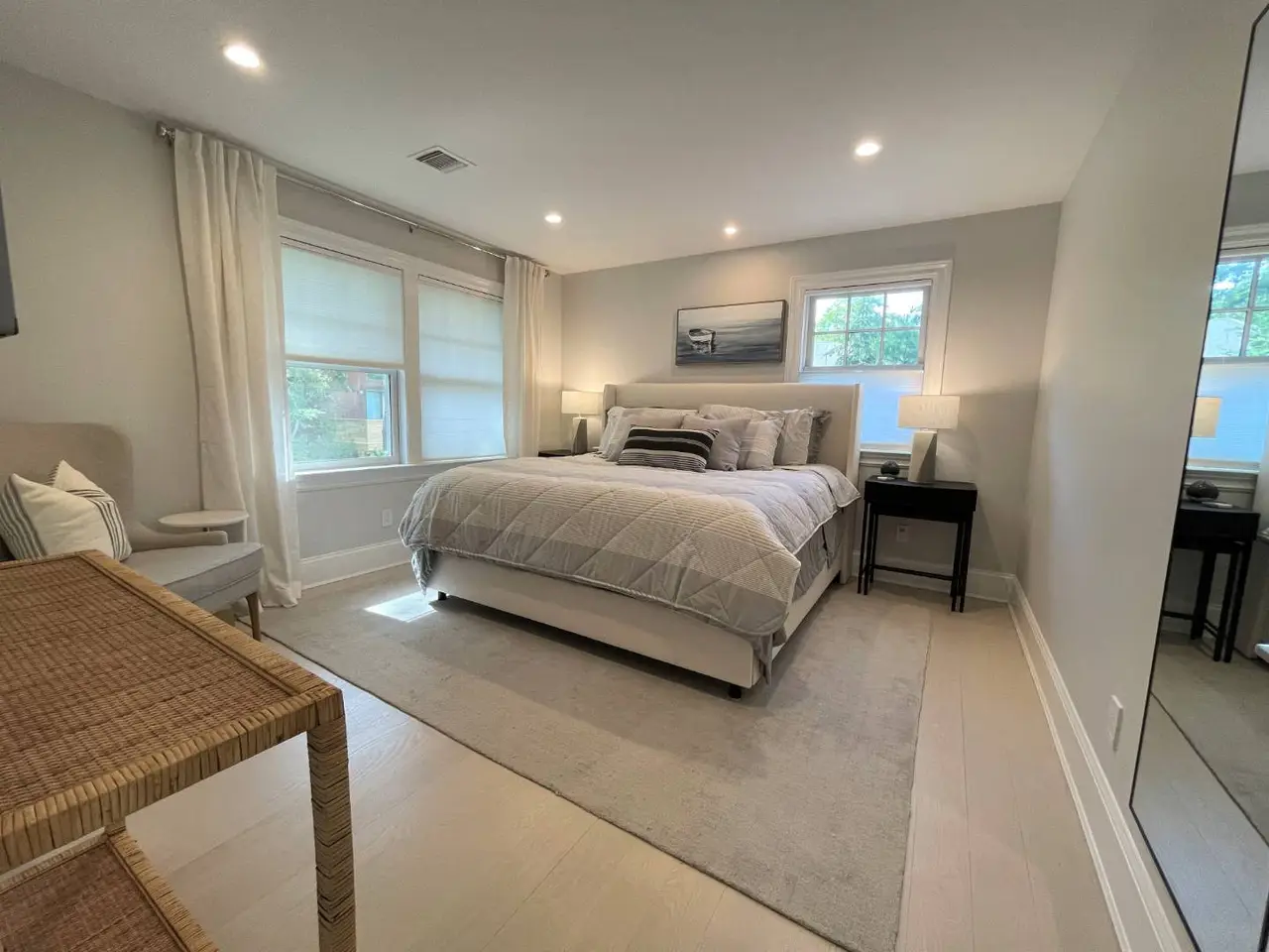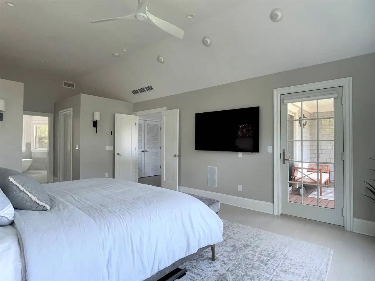 This brand new construction retreat with five bedrooms and four full baths in the Northwest part of East Hampton, has it all. Upon entering the home, to your immediate right is the sun room with vaulted ceiling and gas fireplace. The open floor plan combines a great room with a gas fireplace, dining area, and a gourmet kitchen with Wolf and Subzero appliances that leads to the backyard where a heated gunite pool is surrounded by a bluestone patio with a professional infrared BBQ grill, fire pit, eating area, lounge chairs, hot water outdoor shower, and a lush landscaping nightscape. The ensuite primary bedroom has a soaking tub with double vanities and a surround sound system. Amenities include central-air-conditioning, whole house audio system including outdoor, instant hot water plumbing, smart enabled lights throughout, surround sound system in the great room, large screen wall mounted TV in every room, Westin Hotel Heavenly mattress in all bedrooms (3 King, 1 Queen, and 2 Twins), a work from home office sitting area with balcony, and ping pong table in the lower level. All of this and access to Three Mile Harbor just across the street. Make this your Hampton home for the summer.
