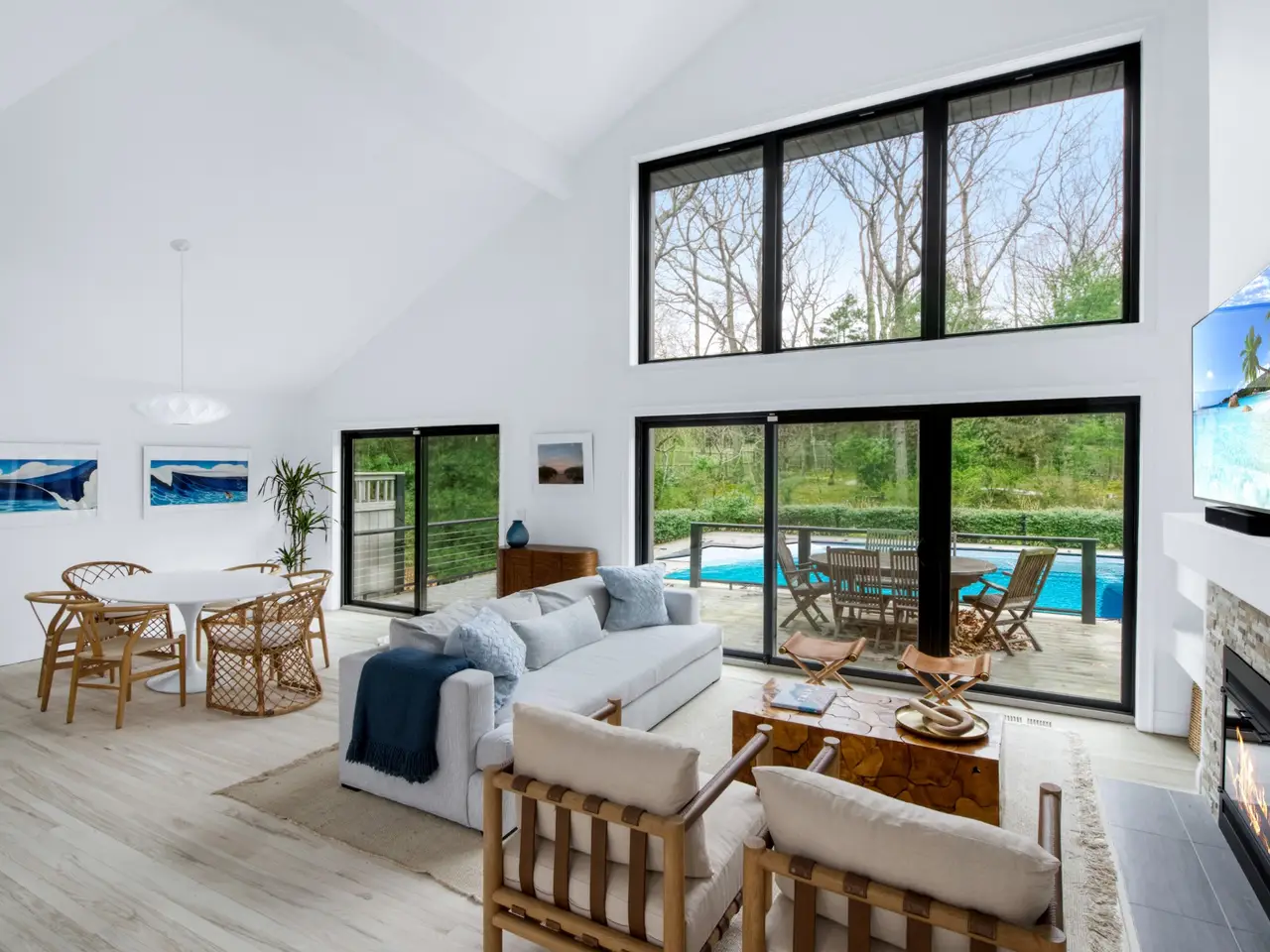 Located just moments away from Gardiners Bay, Three Mile Harbor and Sammy's Beach, this wonderful 2,100 square-foot contemporary home, set on a shy acre, is the perfect summer retreat. Upon entry, you are welcomed into a brilliant living and dining space with soaring ceilings, a wall of windows and sliders that lead to the backyard. A wood-burning fireplace centers the expansive room. The adjacent open-style kitchen offers a seamless gathering space for entertaining. The main level includes three guest bedrooms and two full baths. The primary bedroom is located on the second level and features a cathedral ceiling and large ensuite bath. The back of the property boasts a 20 x 40' heated pool surrounded by decking and a lushly landscaped yard.