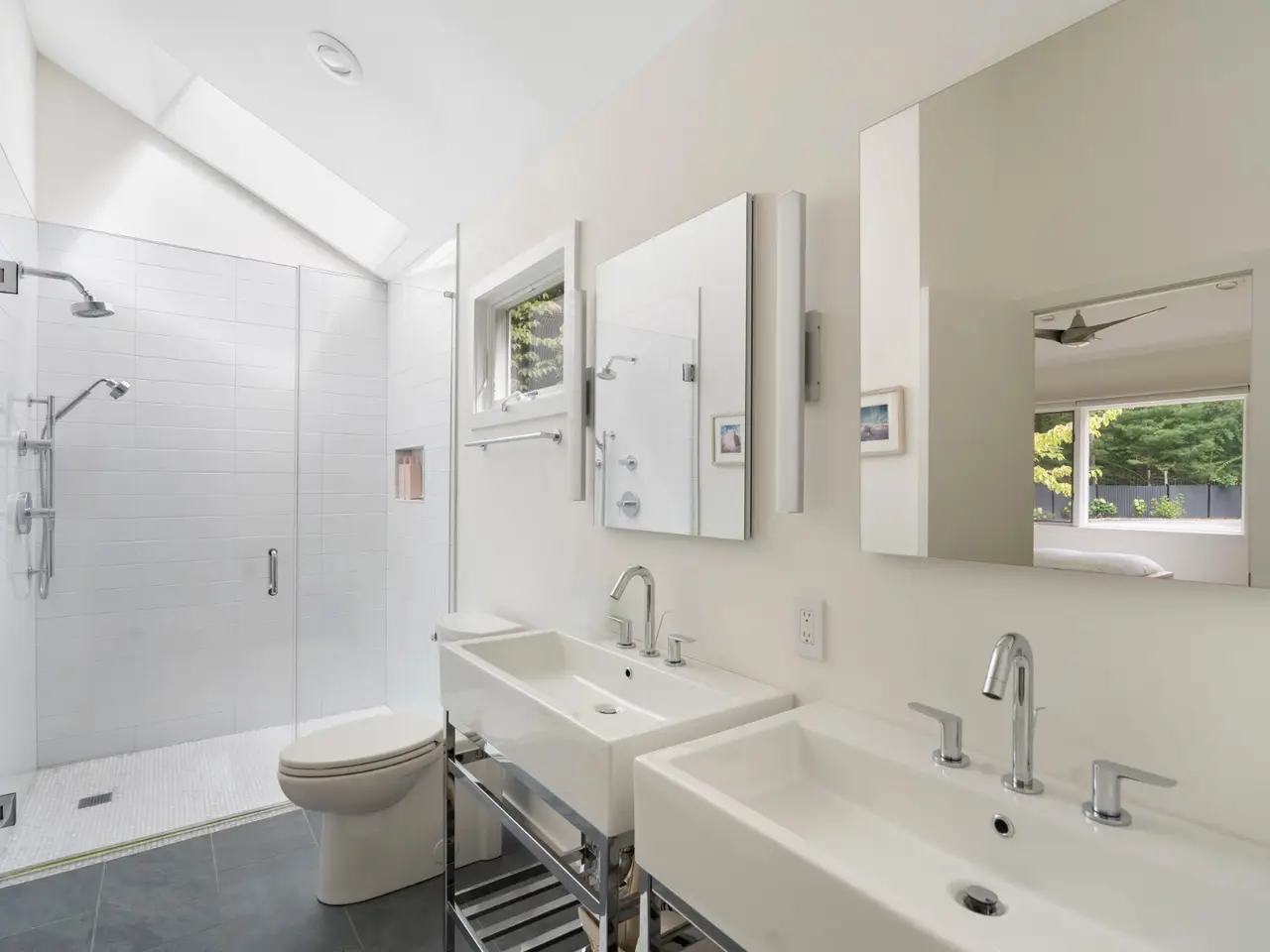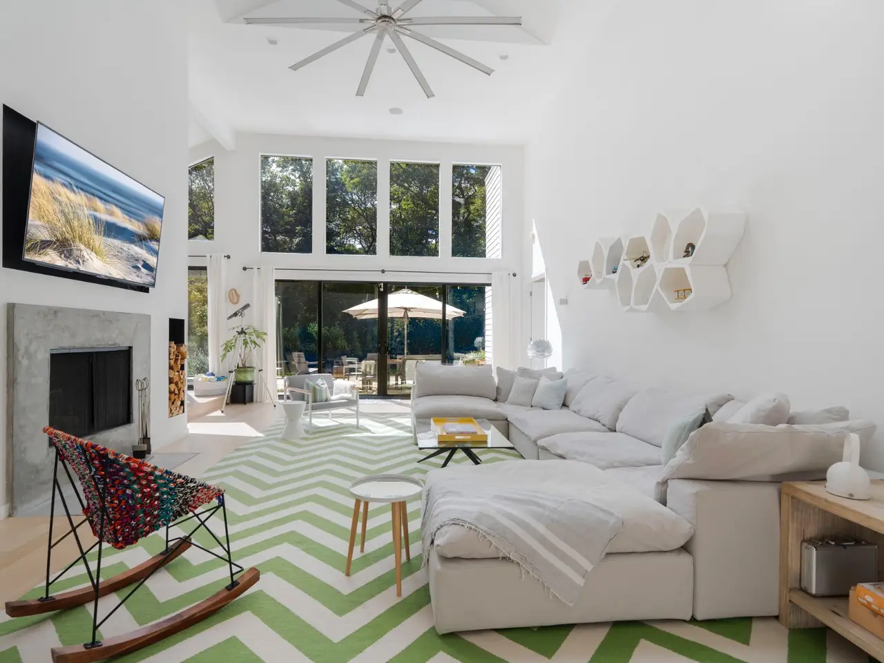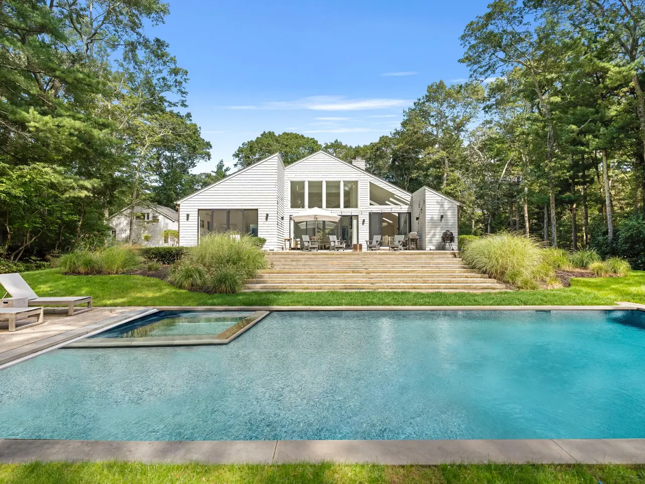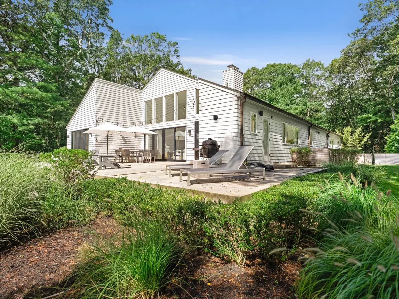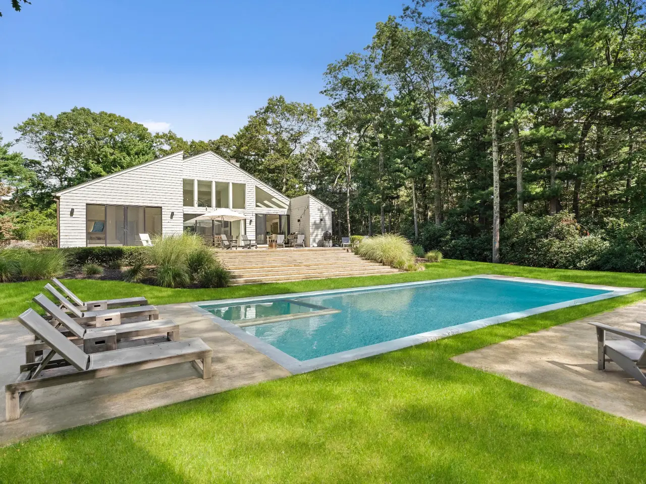 Open and bright, this wonderful contemporary home is just a short distance from East Hampton Village and ocean beaches. Located on a quiet street, the newly renovated 3,400 square-foot five bedroom, six bath residence features great windows and high ceilings in most rooms in addition to a large finished lower level with an additional 1,000 square feet of living space. A 20 x 40-foot heated pool and pool house are accessed by a dramatic grass stairway from the open living and dining area.