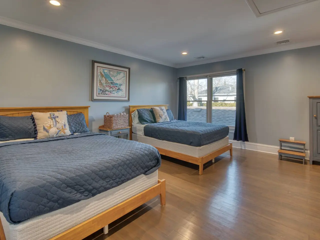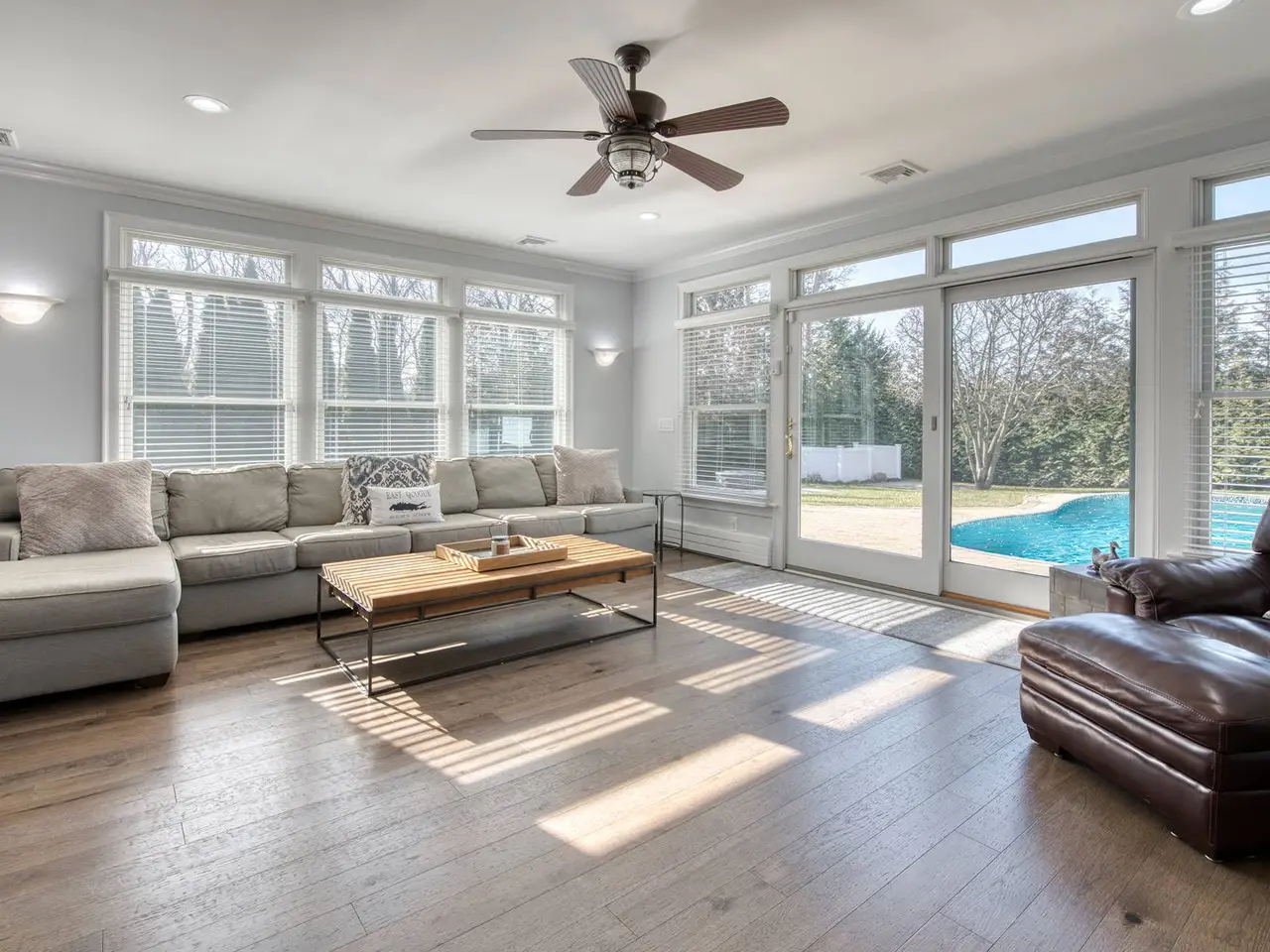 Enjoy resort-like living in this true vacation offering situated in Pine Neck Landing with a private beach. The retreat boasts six bedrooms, including two primary en suites (one on the main level), two living spaces, a chef's kitchen and dining area. The open floor plan affords a very airy and bright interior with wonderful natural light. On the second floor, there are three bedrooms, one bathroom, and a primary en suite. On the lower level is the game room with a small theater area with very comfortable seating, foosball and a professional pool table. A great place to be on a rainy summer afternoon. There is a Sonos sound system throughout the interior and exterior spaces. The home features wood flooring with tiles in the bathrooms. The outdoors is summer enjoyable with a huge free-form, heated pool surrounded by pavers, enough lawn for outdoor games, a designated fire pit area, and an outdoor enclosed shower. There are plenty of lounging areas and spaces for dining al fresco. Let's not forget the summer toys, this rental is equipped with Kayaks, paddle boards, bicycles, and a ping pong table. Don't miss viewing this excellent seasonal rental.