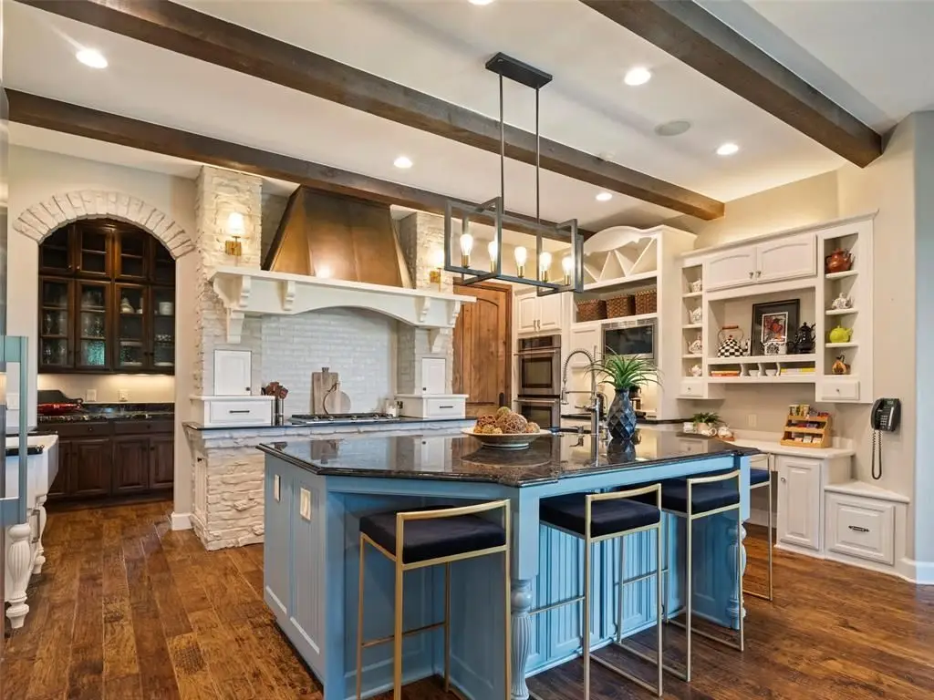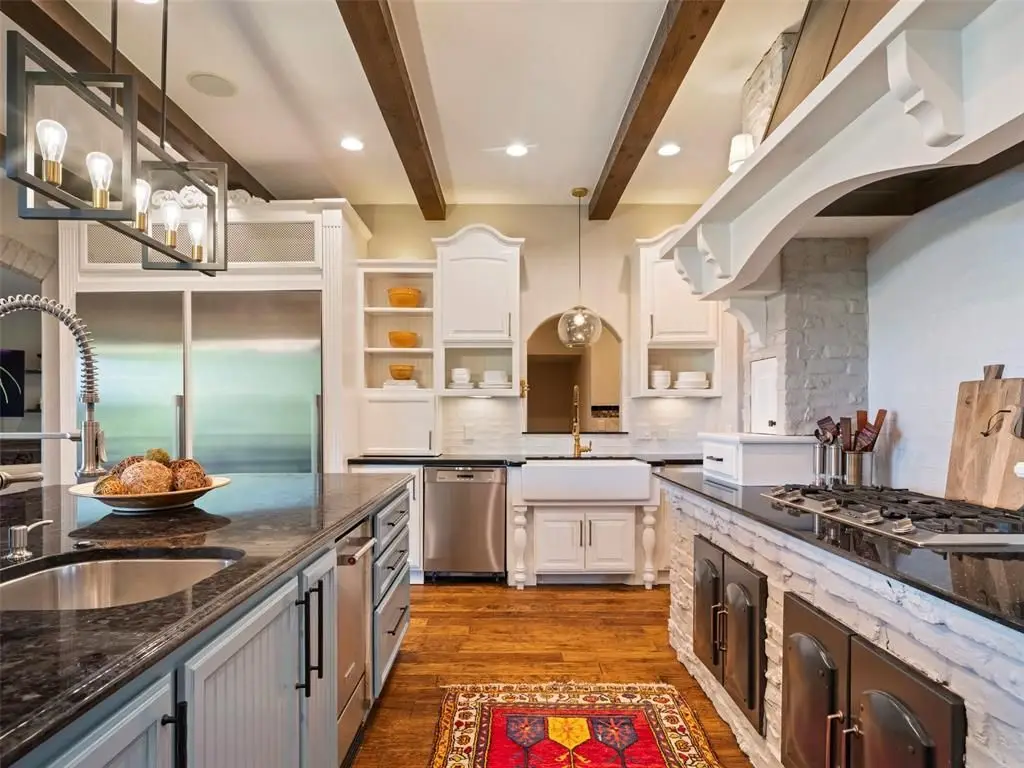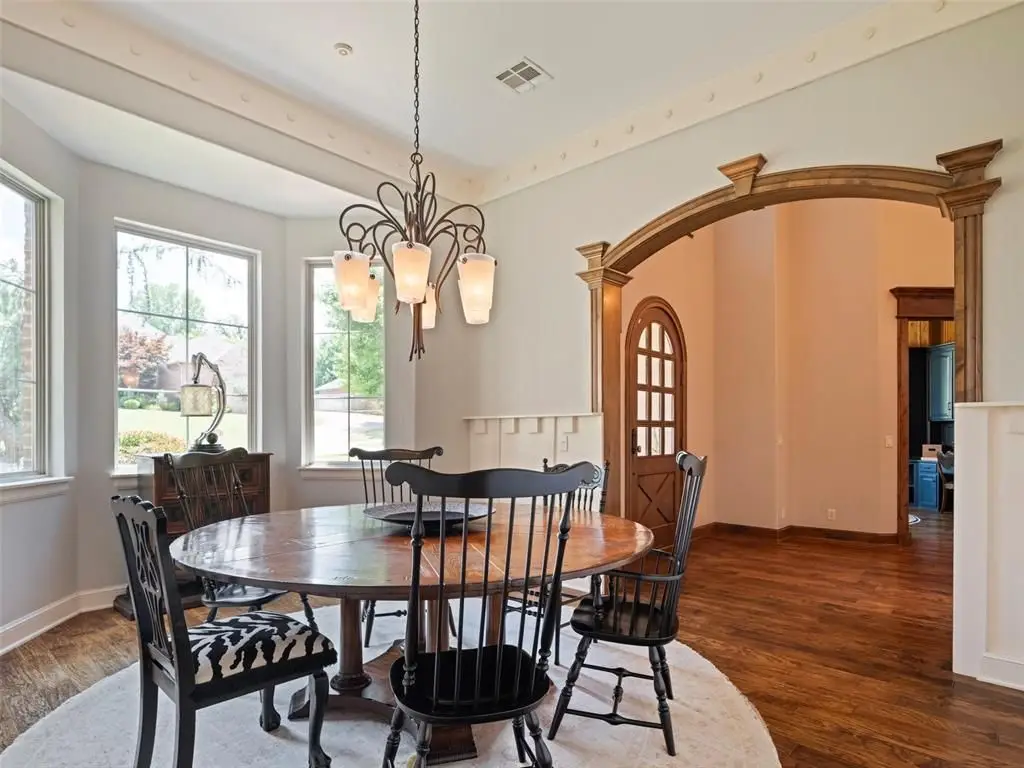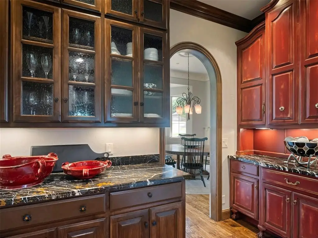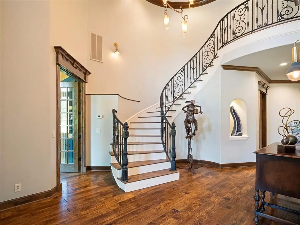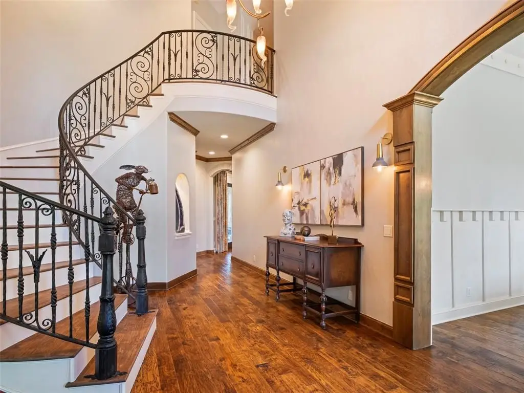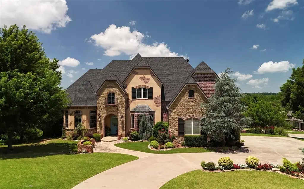 Nestled on a rare 77-acre corner lot in East Edmond's sought-after Creek Bend neighborhood this stunning Old English Tudor exudes timeless elegance and exceptional craftsmanship Mature landscaping and a stately presence set the tone for the grandeur within Upon entering the home you're welcomed into a dramatic foyer with soaring 20-foot ceilings and a sweeping custom iron staircase flanked by a richly appointed formal study and a refined dining room The study is a true showpiece wrapped in floor-to-ceiling stained woodwork and featuring a built-in desk bookshelves and a hidden door leading to a private desk area with discreet access to the primary suite The dining room is graced with custom wood moldings and a charming bay window overlooking the manicured front lawn The chef's kitchen is a dream for both everyday living and entertaining outfitted with double ovens a gas range a full-size Meile refrigerator and freezer and a built-in ice maker A Butler's pantry with custom cabinetry connects seamlessly to the formal dining space adding to the homes effortless flow The main living room with its warm stone fireplace and backyard views opens to a spacious game room complete with a bar and a private theater With a total of 6 living areas throughout there is space for everyone and every occasion The luxurious primary suite offers a serene retreat with treetop views dual vanities a makeup vanity jetted soaking tub oversized walk-in shower and an expansive walk-in closet Upstairs you'll find 3 generously sized bedrooms each with its own en suite bathroom and abundant walk-in closets The walkout basement adds even more versatility with its perfectly suited playroom with a built-in desk a workout room an additional bedroom with an en suite bath and provides access to an indoor sports court ideal for tennis pickleball or basketball This extraordinary home blends luxury functionality and entertainment in one impressive home