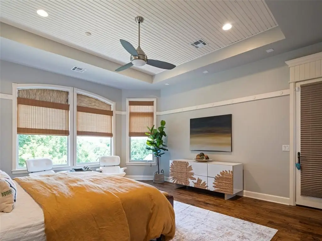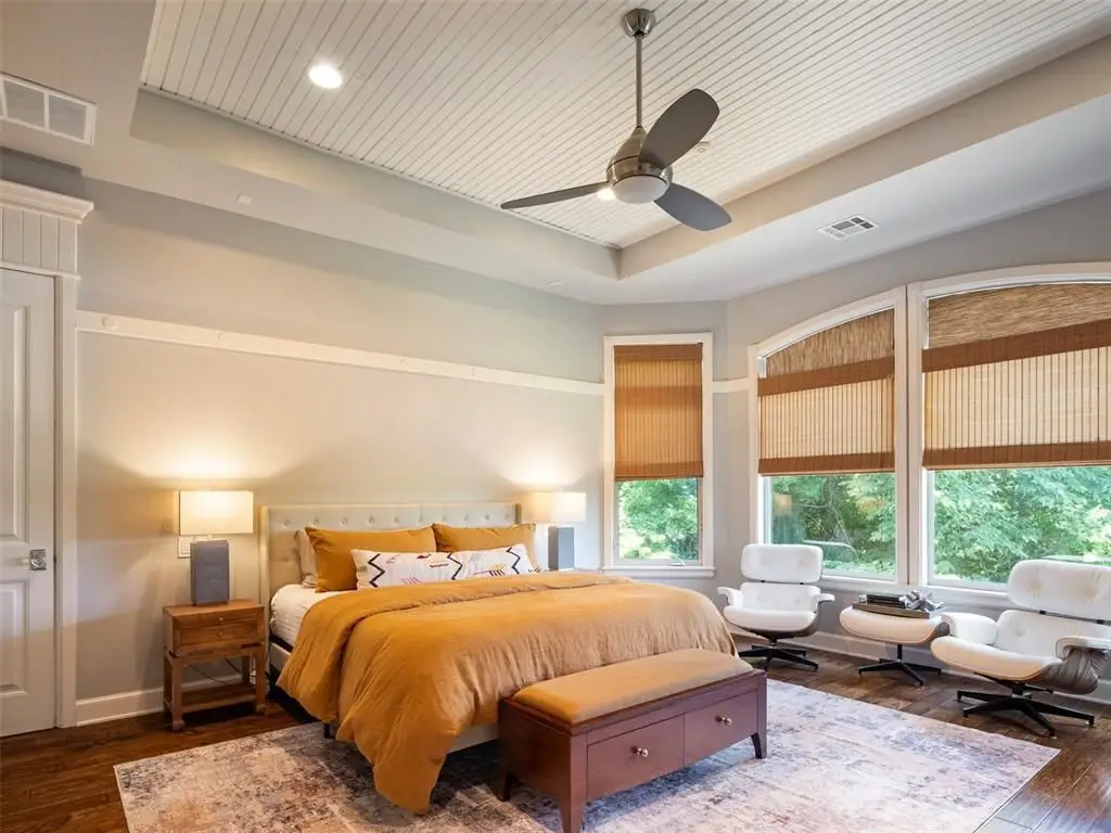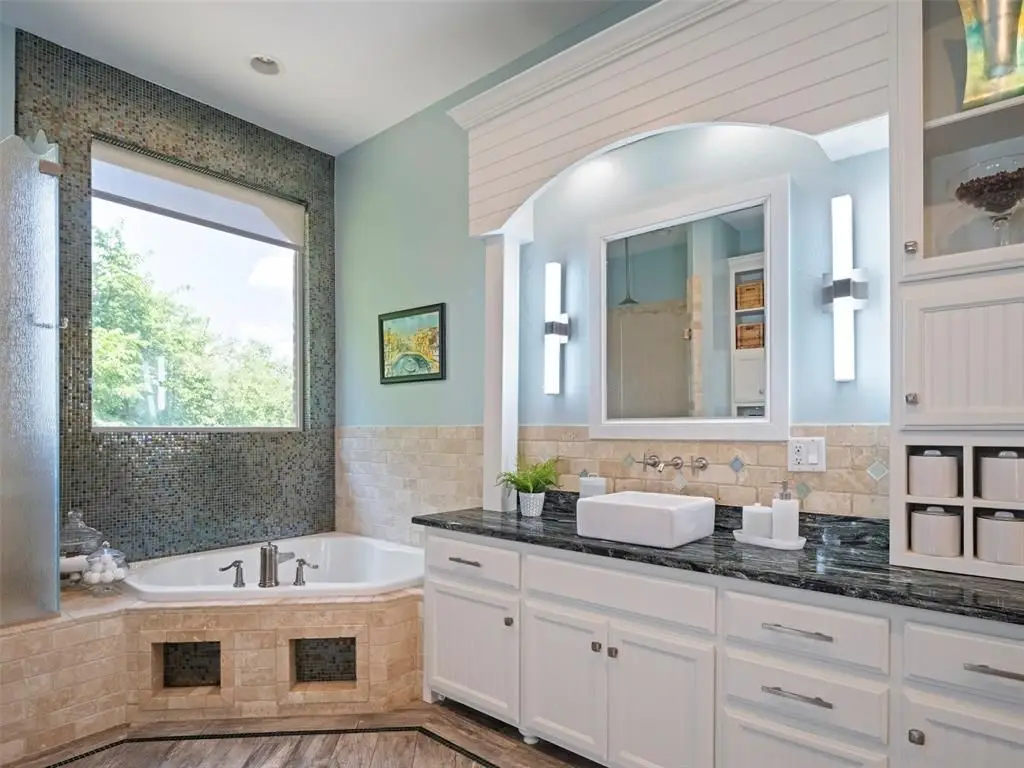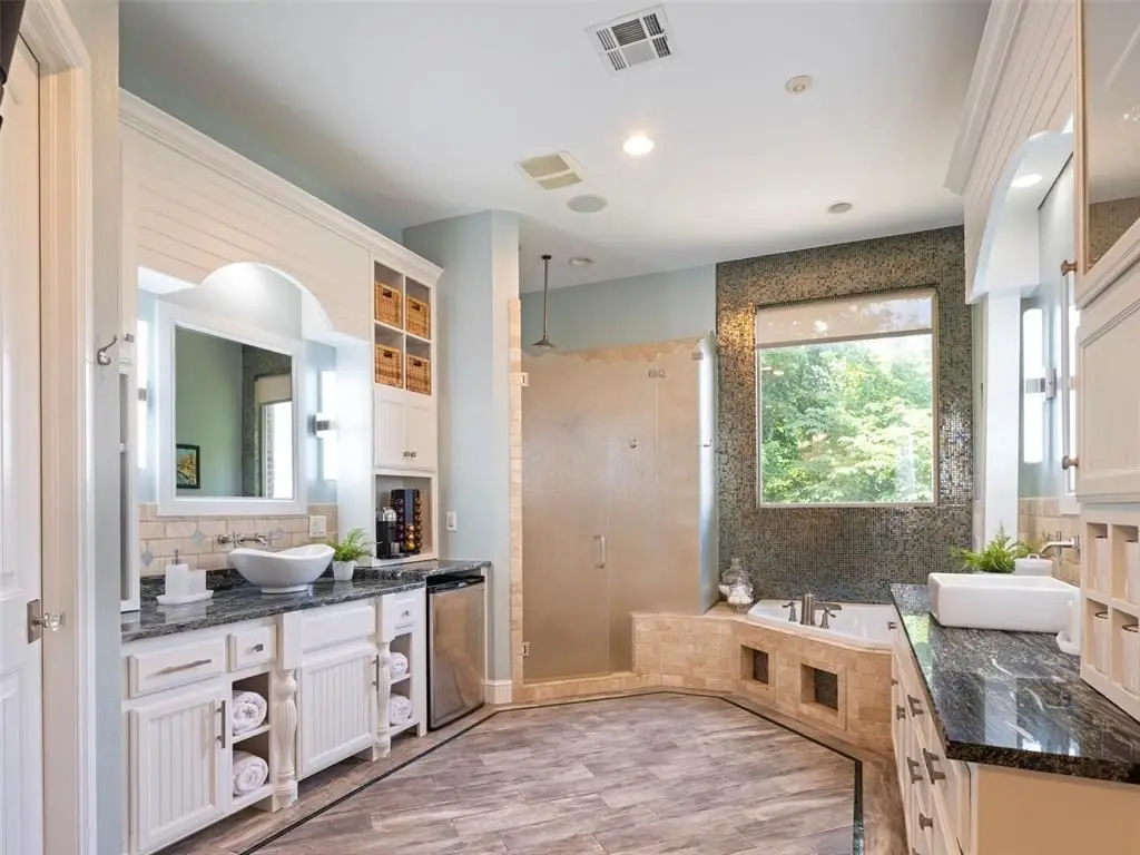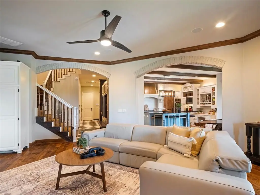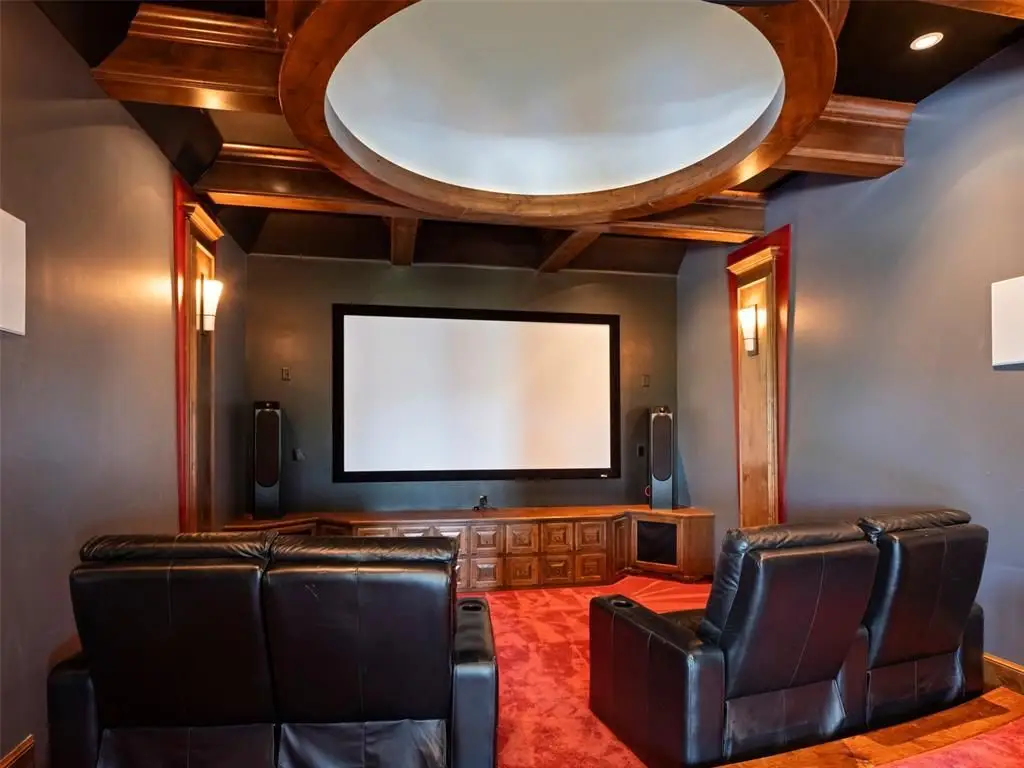 Nestled on a rare 77-acre corner lot in East Edmond's sought-after Creek Bend neighborhood this stunning Old English Tudor exudes timeless elegance and exceptional craftsmanship Mature landscaping and a stately presence set the tone for the grandeur within Upon entering the home you're welcomed into a dramatic foyer with soaring 20-foot ceilings and a sweeping custom iron staircase flanked by a richly appointed formal study and a refined dining room The study is a true showpiece wrapped in floor-to-ceiling stained woodwork and featuring a built-in desk bookshelves and a hidden door leading to a private desk area with discreet access to the primary suite The dining room is graced with custom wood moldings and a charming bay window overlooking the manicured front lawn The chef's kitchen is a dream for both everyday living and entertaining outfitted with double ovens a gas range a full-size Meile refrigerator and freezer and a built-in ice maker A Butler's pantry with custom cabinetry connects seamlessly to the formal dining space adding to the homes effortless flow The main living room with its warm stone fireplace and backyard views opens to a spacious game room complete with a bar and a private theater With a total of 6 living areas throughout there is space for everyone and every occasion The luxurious primary suite offers a serene retreat with treetop views dual vanities a makeup vanity jetted soaking tub oversized walk-in shower and an expansive walk-in closet Upstairs you'll find 3 generously sized bedrooms each with its own en suite bathroom and abundant walk-in closets The walkout basement adds even more versatility with its perfectly suited playroom with a built-in desk a workout room an additional bedroom with an en suite bath and provides access to an indoor sports court ideal for tennis pickleball or basketball This extraordinary home blends luxury functionality and entertainment in one impressive home
