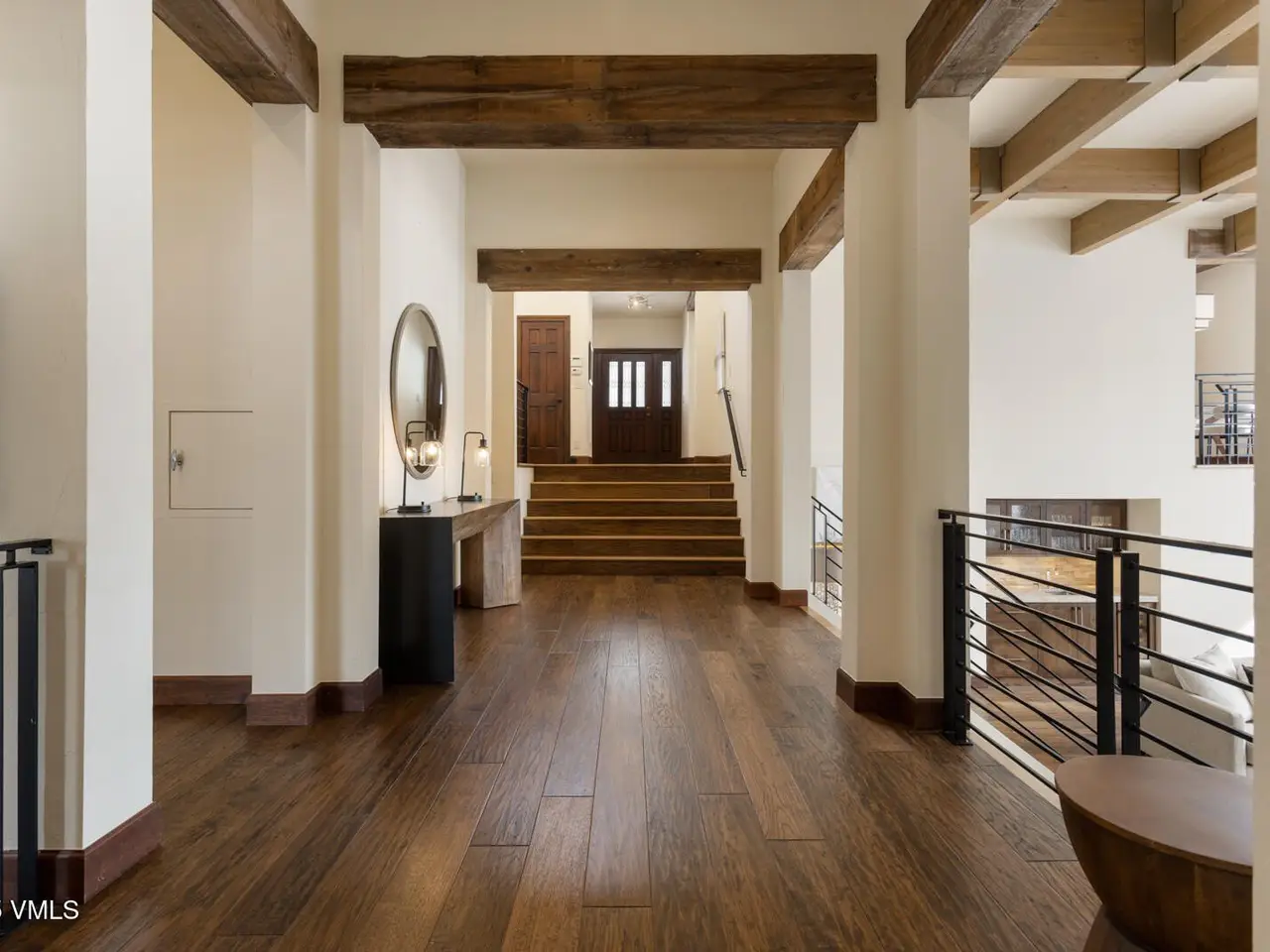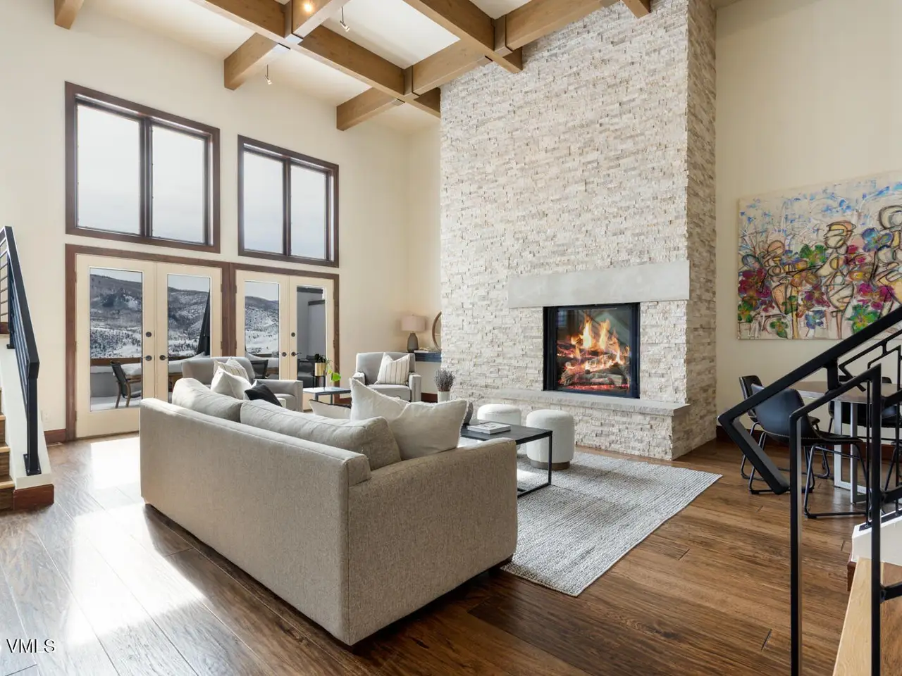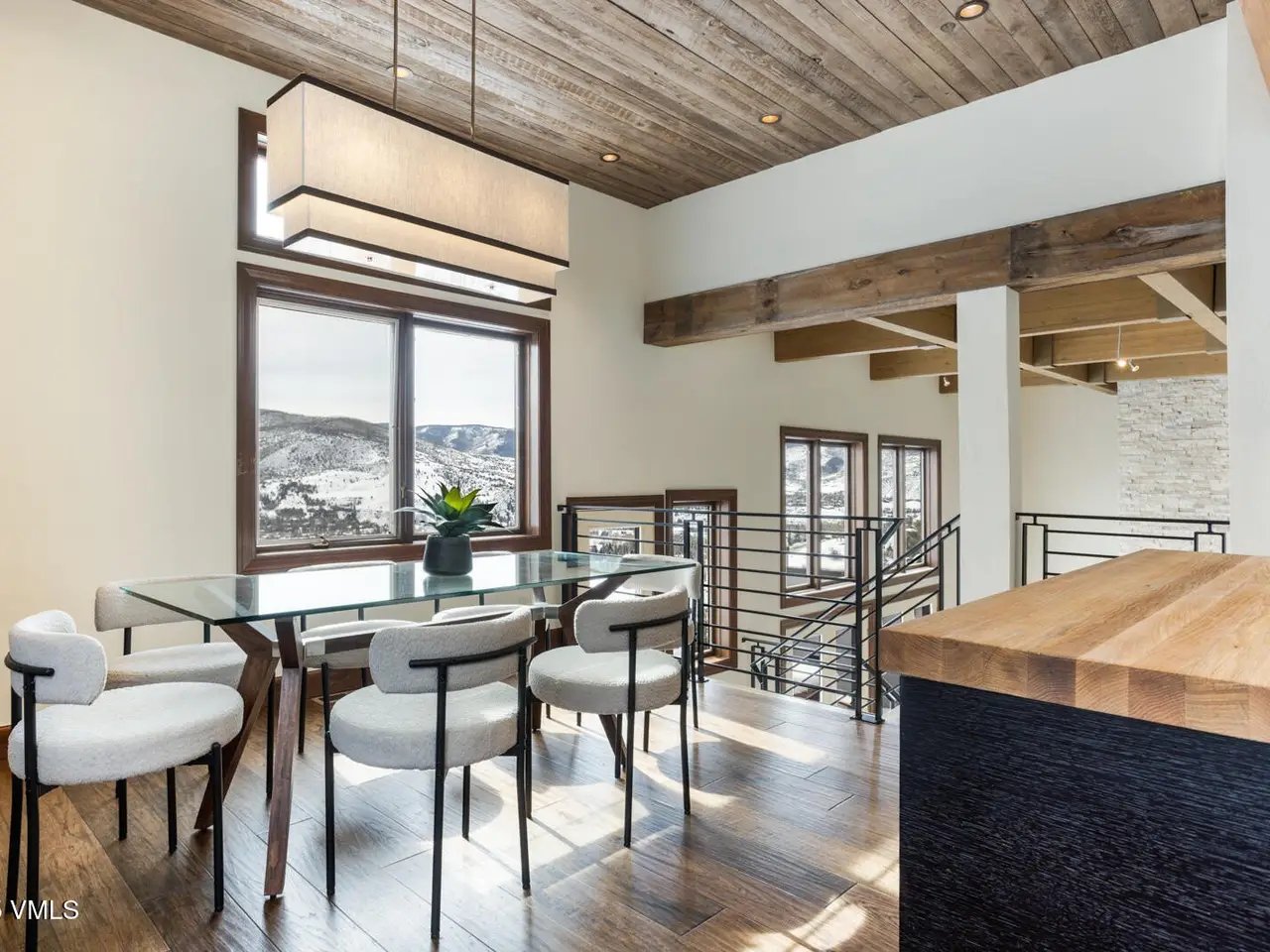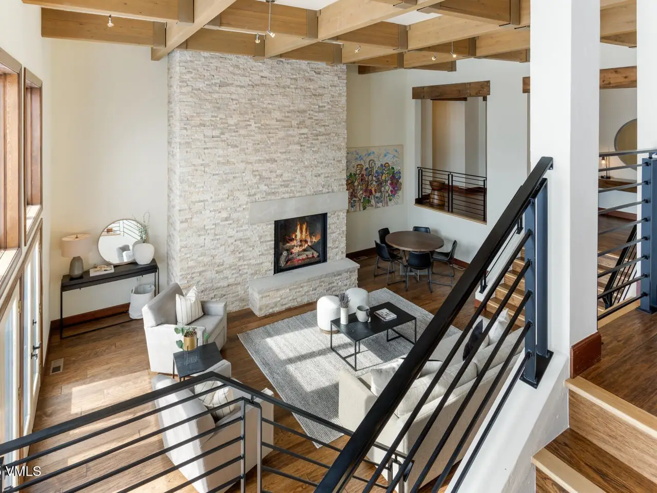- Vaulted ceilings with wood beams