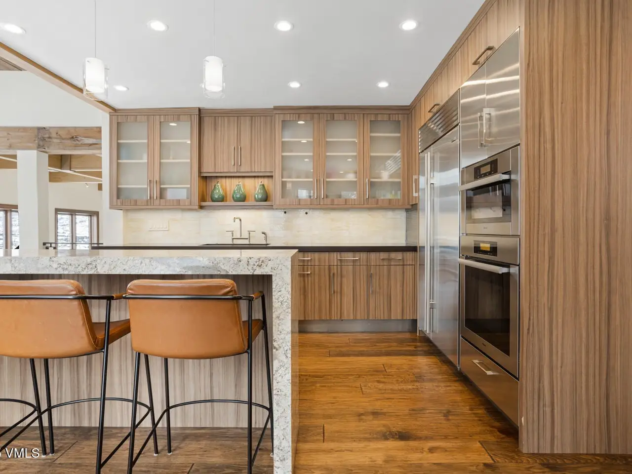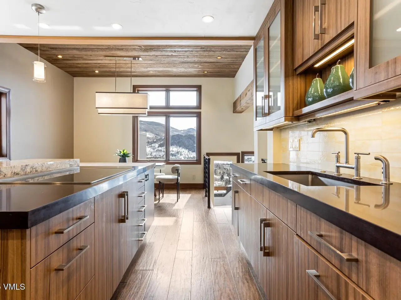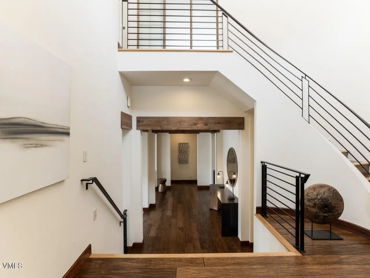 - Vaulted ceilings with wood beams