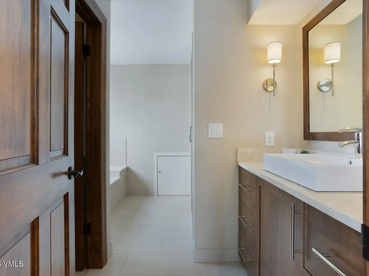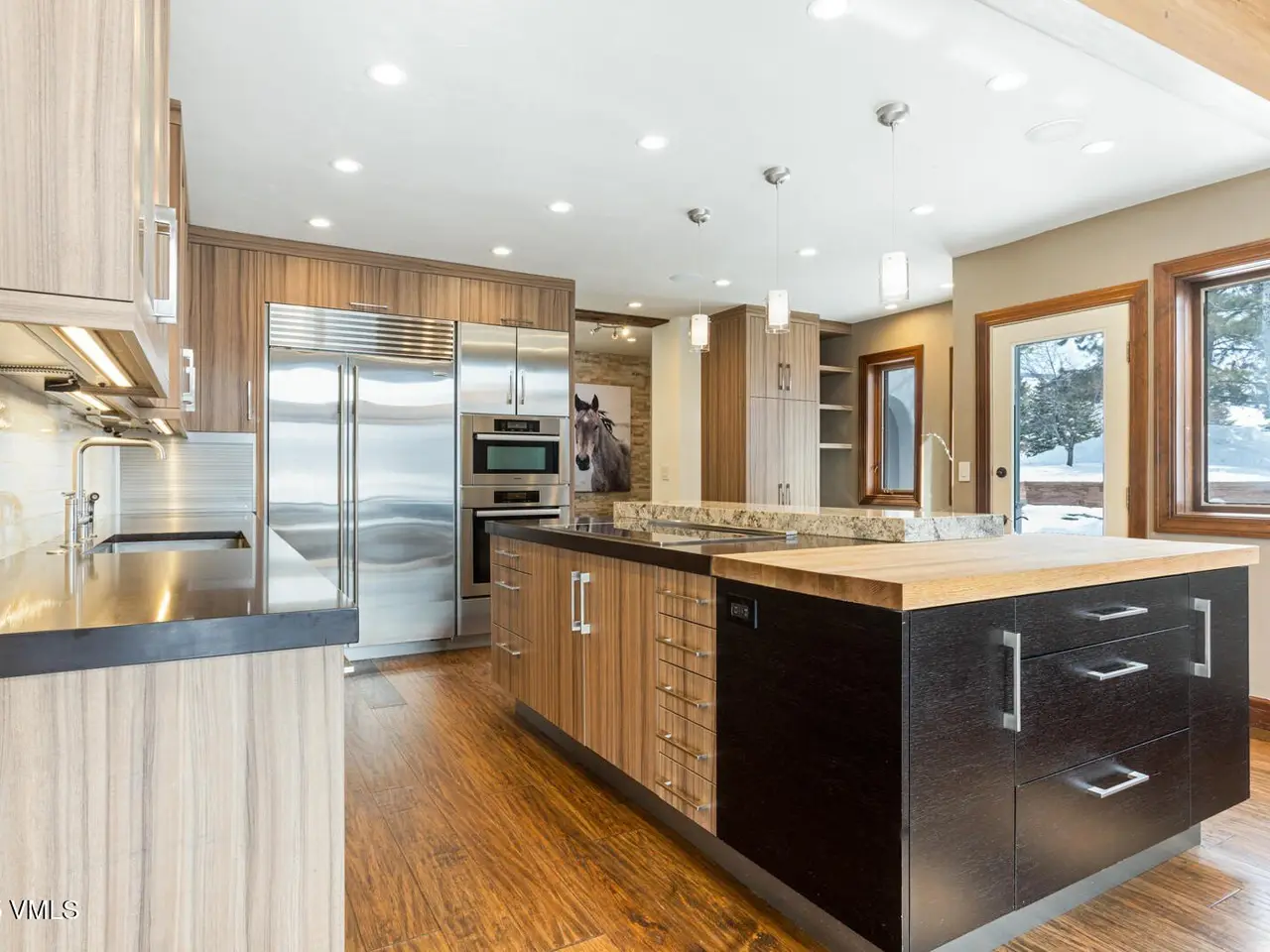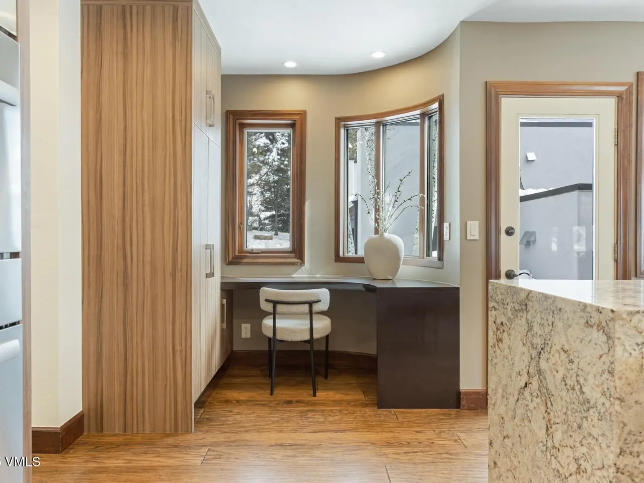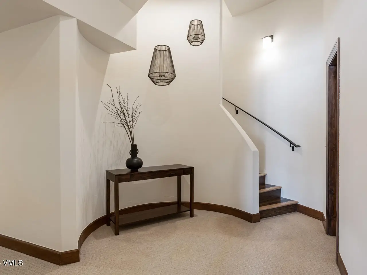 - Vaulted ceilings with wood beams