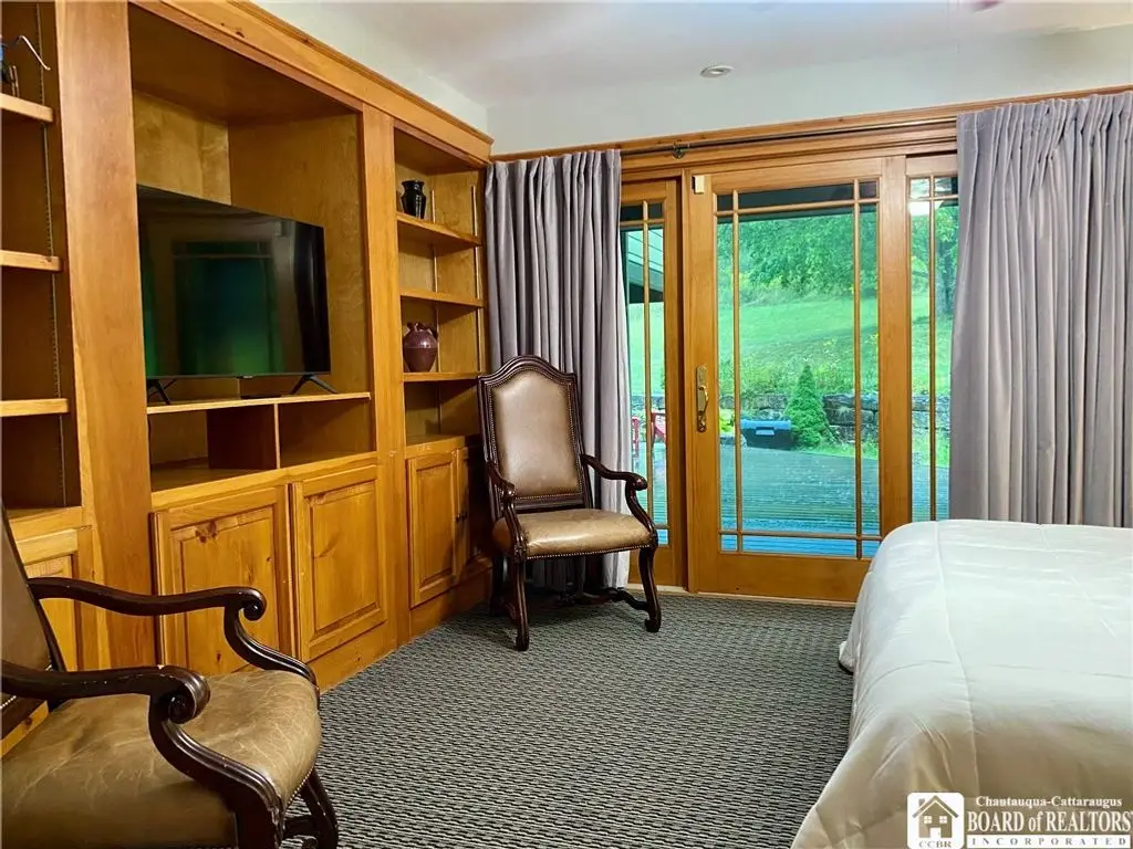Tucked away on 20 acres of land, just 1 mi. from the Village of Ellicottville and 10 minutes from skiing, this unique home offers the space you need and the amenities you deserve. 5600+ sq/ft of interior space includes a spacious primary suite on the main floor, a spacious junior suite (with balcony overlooking the pond and slopes at Holiday Valley), 5 guest rooms, for a total of 7 bedrooms and 6 full baths. The centerpiece of the house is the great room, with its vaulted ceilings, towering stone fireplace (1 of 3), wall of windows, wet bar, and magnificent chandelier. In-floor radiant heat keeps the large space feeling cozy in the coldest weather. Multiple doors lead out to deck that wraps around 3 sides of the house, including a covered porch in back with an outdoor fireplace. Custom, chef's kitchen, equipped to feed a crowd, with a 6-burner Blue Star range, double ovens, two warming drawers, an extra deep farmhouse sink (instant hot water), 20+ ft of granite countertop, large island workspace/breakfast bar, & plenty of storage. Lower level includes a mudroom & 2 1/2 car garage. Laundry room, firewood-storage room, party-sized wet bar & seating area with a w/b fireplace & home theater system (projector, 110" screen, high-end surround sound system (professionally tuned for the space), and rack-mounted entertainment system - except for Roku and gaming consoles - included with the house). 17 zones of separately-controlled radiant, hot-water heat. 2 central Unico-type air conditioning systems. A whole-home generator. Alarm system, with sensors throughout the house. This 20 acre property includes 2 ponds (1 swimmable), an apple orchard (also plenty of wild apple trees, berry bushes, etc.), woods (mostly maple), and a separate, climate controlled, toy garage/workshop. Additional 3000 sq/ft "barn" with finished 2nd floor!