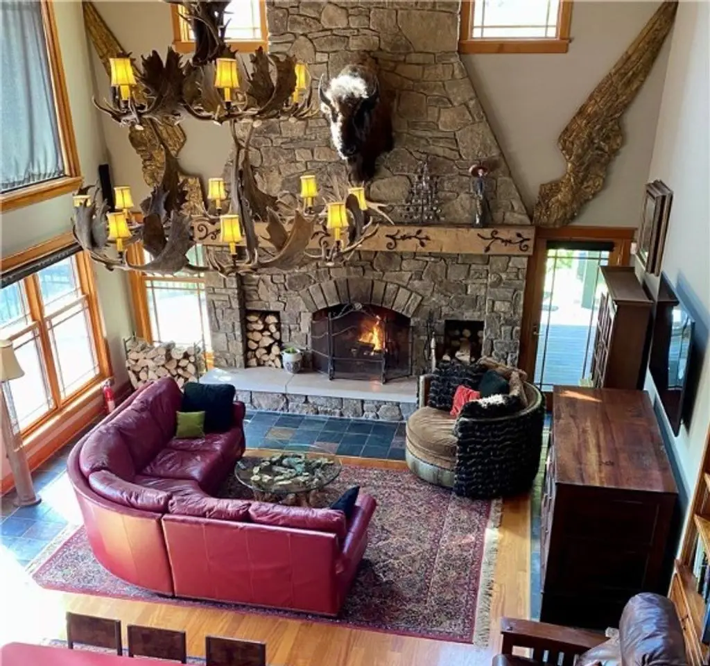 Vaulted ceilings with towering stone fireplace
