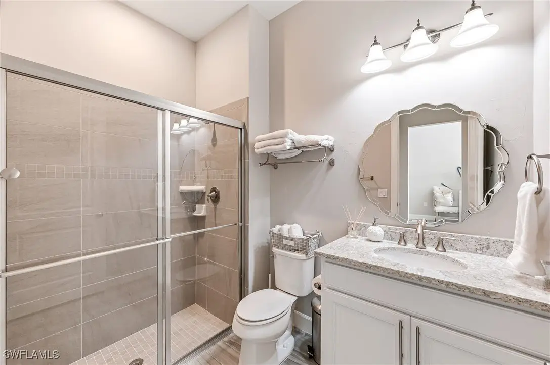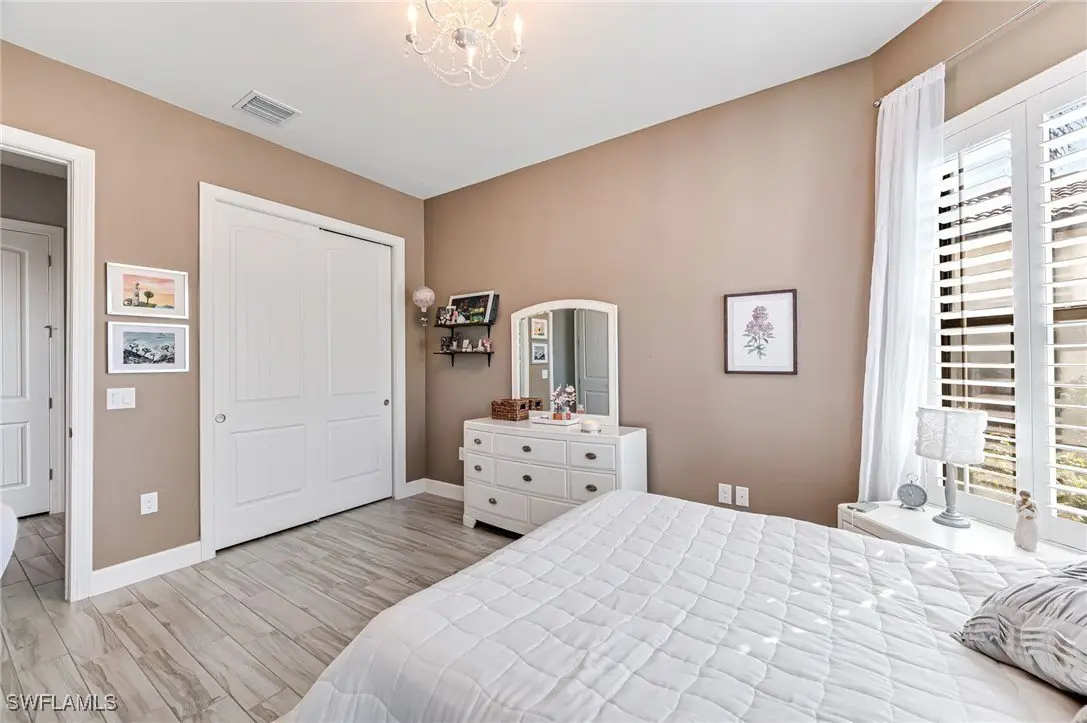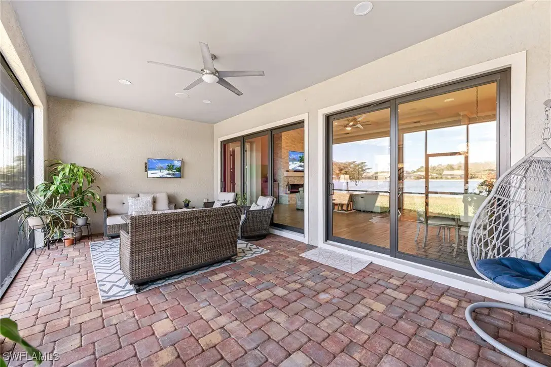 Welcome to this rarely available Stonewater home in the desirable Corkscrew Shores Community. Situated on an oversized lakefront lot, this is one of the most sought-after floor plans in the area. This home offers 5 bedrooms, 4.5 bathrooms and a 3-car extended garage. You will love everything about this home with all the elegant modern upgrades. Modern porcelain tile floors, oversized kitchen island with beautiful quartz counter tops, custom fireplace, crown molding, plantation shutters, high coffered ceilings, high end kitchen appliances are just some of the highlights. This home also has a new water heater, whole house water softener with reverse osmosis in the kitchen, impact doors & windows, alarm system, and built Sonos speakers. The expansive backyard has plenty of room for a pool. Lania has a bathroom, and an outdoor kitchen can easily be added. With the kitchenette in the upstairs loft, this is perfect place for entertaining or hosting guests. The garage has 6 overhead racks for additional storage and organization. Corkscrew Shores is a gated, resort-style community surrounded by preserves and a 240-acre lake and features a spectacular amenity center with a restaurant and bar. Residents enjoy activities, entertainment, events and sports including pickleball, tennis, bocce, fitness center, movement studio, children's play area, kayak/canoe launch, and fishing pier and more! Conveniently located between Naples & Fort Myers just minutes from shopping, dining, RSW airport, FGCU, golf courses, entertainment at sports and more!