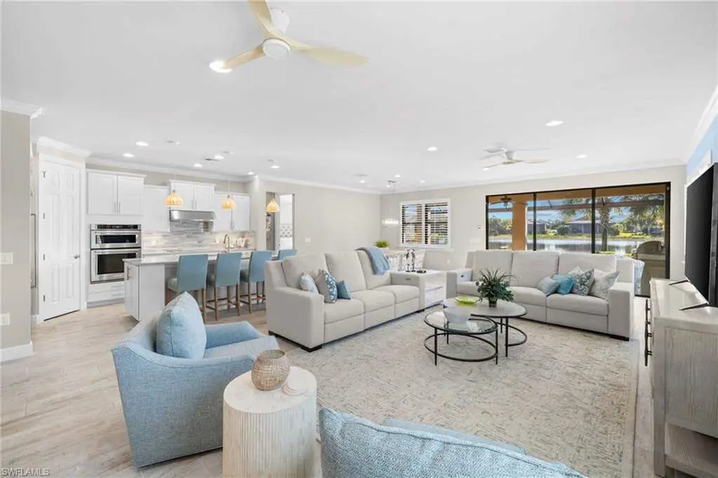 Experience resort-style living in the highly sought-after Corkscrew Shores community with this stunning home! This immaculate property boasts over 3,000 sq ft of light-filled living space, featuring 4 bedrooms, an office with French doors, and 3 full baths. The open floor plan highlights an attractive white kitchen with quartz countertops, a tumbled marble backsplash, and a large island perfect for entertaining. Enjoy seamless indoor-outdoor living with sliding glass doors leading to a covered lanai, outdoor kitchen, and screened-in heated pool with spa-all overlooking the sparkling lake and breathtaking SW sunset views. The second-floor flex room provides privacy for guests, while the owner's retreat offers serene water views, a spa-like ensuite bath, and a spacious walk-in closet. Additional upgrades include crown molding, wood-look tile floors, custom wood shelving, plantation shutters, and a surround sound system. Corkscrew Shores amenities include a zero-edge pool, on-site dining, tennis, pickleball, fitness center, and more-all with no CDD and no hurricane damage. Located close to FGCU, the airport, shopping, dining, and healthcare, this is your chance to enjoy Florida paradise!
