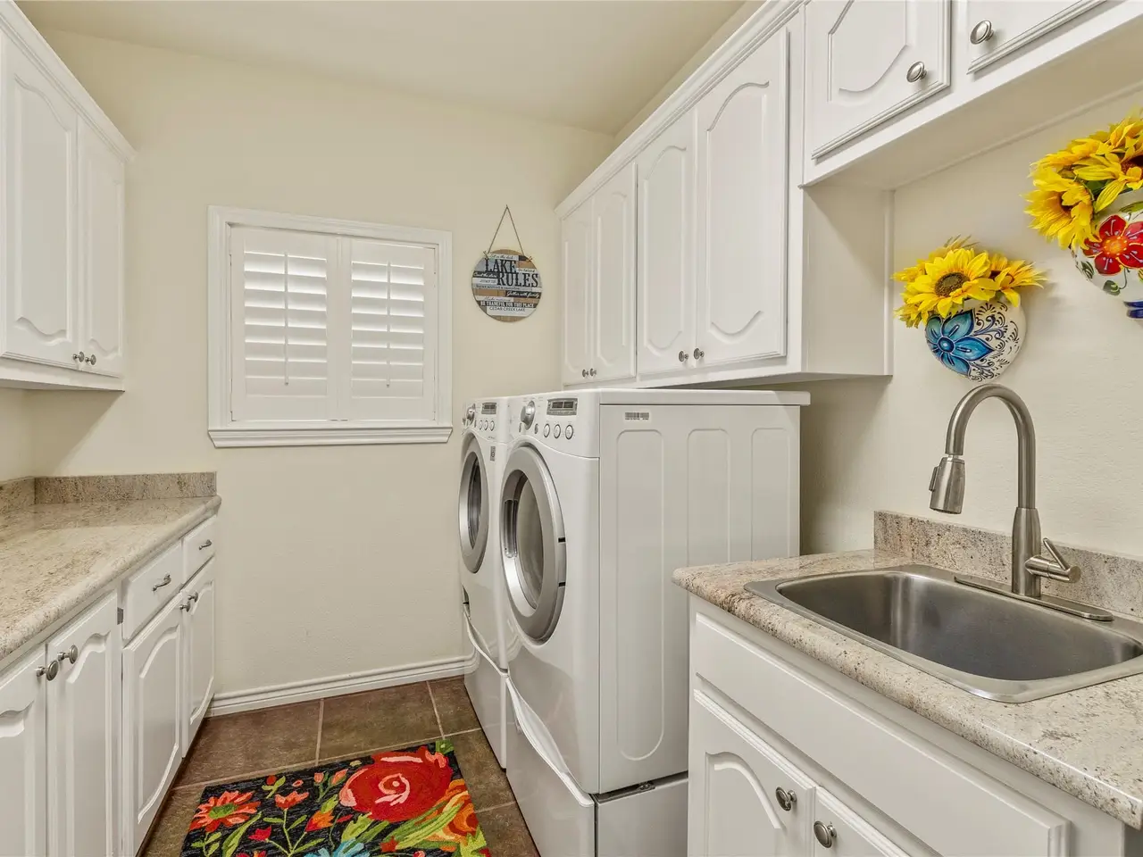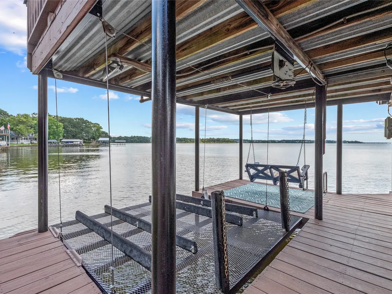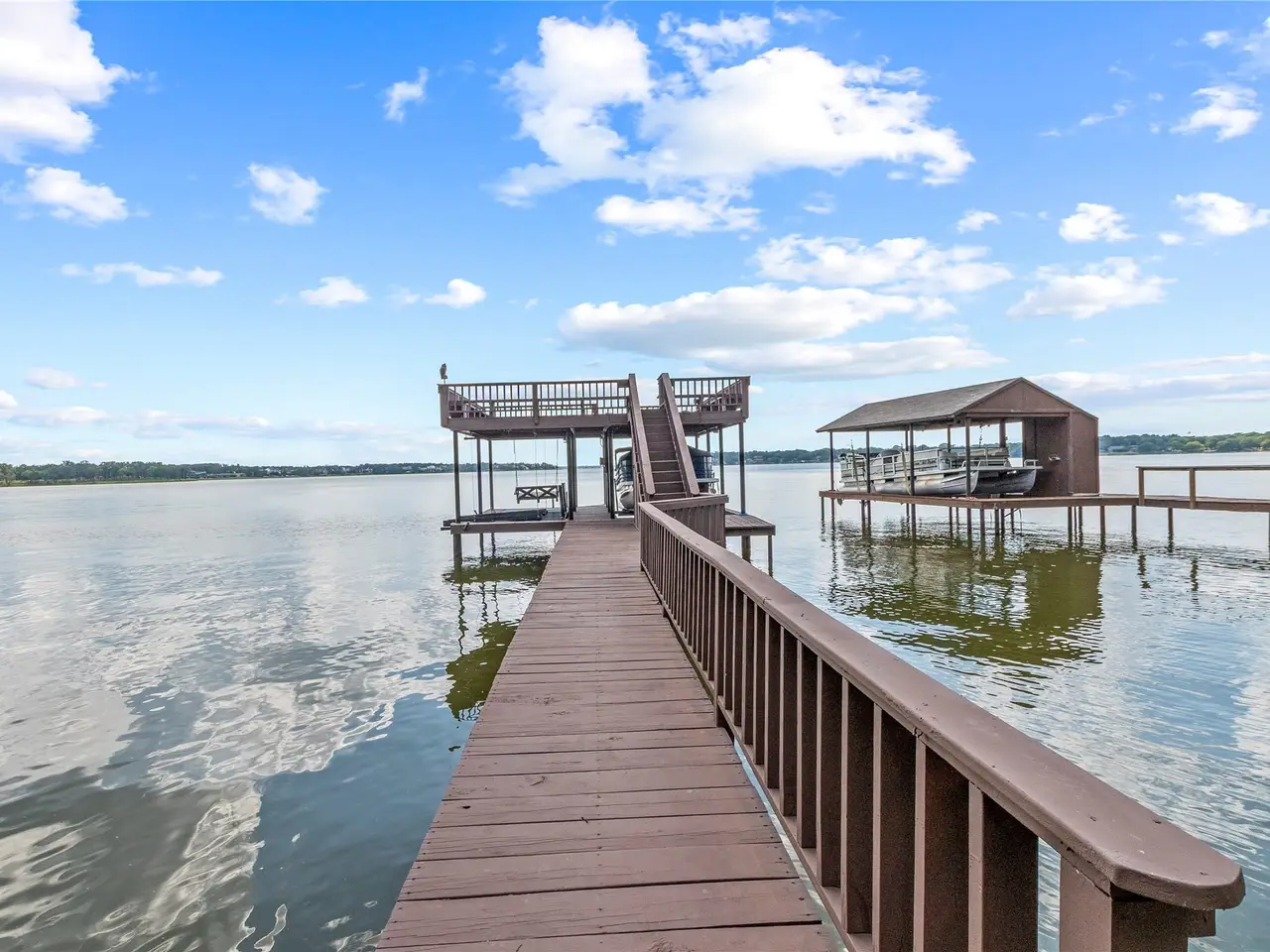 Experience the ultimate in lakefront living with this beautifully furnished open water home, set on four expansive lots totaling 0.54 acres with stunning water views on three sides. Surrounded by mature trees and outdoor spaces designed for relaxation and entertainment, the home features a deep water location, a covered composite deck, and a charming flagstone firepit area by the water. Inside, the open-concept living space includes two inviting living areas, a fireplace, and a spacious kitchen with granite countertops, bar seating, and a dining area that flows seamlessly into a wine and coffee bar with a wet barperfect for entertaining. The main-floor waterside master suite offers a vaulted shiplap ceiling, plantation shutters, private deck access, and a luxurious bath with a clawfoot tub, double-headed shower, and a massive walk-in closet with built-ins. Two additional ensuite bedrooms are located on the main level, while upstairs features a bonus room and two more ensuite bedrooms. The home also offers abundant storage, plantation shutters throughout, and thoughtful updates including a new 80-gallon water heater (2024), new downstairs HVAC (2024), a primary suite mini-split (2022), and a new irrigation control box for the lake pump system (2021). The oversized fenced side yard includes two storage sheds with electricity and space for boat or RV parking, a garden, or a play area. The boathouse is equipped with a party deck, boat slip, double jet ski slip with new cables (2022), and a shaded lounge area. A smaller uncovered composite deck is already wired for a hot tub. The two-car garage and additional powered sheds provide ample storage and utility. Furnishings, linens, and dishes are included with some exclusions, and watercraft are available separately, making this a truly turnkey waterfront retreat.