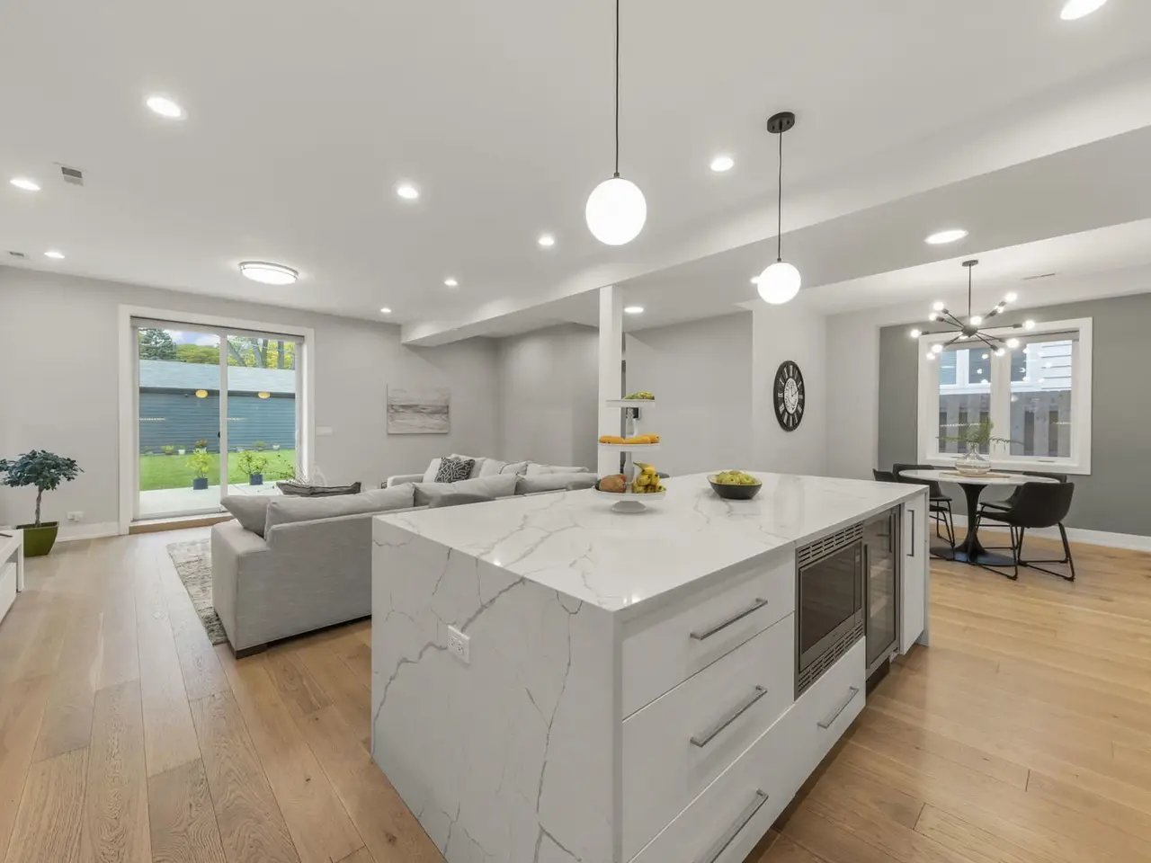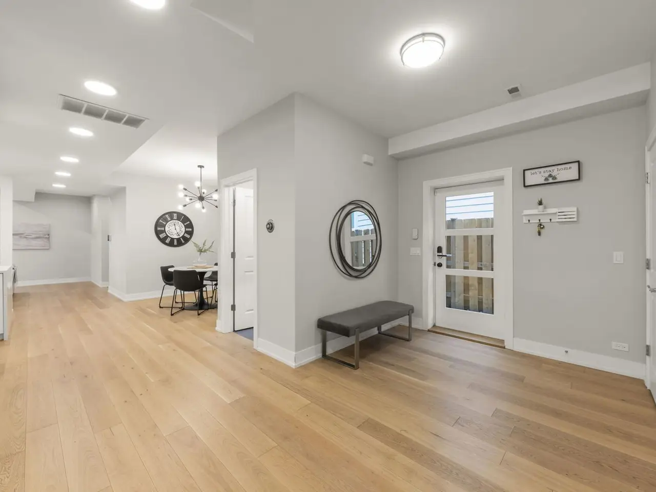 East-facing and beautifully designed, this exceptional home blends modern luxury with thoughtful functionality. Step inside to discover 6" wide hardwood plank flooring throughout and a stunning open-concept layout that flows effortlessly from the grand entryway to the expansive kitchen and family room. The chef's kitchen impresses with 42" cabinetry, a quartz waterfall island with open shelving, a wine fridge, overhead vent hood, and gently textured subway tile backsplash. A walk-in pantry and spacious dining area make entertaining easy. The living room, family room and optional office/craft/bedroom ALL feature flexible layouts. Sliding glass doors provide access to the covered AND uncovered patio areas, overlooking an expansive flat yard-perfect for a playset, garden, or future pool. The fully fenced yard includes two gates, concrete walkways, and garden bed. Upstairs, find five bedrooms including a versatile ensuite with dual closets AND the primary en-suite offering a large walk-in with California Closet storage plus an additional flex room ideal as a nursery, prayer room, or second closet. The upper-level laundry room features Samsung washer/dryer, utility sink, and ample cabinetry. Every detail has been thoughtfully chosen including elevated-Hunter Douglas shades (automatic on the main level), Andersen windows with deep 14" sills, Nest thermostat, Vivint security system, Navien tankless water heater, and dual Trane HVAC. The three-car garage offers custom shelving and a Tesla charger that stays. Situated walking distance to schools, near Devon Market and close to the beach, this home delivers convenience, comfort, and cutting-edge design.
