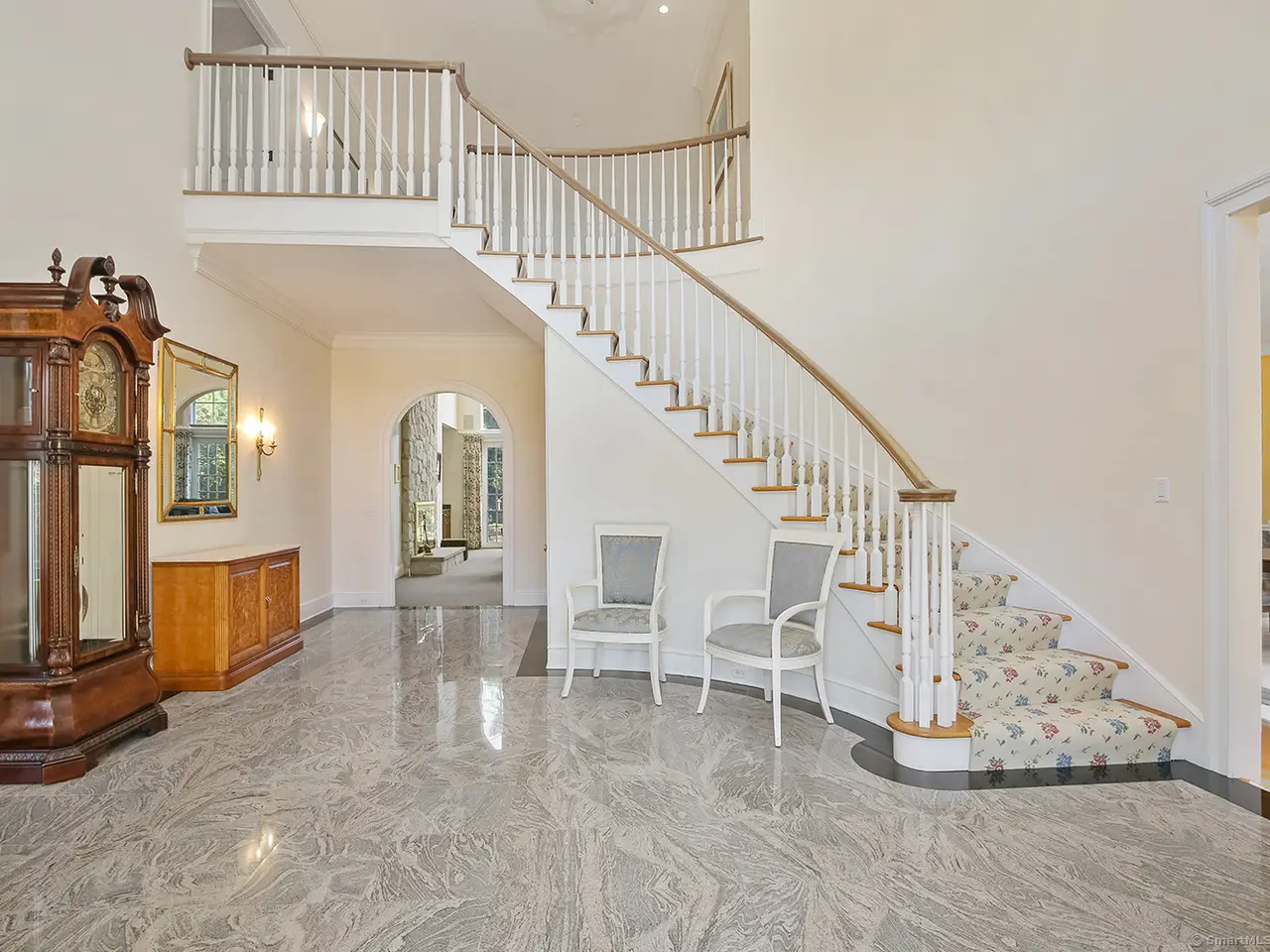 There are houses you tour, and then there are estates that capture your imagination. This extraordinary Greenfield Hill Colonial is the latter-a 9,700+ sq. ft. residence set on a pristine 2-acre corner lot in one of Fairfield's most prestigious neighborhoods. A paver-stone drive winds past manicured gardens to a grand two-story entry with a sweeping staircase, setting the tone for elegant living. Meticulously landscaped grounds, fountain, serene stone pathways, and a tranquil koi pond create a private oasis for quiet reflection or outdoor enjoyment. Inside, elegant formal living and dining rooms provide a perfect backdrop for entertaining, while the sun-filled family room, with vaulted ceilings, floor-to-ceiling windows, and a dramatic stone fireplace, serves as the heart of the home. The luxurious primary suite boasts tray ceilings, dual walk-ins, and a marble spa bath. Upstairs, five spacious bedrooms-many ensuite-welcome guests, and the third floor features a game and billiards lounge. A bespoke English pub, thoughtfully designed and versatile, can serve as a lounge, home office, entertainment room, or hobby space. Outdoors, a gated saltwater pool and hot tub with a fully equipped poolhouse create an inviting retreat for summer gatherings. This remarkable estate blends sophistication, comfort, and timeless appeal-a sanctuary for grand occasions and quiet moments alike.